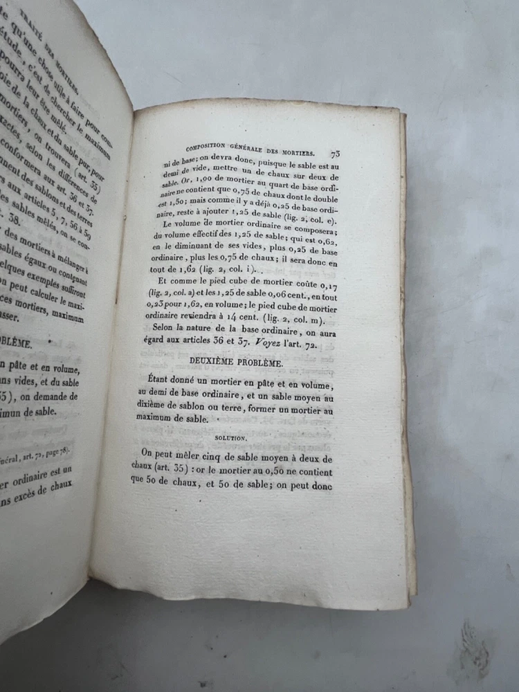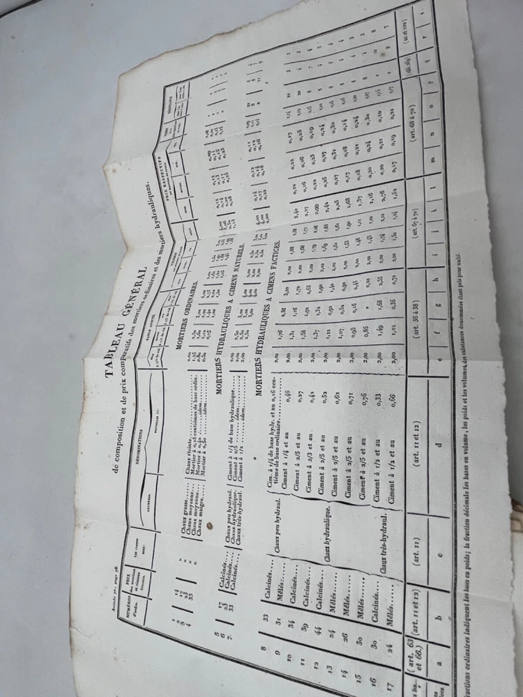 Traité sur l’art de faire de bons mortiers et d’en bien diriger l’emploi, ou Méthode générale pratique pour fabriquer en tous pays la chaux, les cimens et les mortiers les meilleurs et les plus économiques ; Par le Colonel Raucourt de Charleville, Deuxième Édition. Paris. Deuxième édition du Traité sur l’art de faire de bons mortiers de Raucourt de Charleville, publiée en 1828 à Paris chez Malher et Cie. Cet ouvrage technique offre une méthode générale et pratique pour la fabrication de chaux, ciments et mortiers, avec des recommandations pour obtenir des matériaux à la fois durables et économiques. L’auteur, ingénieur polytechnicien et membre distingué de sociétés savantes, met son expertise au service des bâtisseurs et ingénieurs du XIXe siècle, alors en pleine ère de modernisation des techniques de construction. Y11