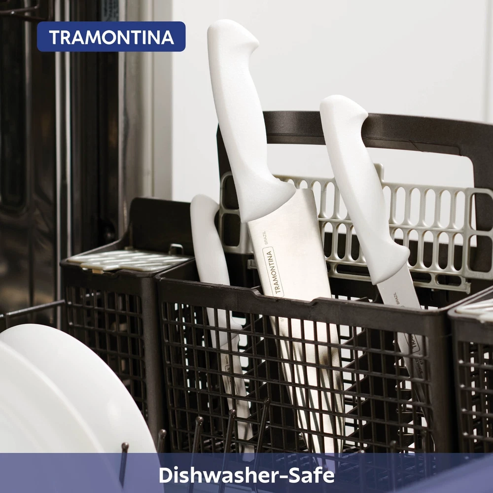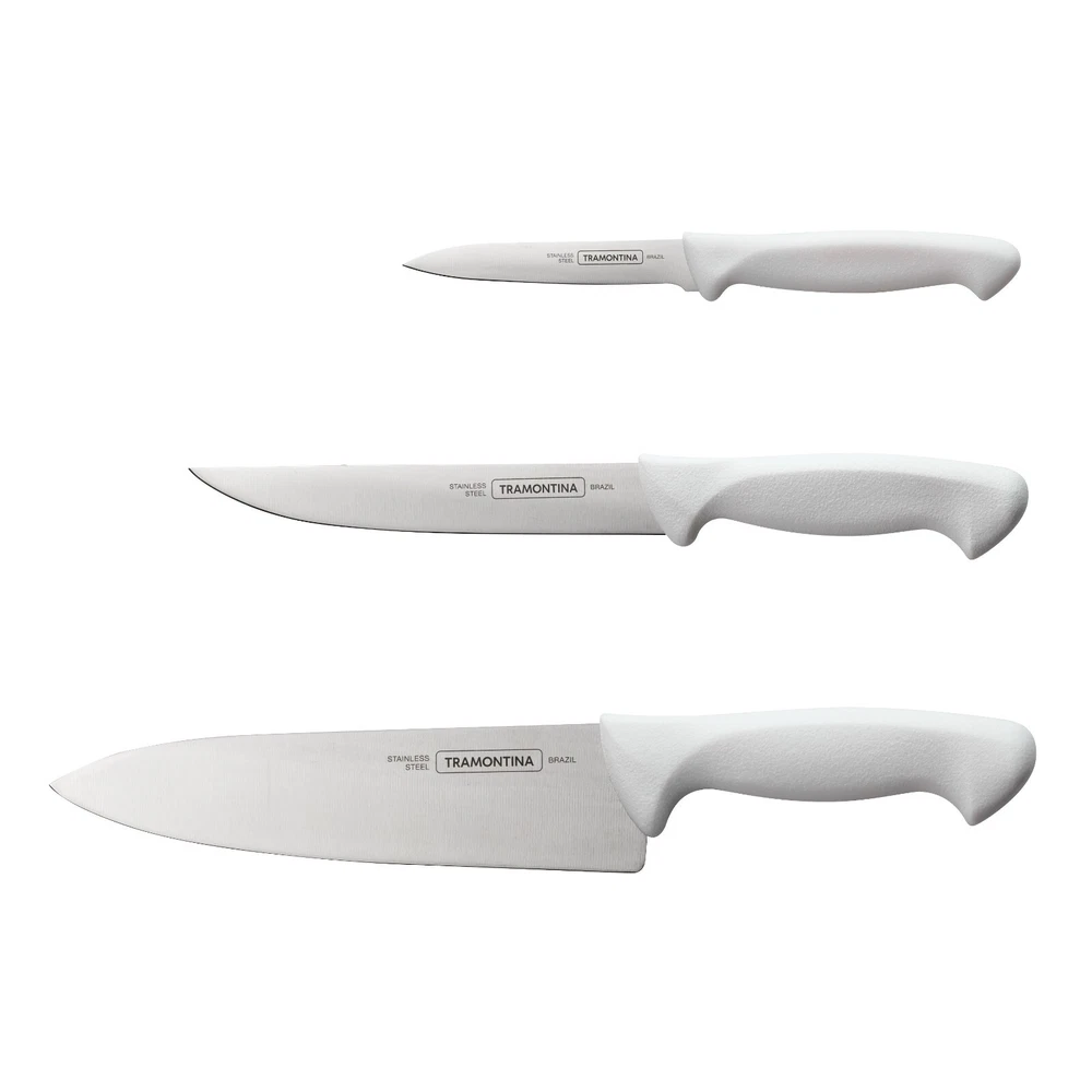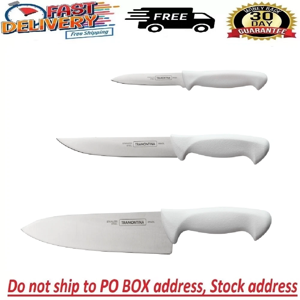 NOTE: WE don't send item to Stock address (address of other shipping company for send item to international buyer) and PO box address. All order use Stock address and PO box address will be cancel. Please don't make order. Thanks ! Tramontina Pro-Series 3 Piece Chefs Knife Set • - A great set for new cooks, home cooks, and professional cooks to complete your kitchen cutting, slicing, mincing, and dicing needs. • - Tramontina Pro-Series Collection • - Set includes: • - Dishwasher-safe • - 25 year Limited warranty • - 8 in Chef’s Knife • - Fully tapered, fully beveled fine-edged blades • - Slip-resistant, white, polypropylene handles • - 4 in Paring Knife • - Blades are constructed from high-carbon stainless steel with a satin finish • - 6 in Utility Knife • - Made in Brazil