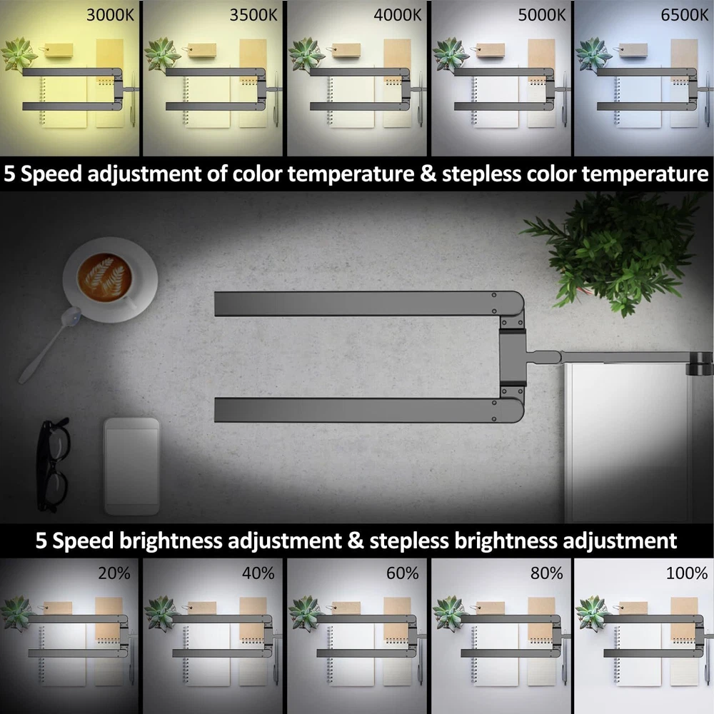Transformable LED Desk Lamp, 37.4" Architect Desk Light with Clamp, 3 Light Bars for Home Office, 24W Ultra Bright Auto Dimming 5 CCT Modes & 5 Brightness Levels Table Light for L Shaped Desk 【37.4" Lighting Bar | Wide lighting area】LED desk lamps for home office is extra wide and can extend up to 37.4 inches and light up a range of 90 inches, providing a perfect lighting solution for large workstations, L-shaped desks, and multi-monitor setups. With 1500 lm of brightness and maximum 23.7 inches working height, this desk lamp with clamp could bring you more light to see every detail of your daily work and study. 【7 Rotating Joints, 3 Light Bars | Flexible】This transformable swing arm desk lamp with clamp features 7 rotating joints and 3 super-bright light bars, you can easily position the light exactly you want, either to expand the lighting coverage or to create a super bright lighting area. The desk light is perfect for tasks such as reading, working, studying, drawing, painting, crafting and other design or DIY. 【45°Angled Away Asymmetric Light, CRI>90 | Eye Protection】 The Architect light adopts 45° angled away LEDs and side lighting design, it only illuminates your desk and keyboard rather than your screens and eyes. Also, the lamp provides high color rendering index LEDs(CRI>90) to generate soft flicker-free and anti-glare light and accurately render colors, close to the natural light and less blue light hazard. These eye-friendly technology will protect your eyes from strain and fatigue. 【Ambient Lighting, Memory Function| Smart】Our desk light features a built-in smart light sensor that detects ambient light in the room and automatically adjusts the brightness to a comfortable level. The memory function can restore to the last setting which ensures its compatibility with wall switch and smart plug. 【Multiple Lighting Combinations】office desk lamp provides a wide range of brightness adjustment, including multiple color settings across a white-and-yellow spectrum. You can click the touch panel to adjust the 5 levels of brightness and color temperatures step by step, or you can long press the panel for stepless dimming (20% - 100%) and stepless tempering (3000K - 6500K).