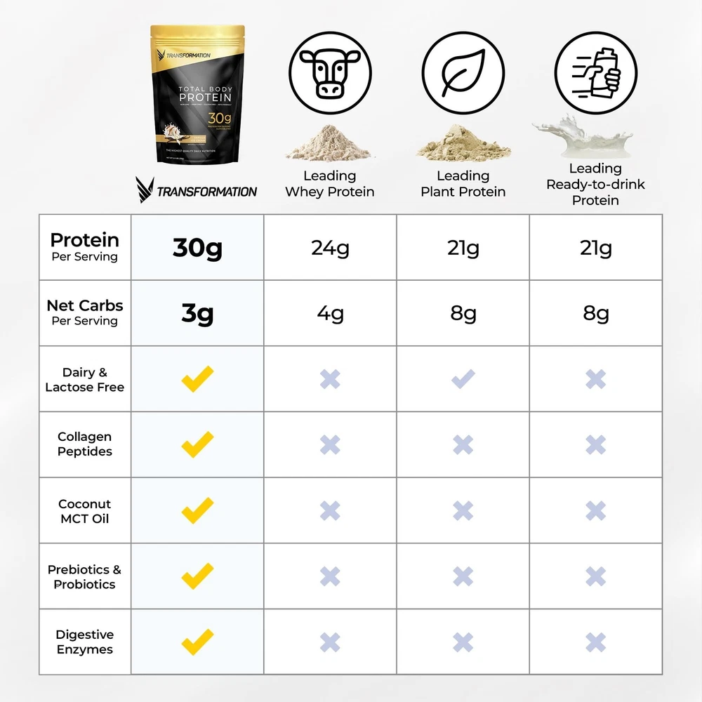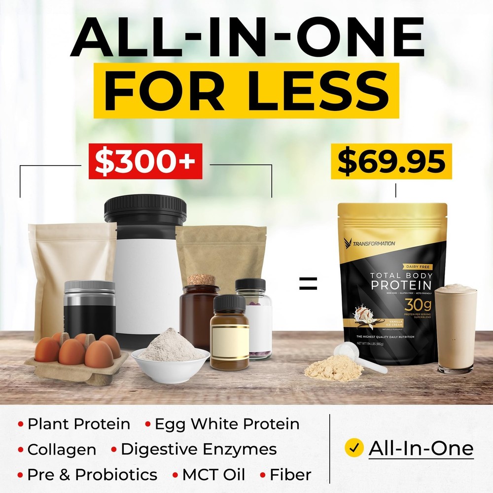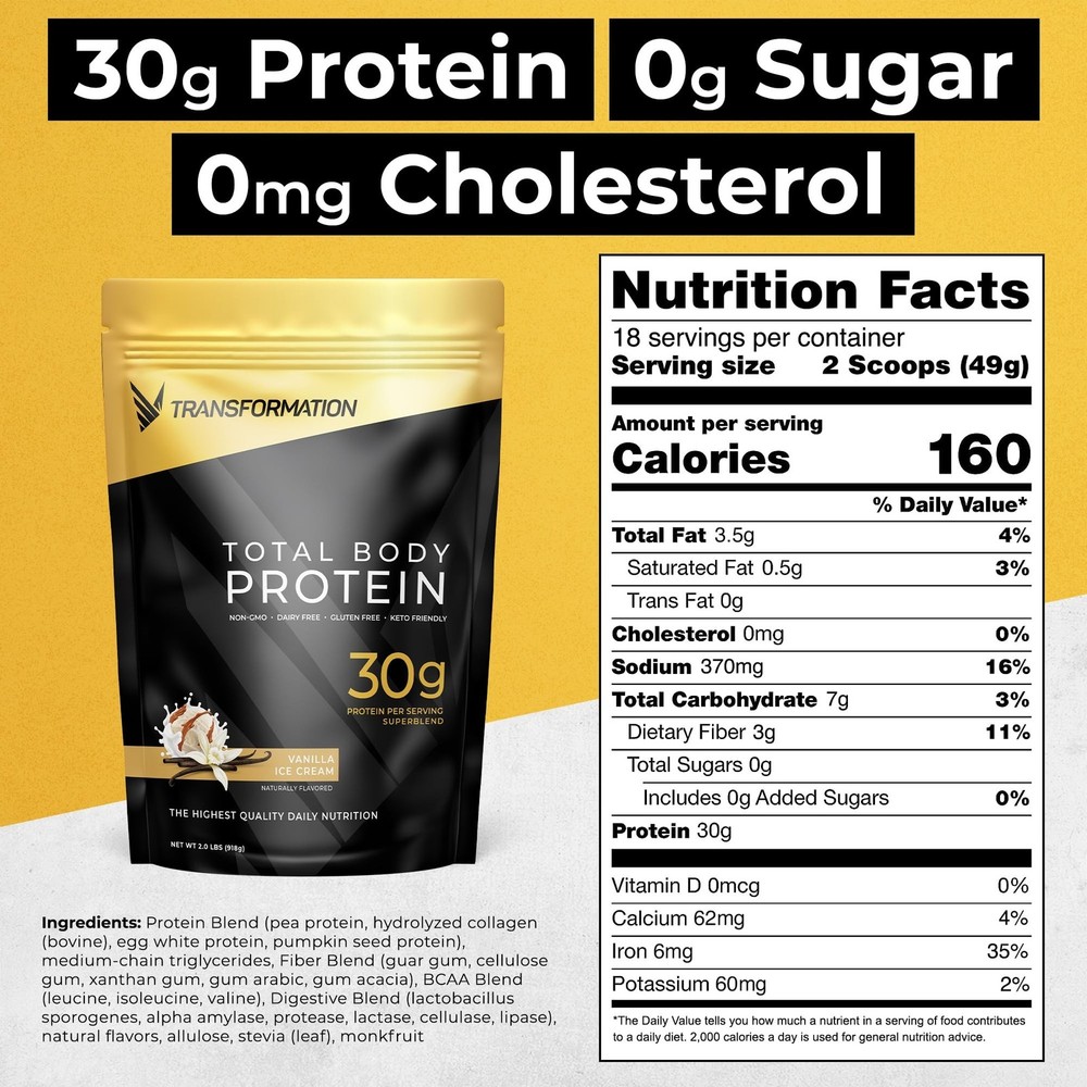 Transformation Protein Super Blend | Egg White, Collagen Peptides, and Plant Protein | 15 Billion CFU Probiotics | Digestive Enzymes | MCT Oil | BCAAs | Low Carb Shake for Men & Women | Vanilla Product Details Flavor Name: Vanilla Ice Cream Size: 2.3 Pound (Pack of 1) Brand: SPR BODY MPN: TP- UPC: 856719006297 EAN: 0856719006297 Brand: SPR BODY Flavor: Vanilla Ice Cream Item Weight: 2.3 Pounds Material Type Free: Grain Free, Dairy Free, Cholesterol Free, Soy Free, Sugar Free Unit Count: 36.83 Ounce Product Dimensions ‏ : ‎ 11 x 9 x 1 inches; 2.3 Pounds Date First Available ‏ : ‎ March 21, 2019 Manufacturer ‏ : ‎ SPR Body Best Sellers Rank: #25,179 in Health & Household (See Top 100 in Health & Household) #84 in Sports Nutrition Protein Powder Blends #84 in Sports Nutrition Protein Powder Blends Customer Reviews: 4.2 4.2 out of 5 stars 1,146 ratings BUILD LEAN MUSCLE: Introducing a Revolutionary New Protein Formula that promotes muscle, gut and brain health. Protein powder totally reinvented. Contains 30 GRAMS OF PROTEIN PER SERVING paired with 3g of the most important muscle-building amino acid, L-leucine. The optimal nutrients in optimal amounts to build lean muscle mass. AMINO OPTIMIZED: Protein is comprised of 9 ESSENTIAL AMINO ACIDS (3 BCAAs and 6 EAAs) that must be present in the right amount and ratio of each serving for optimal body composition. Transformation Protein powder has the ultimate blend of collagen, egg, and plant proteins to achieve the ideal amino acid profile, in amount and ratio, to help you build muscle quicker and recover faster. MCT OIL + COLLAGEN: Fuel the body and the mind. Medium Chain Triglycerides provide faster fat-burning and increased energy helping you to stay focused and get the most out of your workouts. Grass-fed, pasture-raised collagen support bone and joint health to help your body to recover faster. ABSORB MORE PROTEIN: Enriched with digestive enzymes and probiotics to enhance digestion and absorption of your protein. With 15 billion CFUs of bacillus coagulans, a probiotic that uniquely survives the harsh acidity of the stomach, enabling it to optimize the healthy bacteria effect in the GI tract and enhancing the absorption of protein. PURE & CLEAN: No whey, No soy, No dairy, No Lactose, and No gluten. Our easy to mix, luxury protein blend is made with the highest quality ingredients.