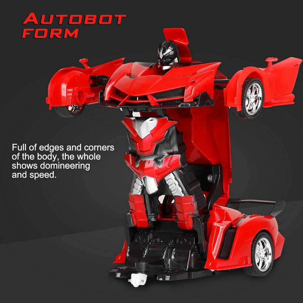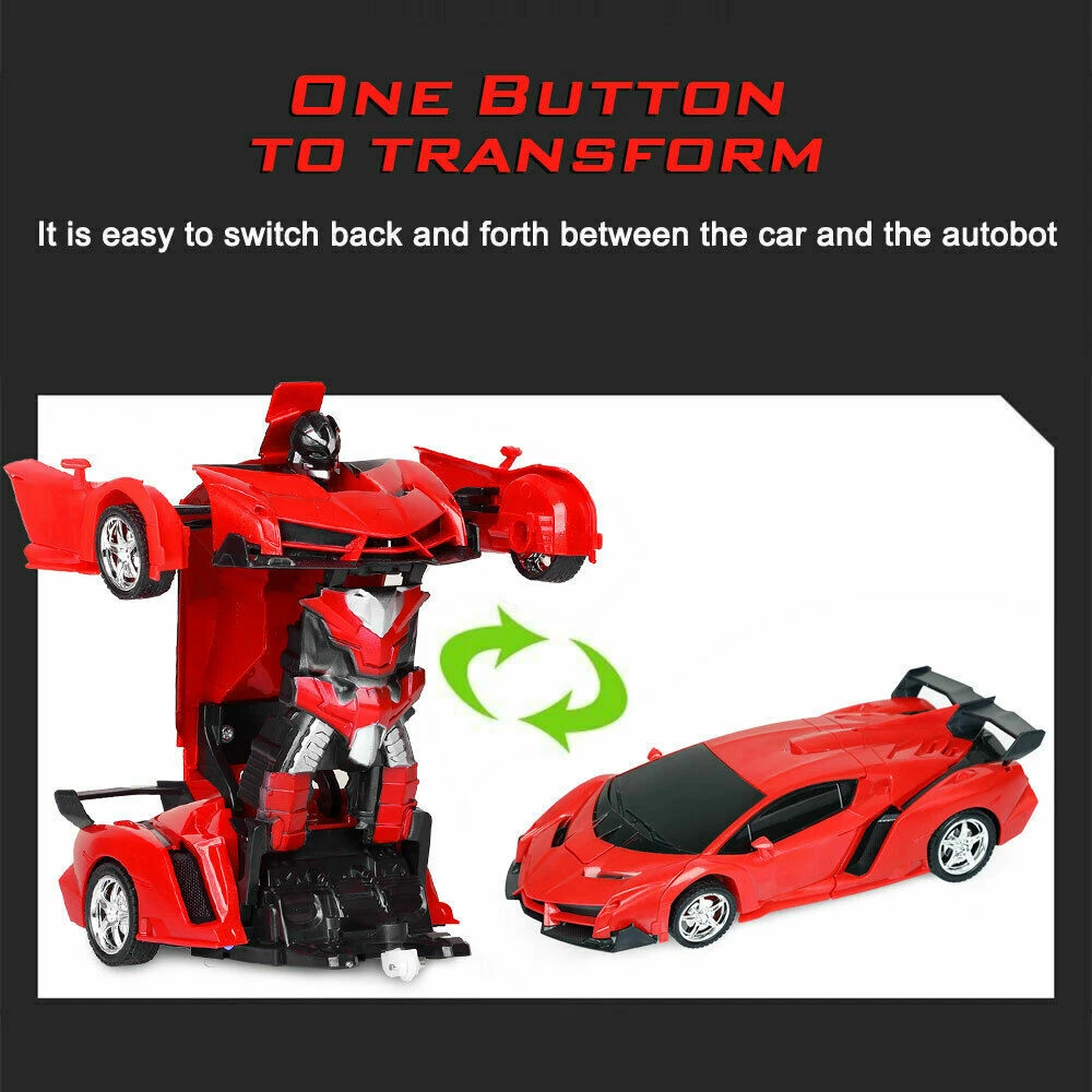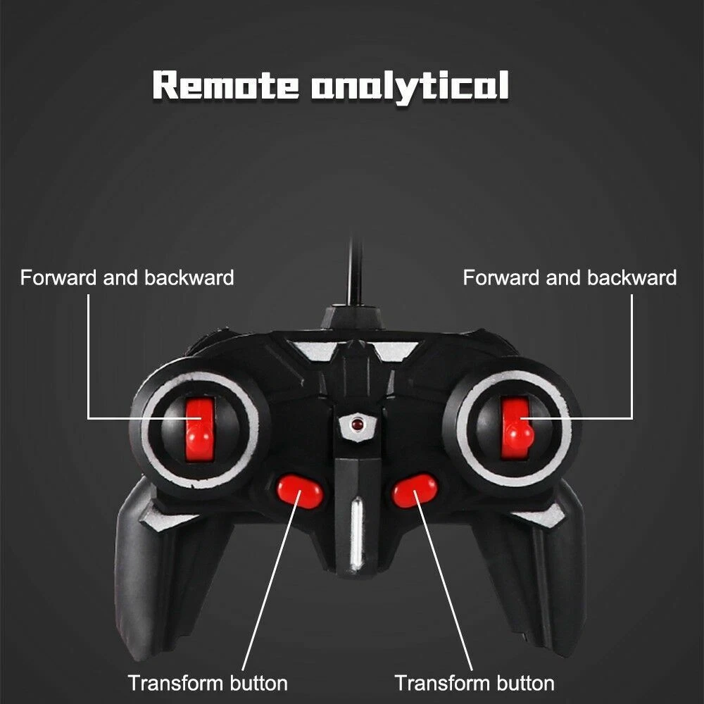 Product Description PRODUCT DETAILS: This brand new interactive RC transformer robot. The robot is designed with an ABS plastic frame. Shape-shift model car can switch from being a red sports car to robot by a push of a button. The features include exciting engine/acceleration sounds, lights, and interactive phrases. An included 2.4 Ghz controller has toggles for forward/reverse, left/right, vehicle mode, and robot mode. Purchase a fun gift for any child ages 5 and up with the Best Choice Products Interactive Remote Control Transformer Robot. FEATURES: Shape-shift RC transformer robot can switch from being a red sports car to a robot! Interactive robot car includes exciting engine/acceleration sounds, lights, and interactive phrases 2.4 Ghz controller has toggles for forward/reverse, left/right, vehicle mode, and robot mode Both car and robot mode features a 360 degree speed drifting action Fun gift for children ages 5 and up; Dimension: 7"(L) x 8"(W) x 10.5"(H) SPECIFICATIONS: Features: Remote Control Type: Car; Age Range: 12-15 Years,5-7 Years,> 8 years old,> 6 years old,> 14 years old,Grownups,8-11 Years; Controller Mode: MODE1,MODE2; Scale: 1:18; Torque: 0.3M; Model Number:RC Car; Design: Cars; Warning: keep away form fire; Remote Distance: 5-10m; Control Channels: 2 Channels; Dimensions: 23X9.5X5.5CM; Material: Plastic; Remote Control: Yes; Shock Resistant: Kids Toy; Anti-skid: RC Robots; Sports Car: Birthday Gifts; Remote Control Robot: Remote Control Robot; Remote Control Car: Transformation Car; Features: Shock Resistant, Model, Flashing; The antenna is bendable. How to Play 1.Move Forward The left and right controllers are pushed up at the same time. 2.Turn arround Keep the one controllers pushed up, and the other controller pull down, 3.Back The left and right controllers are pushed down at the same time. 4.Deformation Long press the middle button Package include: 1 x Car ( Without Battery) 1 x Remote Control 1 x USB Charger