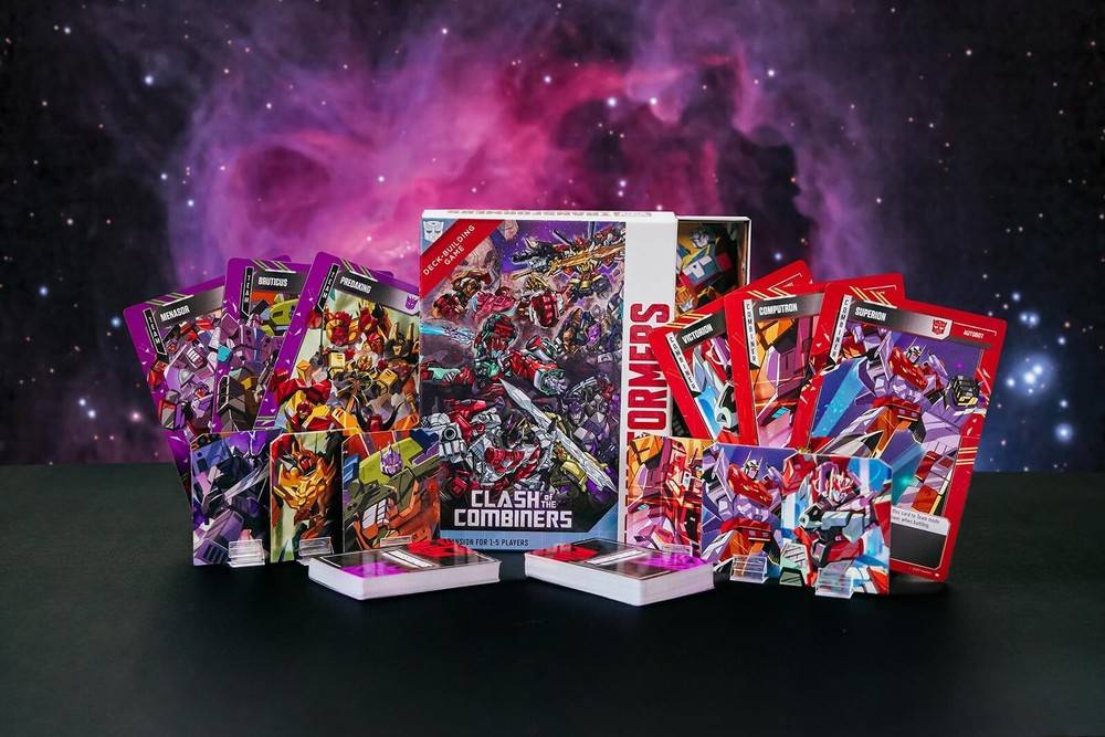 As the war between Autobots and Decepticons rages, a new force has emerged to bring the conflict to a scale of gigantic proportions. Combiners - colossal warriors created from a merging of multiple robots - have taken to the field of battle and now you can bring their titanic might under your control! This expansion pack features over seventy five new cards. Six new Combiners on giant -sized cards! A deck building game that is perfect for ages 14 and up, 1-5 players, and 45-90 minutes of fun. With the wara between Autobots and Deceptions takes place the conflict is emerged in gigantic proportions. Over 75 new cards! . Six new Combiners on GIANT-sized cards!. A new force has emerged to bring the conflict to a scale of gigantic proportions. Combiners - have taken to the field of battle and now you can bring their titanic might under your control! Perfect for ages 14 and up, 1-5 players, and 45-90 minutes of fun!