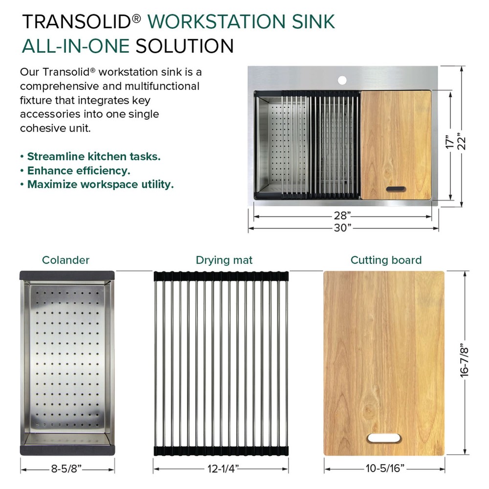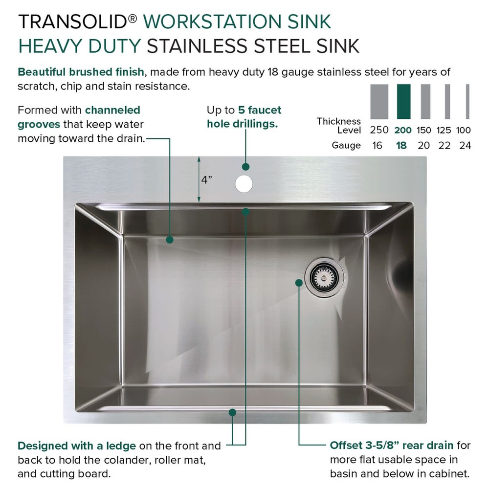 Powered by Frooition All Categories Transolid KWSST302210-MR2 30" Drop In Single Basin Stainless Steel Kitchen Sink with Basin Rack, Basket Strainer, Colander and Cutting Board Overview Item Description Transolid KWSST302210-MR2 Features: Covered under Transolid's limited lifetime warranty Constructed from 18 gauge stainless steel Drop in installation - sink will drop into a cutout in the countertop Single basin design for maximum work space Sound absorbent construction to prevent dish clatter and under cabinet condensation Sink comes pre-drilled with 2 faucet holes for faucets with 4-1/2" faucet centers Rear drain location increases available space under the sink Coordinates with products from the Workstation line All mounting hardware required for assembly is included Transolid KWSST302210-MR2 Specifications: Sink Length: 30" (left to right) Sink Width: 22" (front to back) Sink Height: 10" (top to bottom) Faucet Holes: 2 Faucet Hole Size: 2-1/2" Faucet Centers: 4-1/2" (distance between the installation holes for the faucet handles) Minimum Cabinet Size: 33" Drain Connection: 3-1/2" Why Choose BuildInc? OUR PROMISE TO YOU About Us At Build, we promise to provide the best selection we can, most competitive pricing, and unmatched customer service. Our store has quality home improvement products from trusted manufacturers like Moen, American Standard, Delta, Kraus, Kichler, Progress Lighting, Schlage, Kwikset, Baldwin, Broan, NuTone, Air King, and Rev-A-Shelf. With over 200,000 home improvement products for you to choose from, we have just what you need to get your project done. Fast & Free Shipping We promise to make it our priority to get you your items as fast as we can. We ship from 440 warehouses around the country, ensuring that your product will get to you as soon as possible. We know you're eager to get your hands on your new purchase, we would be too. As a bonus, most items ship for free. Returns We are happy to accept returns of unused or defective items for a refund within 30 days from the date of delivery. For returns outside 30 days, please contact our Customer Service team to go over our options. For full details, please view the Shipping and Payments tab above. To initiate a return simply go to the eBay Returns Portal and submit a return request. We ask that all items be returned with all original components via a traceable method. Once your return is received and processed, we will quickly get your refund or replacement issued. If for any reason you are unsatisfied with your purchase or for product or warranty questions, please contact Customer Service team for assistance. More Items! View more great items! About Us | Shipping | Returns | Contact Us | FAQ | Collections | Special Offers! Powered by Frooition Frooition Frooition | No-js Template | eBay design, eBay store design, eBay shop design, eBay template design, eBay listing design (ver:froo_no_js) This listing is currently undergoing maintenance, we apologize for any inconvenience caused.