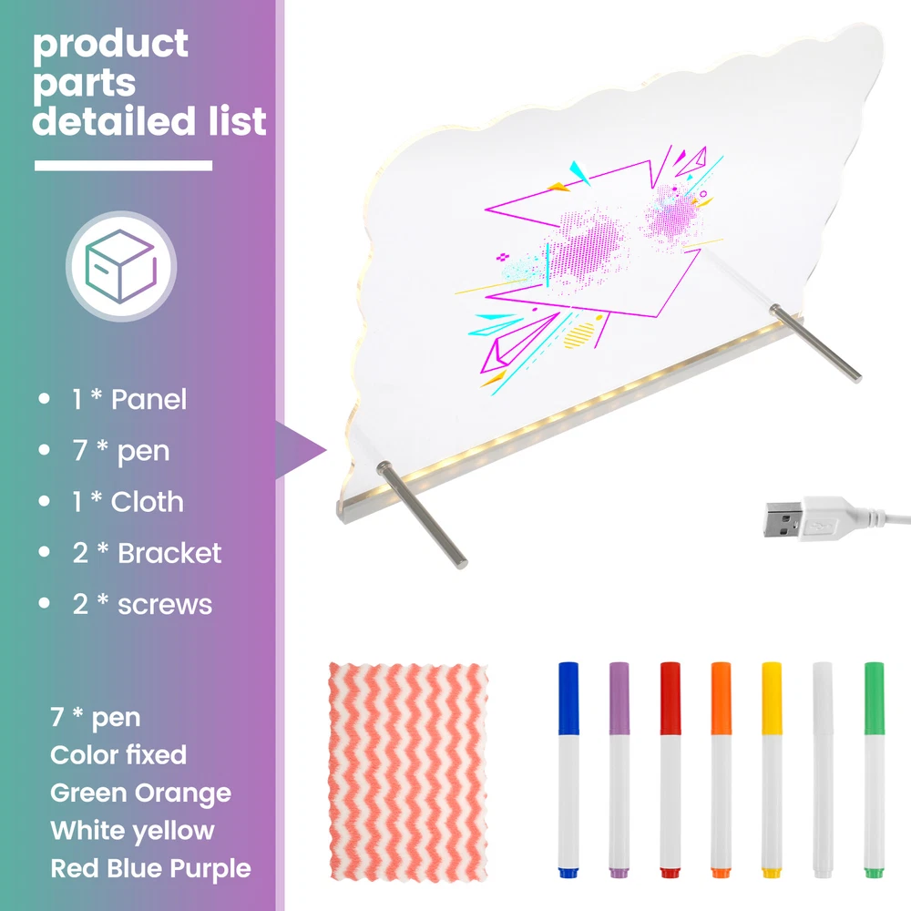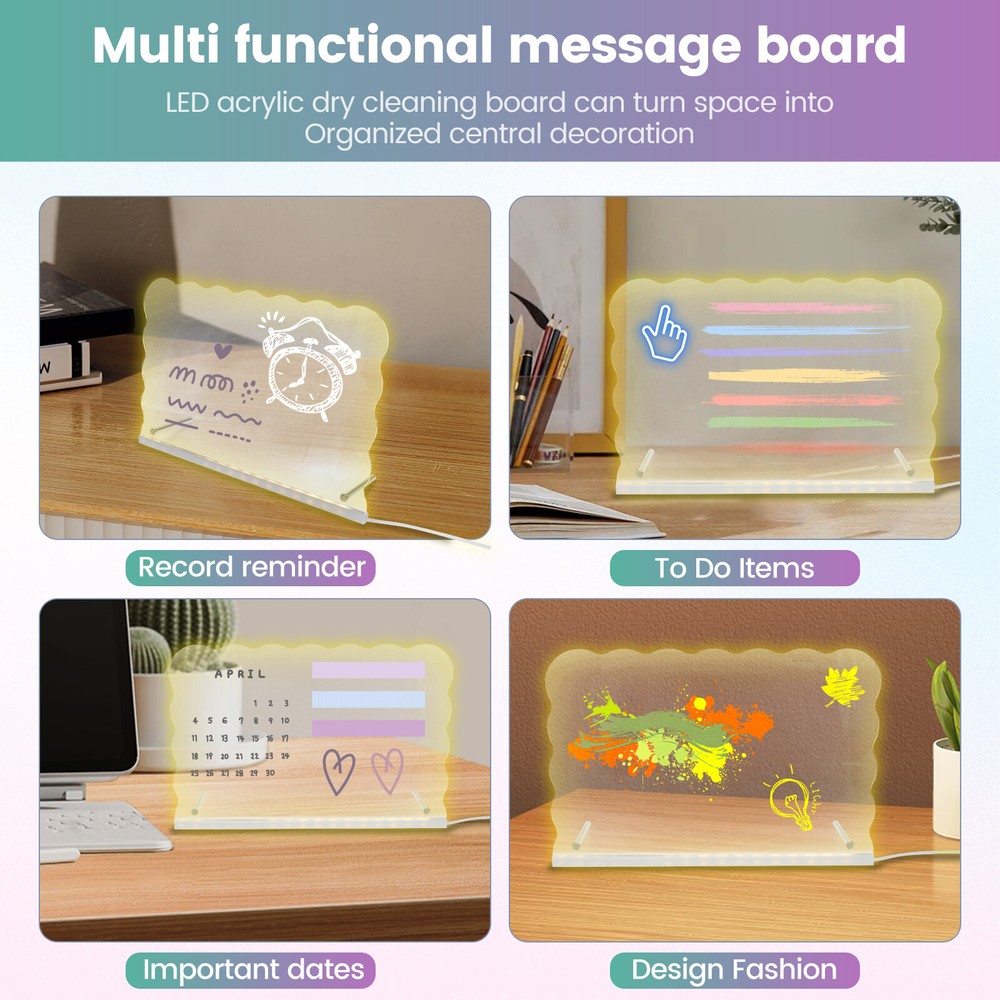 Parts List: 1 × Panel (connect USB cable) 7 × Pen (colour fixed green orange white yellow red blove purple) 1 × Wiping Cloth 2 × Thin Stick Holder 2 × Screw Highlight description: Versatile Message Board: LED acrylic dry erase board can turn a space into an orderly centrepiece. It can record reminders, to do lists, important dates, with reusable features and stylish design, it can better meet the daily record and decorative needs Easy to Use: The LED acrylic dry erase board has a clear, spacious surface for planning schedules and recording inspiration. With bright LED lights and a smooth writing surface, it helps users plan and organize their schedules to help them achieve their goals Accessory List: The acrylic board comes with a removable stand, 7 colours of pens and a dry erase cloth, all of which combine to provide users with the convenience they need for everyday writing and wiping Multi Purpose: The LED acrylic dry erase board can be used for various purposes, like coffee shop menu boards, household chore charts, etc., covering vision, doodling, drawing, planning, note taking and calendars, etc., which can meet the needs of different scenarios Suitable Gifts: LED acrylic dry erase board as a gift is quite distinctive and practical, suitable for birthdays, anniversaries, housewarming and other occasions, its design is elegant and generous, practical and convenient functions, can meet a variety of use requirements Detailed description: Description: When it's time to change the content, simply wipe gently with a dry cloth or paper towel, etc. to quickly and cleanly remove text and graphics from the board, making it easy to do new writing and drawing Key Feature: Acrylic fluorescent boards are lighter in weight and thinner in thickness, easy to carry and install, and can be moved at any time according to the need to move the position or change the display location Specification: Size: 30 × 20cm Texture: Acrylic Note: 1.There may be slight differences between the picture and the actual color of the commodity. We will try our best to show you the exact color. 2.Please allow slight dimension difference due to manual measurement.