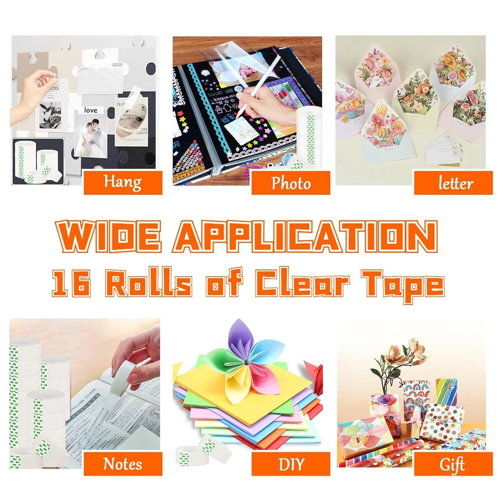 Transparent Tape Refills, 3/4-Inch x 1000 inch Clear Tape, 1 Product Details Package Dimensions : 5.98 x 4.02 x 2.05 inches; 12.31 ounces Manufacturer : KUKEO Brand: KUKEO Color: Transparent Number of Items: 16 Recommended Uses For Product: Packaging Special Feature: Transparent Long-Lasting Tape Refills: These transparent tape rolls measure 3/4-inch wide and 1000 inches long, providing ample length for various applications. Versatile Usage: Ideal for gift wrapping, office supplies, craft projects, and general household needs, these clear tape refills offer reliable adhesion. Easy Dispensing: With a 1-inch core, these tape rolls can be easily loaded into standard desktop tape dispensers for convenient use. Transparent Design: The clear tape allows for a neat and discreet appearance when applied to packages, documents, or crafts.Essential for holidays like Halloween, Thanksgiving, Christmas, and everyday use. Reliable Quality: Crafted from durable materials, these tape refills ensure consistent performance and long-lasting use.