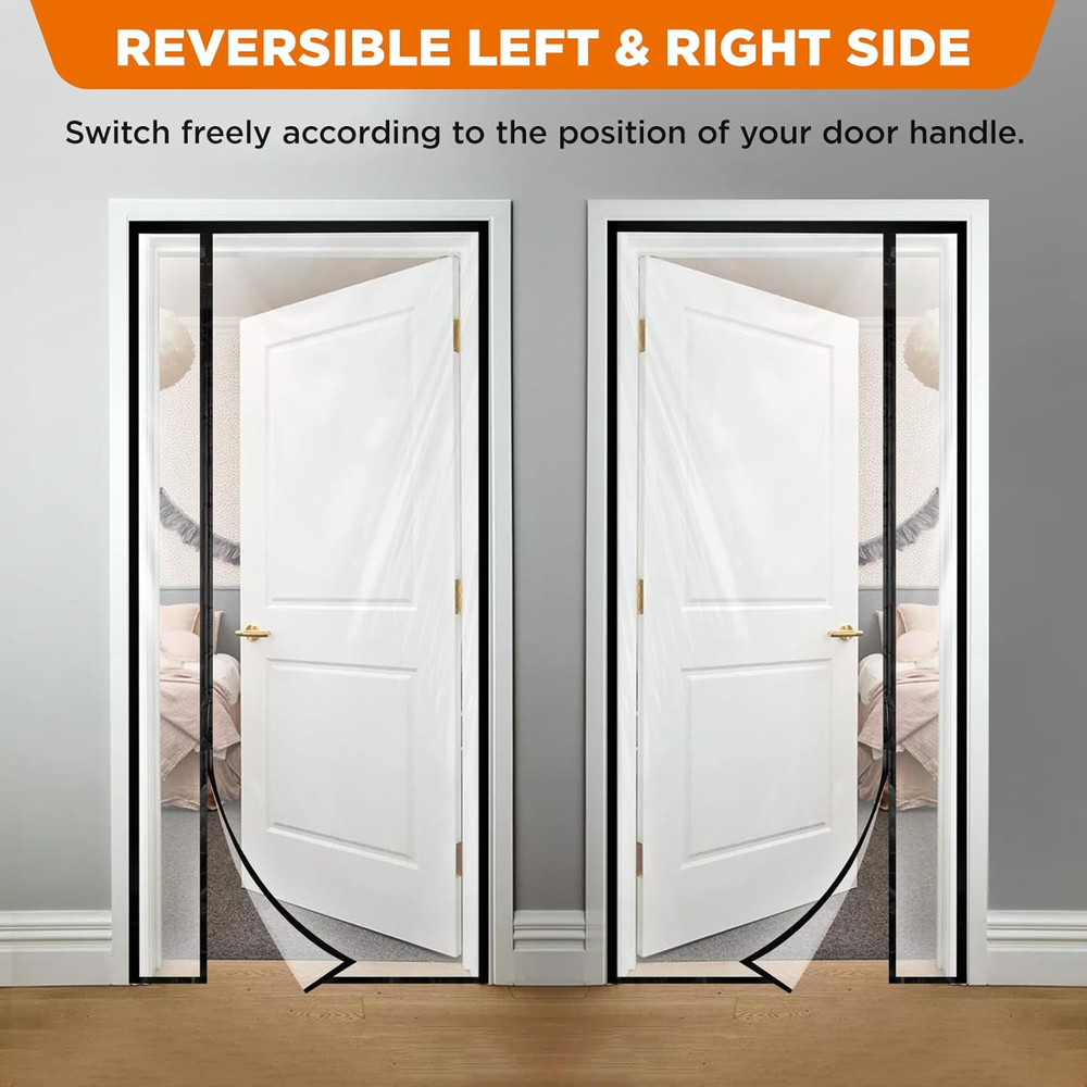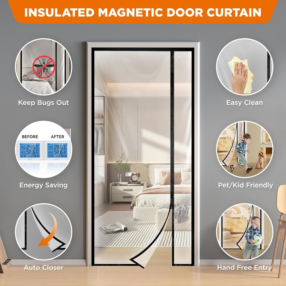 【Insulated Door Curtain Size】This magnetic thermal insulated curtain size: 37.4"x83",Fits door size up to: 36" x 82", which is widely used for Front back doors, kitchen, air-conditioned room. Please measure twice your door size before placing order. The doorway curtain is a good companion for air-conditioned rooms, which can prevent warm air loss in winter and keep the cold wind from entering,stop the cold air-conditioning escaping of your room in summer and keep hot air out, which saves energy and cut home heating costs effectively,make you enjoy a warm winter or a cool summer! 【Left Right Side Opening】This magnetic screen door is a universal side opening design,in order to catch the door handle easily. hook tape can be attached to the both side of soft plush eges of Insulated Door Curtain,reversible left or right opening according to the position of your door handle. 【EVA Eco-Friendly Material】Our magnetic self-closing door curtain is made of 0.15mm thickness environmental protection EVA material which is soft, durable,non-odorous and easy to clean. To keep the heat of the room in winter and cold air in summer. 【Easy to Install】This magnetic screen door package included a roll of magic tape, a pack of push pins, and an instruction manual.The doorway door curtain is easy to install. simply peel the adhesive backing off, apply it to the dry door frame. the push pins ensure the screen door is installed more stable. 【Hands Free Design】The screen door with automatic magnets closure is easy to open or close whether your hands full,because the Insulated Door Curtain is embedded with more powerful magnets. 【Kid & Pet Friendly】Our Insulated Door Curtain is embedded with powerful magnets,kids and pets can go in and out of doors with hands free. 【Quality Guaranty】If there is any quality issue for this magnetic insulated door curtain or you are not happy with your purchase, please do not hesitate to . We will do our best to help you. Product Description Our transparent reversible left or right side opening insulated door curtain is made of EVA insulated materia.It can maintain the room temperature indoor in winter,and it can also keep the cold air-condition wind indoor in summer.The thermal insulated curtain with automatic magnets closure is easy to open or close,so the kids and pets can go in and out easily. The thermal insulated door curtain is embedded with more powerful magnets,even if your hands are full,you can pass through with hands free,the door curtain is easy to close seamlessly. Our magnetic screen door is embedded with powerful magnets,you don't have to open or close the door,your kids and pets can go in and out of the door with hands free. The Insulated Door Curtain is made of transparent EVA Insulated material.It can maintain the temperature indoor in winter,and it can also keep the cold air-condition wind indoor in summer. Specifications: Product Name: Transparent Reversible Left or Right Side Opening Insulated Door Curtain Screen Size: 37.4"x83" ; Fit Door Size: Up To 36" x 82" ; Color: Transparent ; Material: EVA Material . Package Include: A Thernal Insulated Door Curtain ; A roll of Magic Tape ; A pack of push pins .