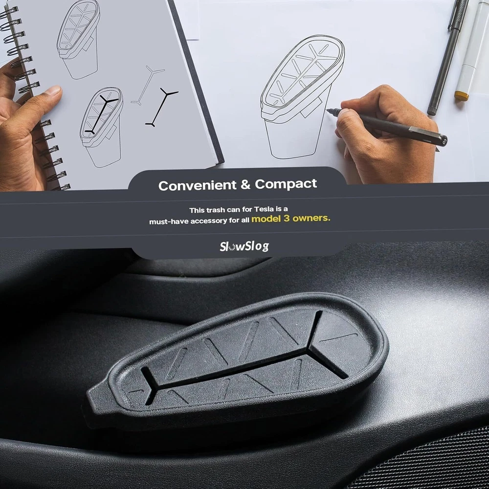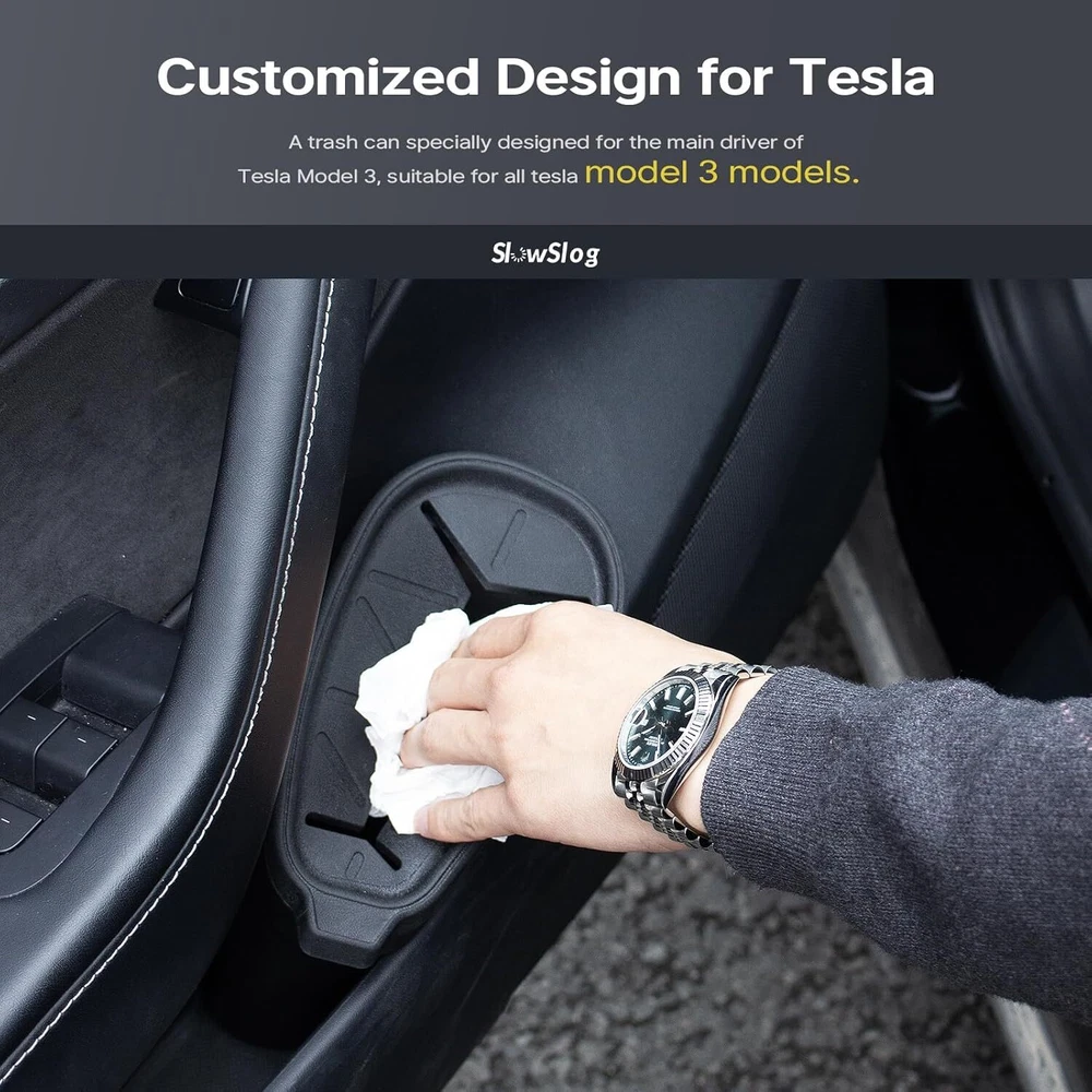 Trash Can for Tesla, Garbage Tesla Model 3 2017-2023, Car Black Product Details Product Dimensions : 7.5 x 4.1 x 8.5 inches; 3.52 ounces Item model number : SMGTRCAN Manufacturer : Slow Slog Country of Origin : China Brand: Slow Slog Capacity: 800 Milliliters Color: Black Opening Mechanism: Open-Top Material: Plastic Recommended Uses For Product: Driver side door pocket Room Type: Tesla Model 3 2017-2023 Special Feature: Leakproof Shape: Cylindrical Item Weight: 3.52 Ounces Customized Design for Tesla:A trash can specially designed for the main driver of Tesla Model 3 (Not Compatible with Model 3 Highland 2024). The profile of the model 3 trash can for tesla fits well into the left door, keeping it from shaking when the car is moving. Quality Material & Durable:This trash can for car is made of PC+TPE material, high strength, strong durability. The cover is made of quality TPE material and has a Y-shaped design to prevent garbage from overflowing when braking. Washable & Easy to Clean:The whole model 3 trash bin for tesla can be washed in water and dried with a towel. The car trash can can directly collect small garbage, such as receipts, gum wrapped in napkins, save the use of garbage bags, to make efforts for environmental protection. Unique & Stylish Design:The design of this car garbage can is elegant and stylish, which will blend well with the style of your car interior, and this car garbage can for Tesla Model 3 is a must-have accessory for all model 3 owners. Efficient Customer Service:We pack our model 3 trash can for tesla well to prevent it from being damaged in transit, our friendly and knowledgeable customer support team will provide assistance instantly.