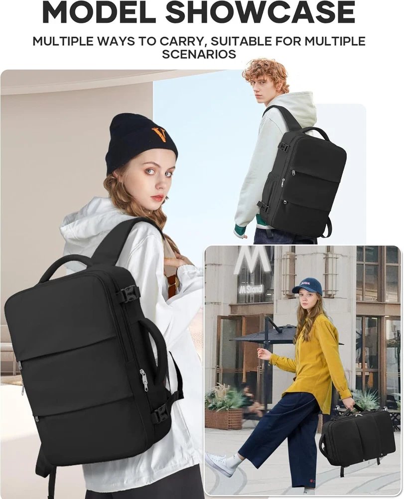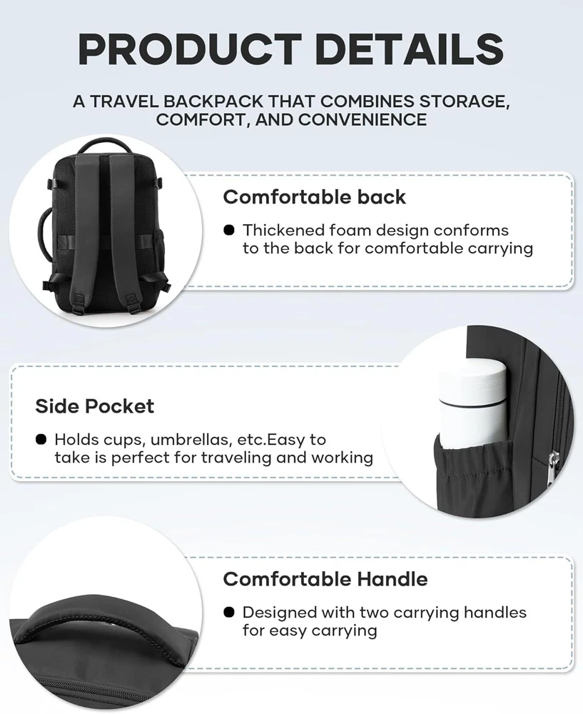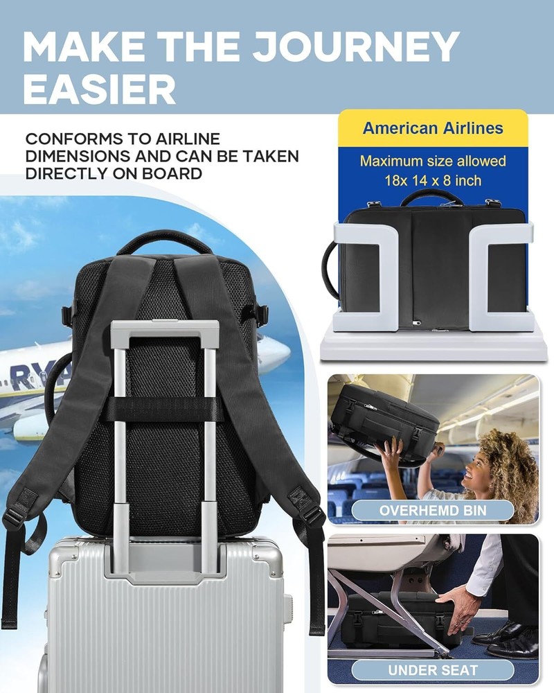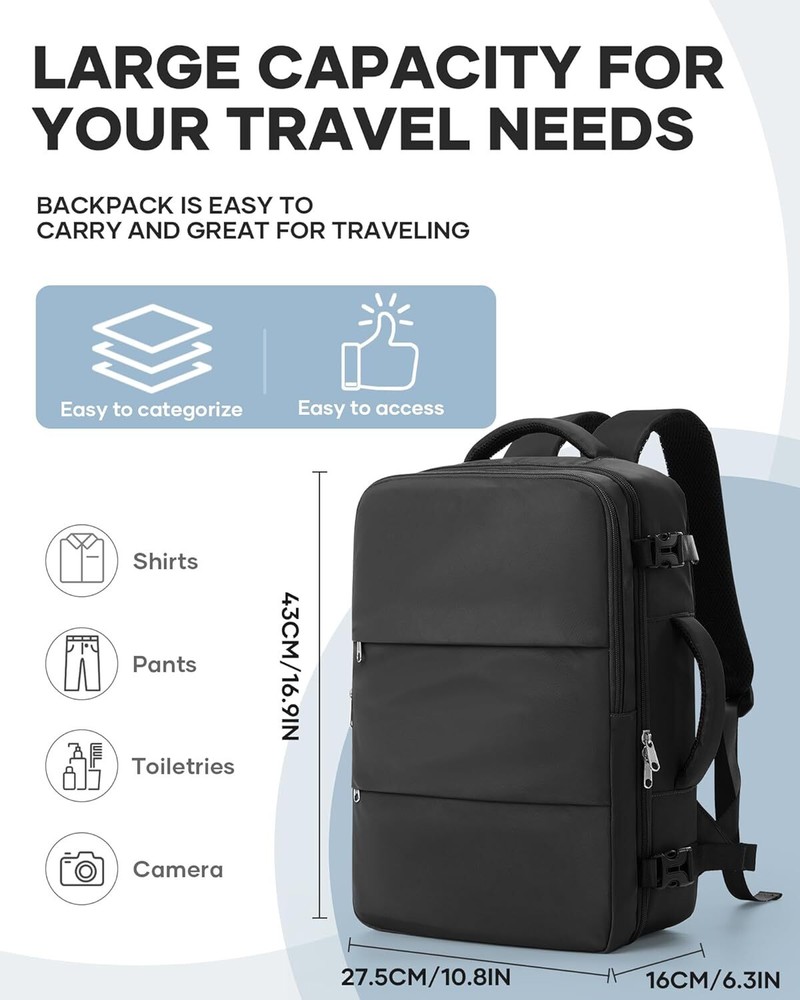 Free eBay listing template designed by dewiso.com Travel Backpack For Women Men Carry On Backpack For Traveling On Airplanes Personal Item Travel Bag laptop backpacks FREE AND FAST SHIPPING! Airline Compliance Size:This carry on backpack measures 10.8*6.3*16.9 inches and weighs 1.54 lbs.This specification meets the size requirements of most airlines for carry-on baggage,which is convenient for you to carry on the plane easily without checking in,and it also provides enough space to meet the storage needs of your belongings for multi-day trips. Fully Functional:This travel backpack combines storage,protection and convenience,with a main pocket that can easily hold multiple changes of clothes,and a special wet/dry separator pocket that effectively segregates wet clothes or toiletries and keeps other items dry. Rational Zoning:This laptop backpack is built-in with multiple independent compartments,specifically with a computer compartment for laptops up to 15.6 inches and below,as well as a tablet compartment,ID pocket,etc.,so that you can categorize your belongings in an orderly manner and access them conveniently. Convenient Details Design:The side of the backpack is equipped with elastic pockets for water bottles or umbrellas,easy to access at any time.Two zippered pockets on the front for storing frequently used small items,such as cell phone,wallet,keys,etc.The top and side handles and the back luggage straps can be carried or used with a trolley case,making traveling easier. High Quality MateriaL:Made of high quality fabric with excellent waterproof and abrasion resistance.Wide shoulder straps and soft padding can effectively reduce the burden on your shoulders.Breathable sponge on the back reduces the feeling of stuffiness on your back and makes you feel comfortable while traveling. Stylish Appearance: Simple and fashionable appearance design, whether as a travel backpack, laptop backpack, work backpack or leisure backpack can be easily managed. A variety of classic colors are available to meet different aesthetic needs, so that you are not only practical in the travel, but also show your personal style. Product We offer a 30-Day Return Policy on items which you are not completely satisfied with. You have the option for a full-refund or an exchange of the item. No returns are available on items shipped outside of the US . Shipping We offer Free Shipping to the US and ship within 2 business days of payment, usually sooner. We use UPS express shipping. That's why your products are usually delivered within 3 days . Contact We try our very best to make sure every customer is completely satisfied. If there's a problem , message us! We're happy to help. 24/7 live chat available.