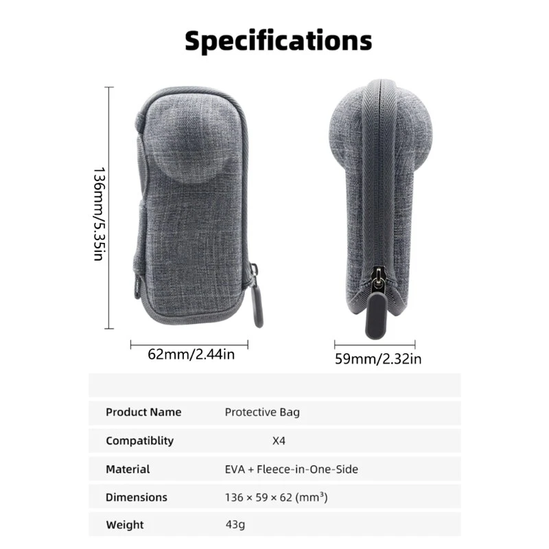 Travel Carrying Case Protectors Camera Body Bag for 360 Features: Camera body bag is a protective bag designing specifically for 360 camera, providing comprehensive protections. fabric, and shock effectively protecting the camera from external scratches and damage. The bottom opening allows for external expansion of tripods and more. Small and exquisited, portable storage. Precise cutting perfectly fitting the body. Specifications: Fabric: EVA+Fleece Color: gray Size: about 62x59x136mm/2.44x2.32x5.35inch Applicable Model: for 360 Action Camera Package Includes: 1x Camera Body Bag note: Please allow 1-2cm errors due to manual measurement. Please allow for slight color differences due to different display resolution.