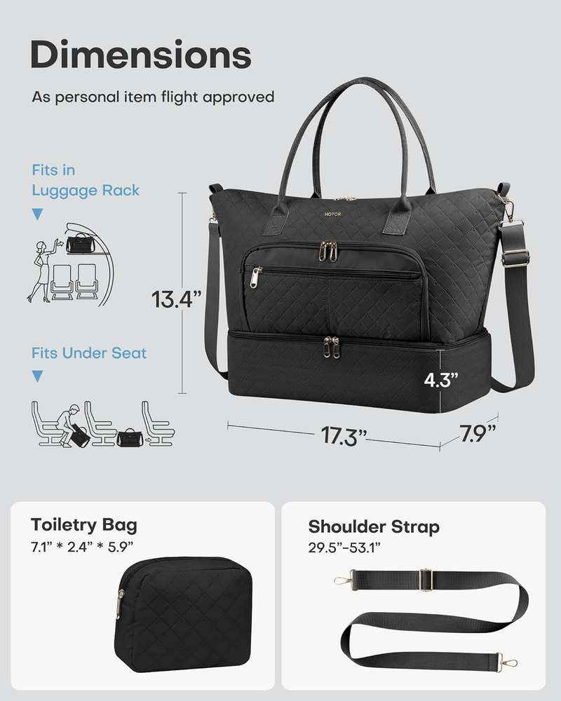 Store New Arrivals Add to Favorite View Feedback Contact Fast deliveries to the customer's home Quality customer service John Make the customers happy! Travel Duffle Bag for Women - Carry on Bag with Toiletry Pouch & Shoe Compartment, Large Overnight Weekender Bags for Gym, Business Trips, Sports and Hospital, Black, 17.3" X 7.9" X 13.4" Description EFFICIENT ORGANIZATION: This sports bag offers a roomy 17.3" x 7.9" x 13.4" storage area paired with a 7.1" x 2.4" x 5.9" pouch for small cosmetics or toiletries. Dedicated interior and exterior pockets provide additional sorting zones, keeping belongings categorized and ensuring quick access. FRESH FOOTWEAR ZONE: This overnight bag features a 4.3" bottom shoe compartment with 2 ventilation holes that promote airflow and help reduce odor buildup. A separate U-shaped opening provides smooth, wide access to your shoes. Keeping footwear separate from clothing helps your packing stay cleaner. FLEXIBLE CARRYING: This gym bag for women comes with reinforced top handles, an adjustable 29.5"-53.1" shoulder strap, and a rear trolley sleeve for multiple carrying options. The adaptable setup helps reduce strain and frees your hands when needed, making airport travel and daily commutes more convenient. RELIABLE MATERIAL: Made with lightweight, water-repellent, and abrasion-resistant fabric, this travel bag for women withstands everyday handling. The smooth metal zippers glide cleanly without snagging. Its long-lasting, protective design keeps your essentials shielded from splashes, bumps, and frequent use. MULTI-SCENARIO READY: This portable weekend bag for women features a streamlined layout with flexible storage zones that shift effortlessly between tasks. It adapts to workouts, short trips, business travel, and hospital stays, allowing you to handle each occasion with confidence and ease. Product description Item Weight 485 Grams Department Unisex Adult Product Dimensions 17.3 x 7.9 x 13.4 inches Color Black Size 17.3" x 7.9" x 13.4" ABOUT US We offer the best prices around on high quality products. Our E-store includes media such as books, movies, music and games while offering electronics, toys, sporting apparel, clothing, tools, general home, garden items and more. SHIPPING We are always working hard to ensure your package arrives as soon as possible. Please understand that some factors like weather, high postal traffic, and the performance of shipping companies are outside of our control. We offer free shipping to the lower 48 states and ship within 2 business days of payment, usually sooner. We do not accept P.O. Boxes. Please provide a physical address. For shipping outside of the continental USA, we only use eBay's Global Shipping Program. The item is shipped to KY and then sent to the rest of the world. International customers are responsible for all duties and taxes. Continue to 'check out' to calculate costs for shipping the item to your country. Messages regarding eBay's Global Shipping Program MUST be directed at eBay EXCLUSIVELY. RETURNS We offer a 30-Day Return Policy on items in which you are not completely satisfied with. You have the option of a full-refund or an exchange of the item. No returns are available on items shipped outside of the USA PAYMENT We accept PayPal. CONTACT US This page content is yet to come Please ad us to your favorite seller and visit again later Thank You CUSTOMER SATISFACTION We try our very best to make sure every customer is completely satisfied. If there's a problem, message us! We're happy to help. WE ACCEPT