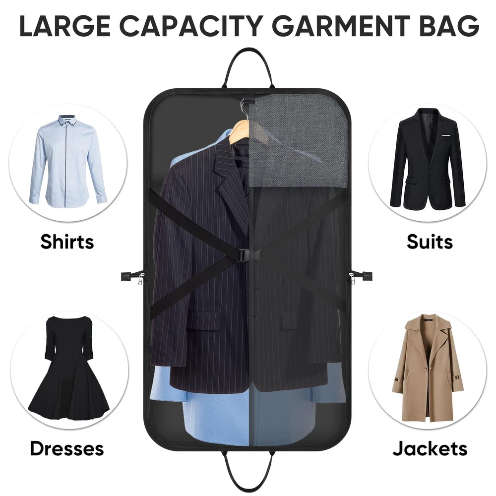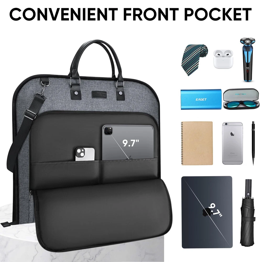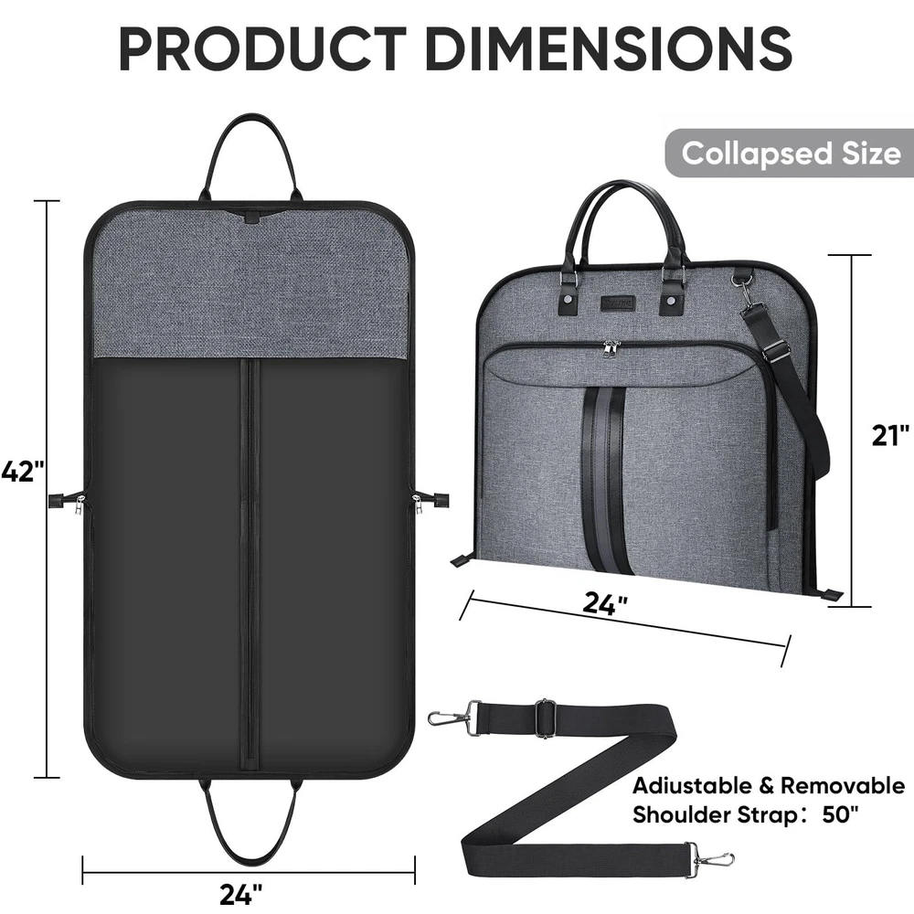 [Premium Material] Crafted from premium 600D water-resistant materials, this garment bags for storage is a testament to longevity. The structure of the suit carrier garment travel bag ensures your garments remain unharmed from the wear and tear of travel. [Practical Design] This garment bag for suit is more than just a protective layer for your clothes. Its foldable design ensures that it compacts down efficiently, taking minimal storage space. Moreover, you can also small items in the front pocket of the travel garment bag. The PU handle, complemented by an adjustable shoulder strap, ensures ease of transportation during travels. [Optimized Dimensions] The dimensions of the suit travel bags for men is 42''x24'' when fully expanded, ensuring that your suits, dresses, and precious attire have ample space to rest without getting wrinkled. The dress garment bags for travel gracefully folds down to a compact 24''x21'', making storage or transit a breeze. The adjustable shoulder strap can be extended up to 50'' to suit your carrying preference. [Versatile Utility] Whether you're a business professional headed to a crucial meeting, a groom or bridesmaid preparing for a wedding, or someone attending an upscale event, this suit garment bag is your attire's best friend. It preserves the freshness and crispness, ensuring you always put forth the best version of yourself. [Quality Commitment] stands behind the quality of our products. If for any reason you are not satisfied with your purchase, please us. We provide 30-day money back . 100% Satisfaction for risk-free shopping!
