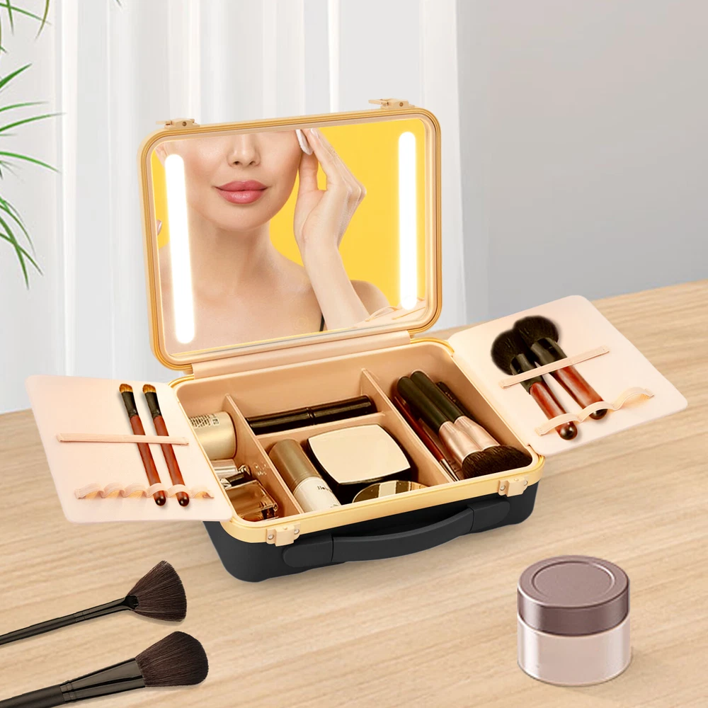 Travel Makeup Bag Case Storage USB Portable Makeup Box with LED Light & Mirror Description Description Whether you're working or traveling, a professional makeup case will be a great convenience. This portable makeup box is made of high-quality material, which is strong and durable. The compartmentalized design makes the items neatly organized, and the clear mirror and LED lights are convenient for you to apply makeup in various environments. It is ideal for professional makeup artists and cosmetologists. Key Features High-quality Material: The product is made of high-quality ABS, aluminum alloy, and silicone with the injection molding process, which is strong, pressure-resistant, waterproof, impact-resistant, corrosion-resistant, rust-resistant , and has a long service life. Categorized Storage: Four compartments inside have large storage space to categorize and organize your various cosmetics, and two baffles with elastic bands can store and secure makeup brushes, as well as prevent cosmetics from coming into contact with the mirror. Humanized Design: There is a large 4K silver-plated mirror with LED light inside the product, and the light colour can be easily adjusted/infinitely adjusted between warm light, neutral light and white light by touching/long-pressing the switch, which can help you see more details of your makeup and restore the true state of your makeup. Long Endurance: With a built-in 5000mAh rechargeable lithium battery, it can be illuminated for 4-6h after being full charged. Equipped with a USB charging cable, you can charge the product via mobile power, laptop, or adapter(not included), which is very convenient for both home and travel. Ideal Gift: With a stylish appearance and practical functions, this product is an ideal birthday and holiday gift for family, friends, fashionistas, and beauty lovers. Ready to Use: This product does not require assembly, and you can start using it once you receive it, saving the tedious installation process and making it more convenient. Effortless Cleaning: Thanks to the smooth surface and simple structure, you can easily wipe off the dirt on it with a soft cloth. Protective Packaging: The sponge can better protect your product during transportation and make it delivered to you completely to the greatest extent. Good Customer Service: We stand behind all our guests and look forward to assisting you with your purchase. It is our pleasure to answer your confusion and questions. The end of the story between us is not "we sell and you buy". Details Comfortable Handle: The silicone handle is comfortable to grip and easy to carry so that you can always keep your delicate makeup even when you are traveling. Solid Base: With 4 silicone feet on the back of the case, it can hold the product in place so that it is not easy to slide. Stable Hinges: The robust hinge makes it easy to open (up to 180°) and close without being damaged. Rounded Corners : The corners and smooth edges are designed to provide a comfortable and safer touch. Application This product is suitable for travel and home makeup use or as a jewelry case, ideal for makeup artists, hair stylists, nail technicians, and cosmetologists. Specification Color: Black Style: Modern Shape: Rectangle Material: ABS, Aluminum Alloy, Silicone Process: Injection Molding Assembly Required: No Opening Method: Buckle Power Source: Battery Powered, USB Light Source: LED Light Color: Warm, Neutral, White Battery Type: 1*5000 mAh Lithium Battery ( Included ) Charging Time: About 1-2h Endurance Time: 4-6h Maximum Opening: 180° Gross Weight: 2kg/ 4.41 lbs Net Weight: 1.6kg/ 3.53 lbs Package Size: 33*14*29 cm/ 12.99*5.51*11.42in Product Size: 29*9*22 cm/ 11.42*3.54*8.66 in Package Included 1* Portable Makeup Box 1* Chinese and English Manual 1* USB Charging Cable Notes Please note that cosmetics and make-up tools are not included. Please read the operating manual completely before use. And pay particular attention to the safety instructions included. Please allow the slight color difference caused by the shooting light and the 1-3 cm error due to manual measurement, and make sure you do not mind before ordering. Payment Delivery details Terms of sales About us Contact us Payment We accept ebay payment 。 Fees such as import duties, taxes are not included in the item price or shipping costs. These charges are the buyer's responsibility. Delivery details Shipping: 2-9 working days to: USA Terms of sales We maintain high standards of excellence and strive for hundred percent customer satisfaction. Feedback is very important to us. We hope that you contact us immediately before you give neutral or negative feedback, so that we can address your concerns. It is impossible to address issues if we do not know about them! About us Your satis faction is our ultimate goal. We work hard to earn your trust and future business. Our certified technicians have tested each item before shipping. The unit comes with 1 year limited warranty on all manufacturing defects. a) If you receive a defective item, you may return it or ask for a discount. Please contact us within 14 days after you receive the package. b) What you returned must be intact and in its original packaging as re? u. Customer is responsible for shipping costs of the returned item. c) We will cover the cost of shipping back t with the shipping rate indicated in the registration page. We will send you a new unit or refund the full payment you paid. Thank you. Contact us Business Hour Business Hour: Monday To Friday: 8:30 AM to 5:00 PM (Beijing China time) Due to time zones, our reply to your questions may not be immediately. But within above working time, we will reply your email within 24 hours. If it's non-workdays, please kindly be patient and wait till Monday. Please contact us with ebay message. Please feel free to contact us if you have any questions. Monday To Friday: 8:30 AM to 5:00 PM (Beijing China time) Due to time zones, our reply to your questi