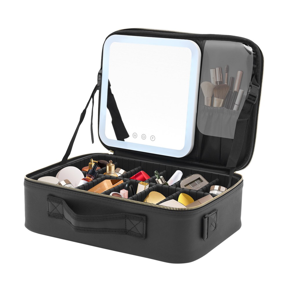 This makeup bag is a game-changer! The built-in mirror with adjustable lighting makes touch-ups a breeze, and the three color settings help me get my makeup just right in any lighting. I love how spacious it is—plenty of room for all my products, plus the adjustable dividers keep everything organized. Perfect for travel or everyday use, it’s durable, sleek, and super convenient. A must-have for makeup lovers!