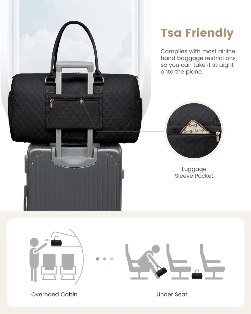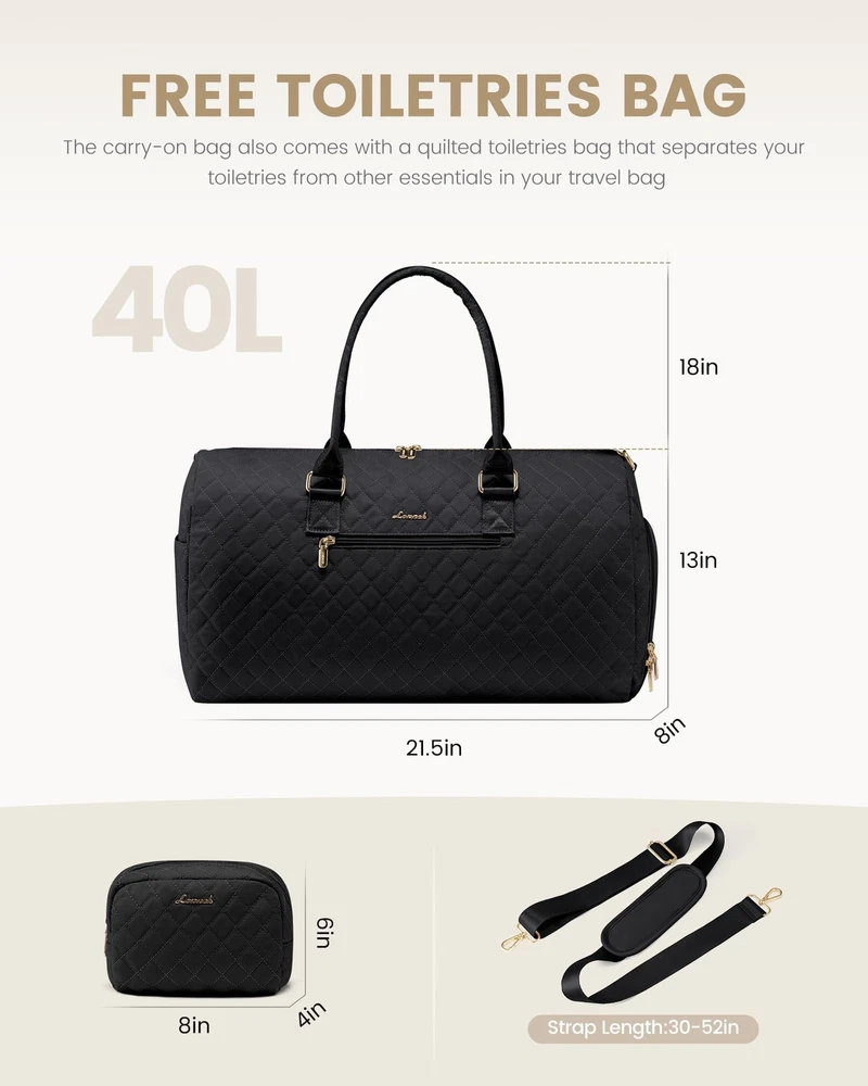 Travel Duffle Bag, Weekender Bag for Women with Toiletry Bag, Carry on Overnight Bag with Shoe Compartment, Gym Duffel Bag with Wet Pocket, Mommy Hospital Bags for Labor and Delivery 【TRAVEL TOTE BAG WITH SHOE COMPARTMENT+FREE SEPERATE TOILETRY BAG】: 1. comes with a $15 toiletry bag 2. comes with adjustable & detachable sling strap and handles.This is 's latest upgrade combination travel duffel bag set: adds seperate shoe compartment & toiletry bag, the shoe compartment of this travel bags for womencan hold your shoes or dirty clothes for easy separation from clean clothes when traveling. 【CARRY ON BAGS FOR AIRPLANES】:Sizes- 21 x 8 x 13 inch,2.6Lbs, duffle bag for women meets most international carry-on requirements.Fits in the overhead compartment as well as the under seat as Personal Items in flight.Integrated trolley sleeve slides over rolling luggage handle making airport travel a breeze.One zippered pocket on the back to hold your smart phone, IDs or passport.Your ideal overnight weekend boarding bag for business or personal travel. 【STYLISH WEEKEND BAG & OVERNIGHT BAG FOR WOMEN】:With a total of 7 pockets and 1 compartments,Roomy space can even fit in 3-5 days of daily essentials,Easily fit into your clothes,toiletries,shoes,laptop,Ipad and other items.In the front of the duffle bag for travel, there is a pocket for easy access electronics or travel materials.Featuring with classy and gorgeous appearance, Our travel duffel bags reach morden urban ladies greatest demand and fantasy on travel bag. 【DRY WET SEPARATED GYM BAG & HOSPITAL BAG】:The high density water resistant material can help you to separate dry items and wet items,if you have wet clothes or towel,you can put it in this gym bag for women.Our womens gym bag is a perfect reliable companion for both indoor and outdoor sports.It is perfect for workout,travel,tennis,basketball,yoga,swimming,camping and many outdoor activities. It can also be used as a medical bag,hospital bag and mommy bag. 【MULTIPURPOSE DUFFEL BAG & PERFECT SERVICE】:Use it as a duffel bags for traveling,personal item travel bag,mommy bag for hospital,weekend bag for women, gym bags for women, carry on bag, or laptop bag.,it can also be used as a Christmas gift,suitable for family, friends, and partners.With 's reliable after-sales service and fine craftsmanship, We promise that if you are not satisfied within one month, you can unconditionally. Why Choose traveling bag? carry on duffel bag can be carried in a variety of different ways. It can be used as a business trip bag with its handles or as a Travel weekend bag for short trips. Whether you are a college, fitness enthusiast or professional business woman, don't forget to exercise and eat healthy to keep fit. Specifications: Size: 21 x 8 x 13inch Weight: 2.6 lbs; High-Quality Material: Quilted Nylon Fabric (Waterproof & Light-Weight ) Best Uses: Gift, yoga, work, business trips, traveling, sport, beach, camping. Features: ● Laptop pocket- for up to 15.6" laptop ● Large main compartment- storage clothes, shoes and other work or travel accessories ● Dry Wet Separated Pocket- Separate dry and wet items, can put toiletries, towels ● Independent Shoe Compartment- Perfectly separate your dirty shoes or clean clothes ● Front/Back easy access zipper pocket- small accessorie,passport,cell phone ● Side pockets- can hold your large water bottle or umbrella Shipping We offer FREE shipping on all orders! We ship within Three business days of payment, usually sooner. We use a selection of shipping services such as UPS, FedEx, USPS etc. We only ship to the lower 48 states, no APO/FPO addresses or PO Boxes allowed. Local pickups and combined shipping options are not provided at this time. Return You can return a product for up to 30 days from the date you purchased it. Any product you return must be in the same condition you received it and in the original packaging. Please keep the receipt. Payment We accept payment by any of the following methods: PayPal Please pay as soon as possible after winning an auction, as that will allow us to post your item to you sooner! Feedback Customer satisfaction is very important to us. If you have any problem with your order, please contact us and we will do our best to make you satisfied. Contact Us If you have any queries, please contact us via ebay. We usually respond within 24 hours on weekdays. Please visit our eBay store to check out other items for sale! Thank you for shopping at our store.