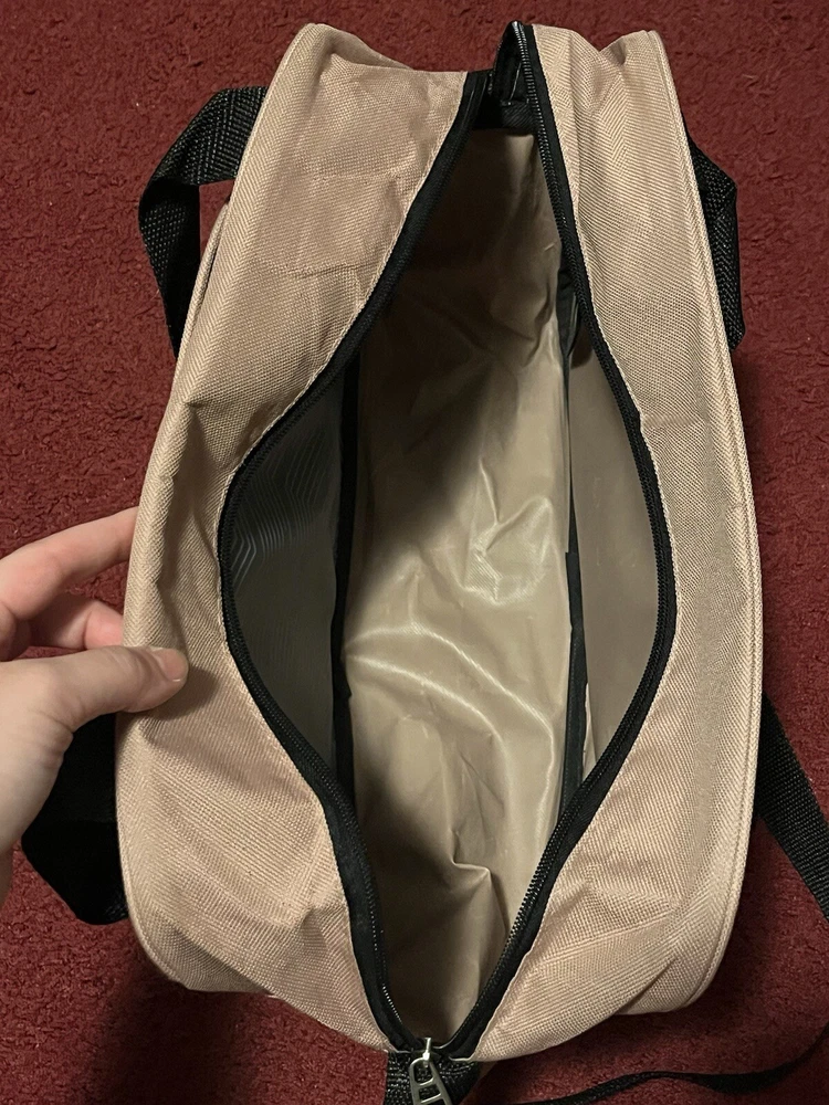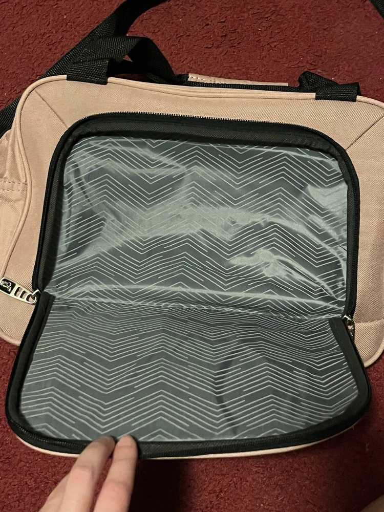 Rose gold colored boarding tote. Tote features a back strap that can attach onto luggage trolleys. The material is deteriorating a bit due to the material, but the bag is still 100% functional. It works and looks as it should. Bag is really spacious, great for travel and being on the go. Comes from pet free and smoke free home: