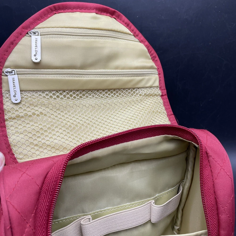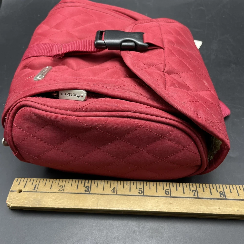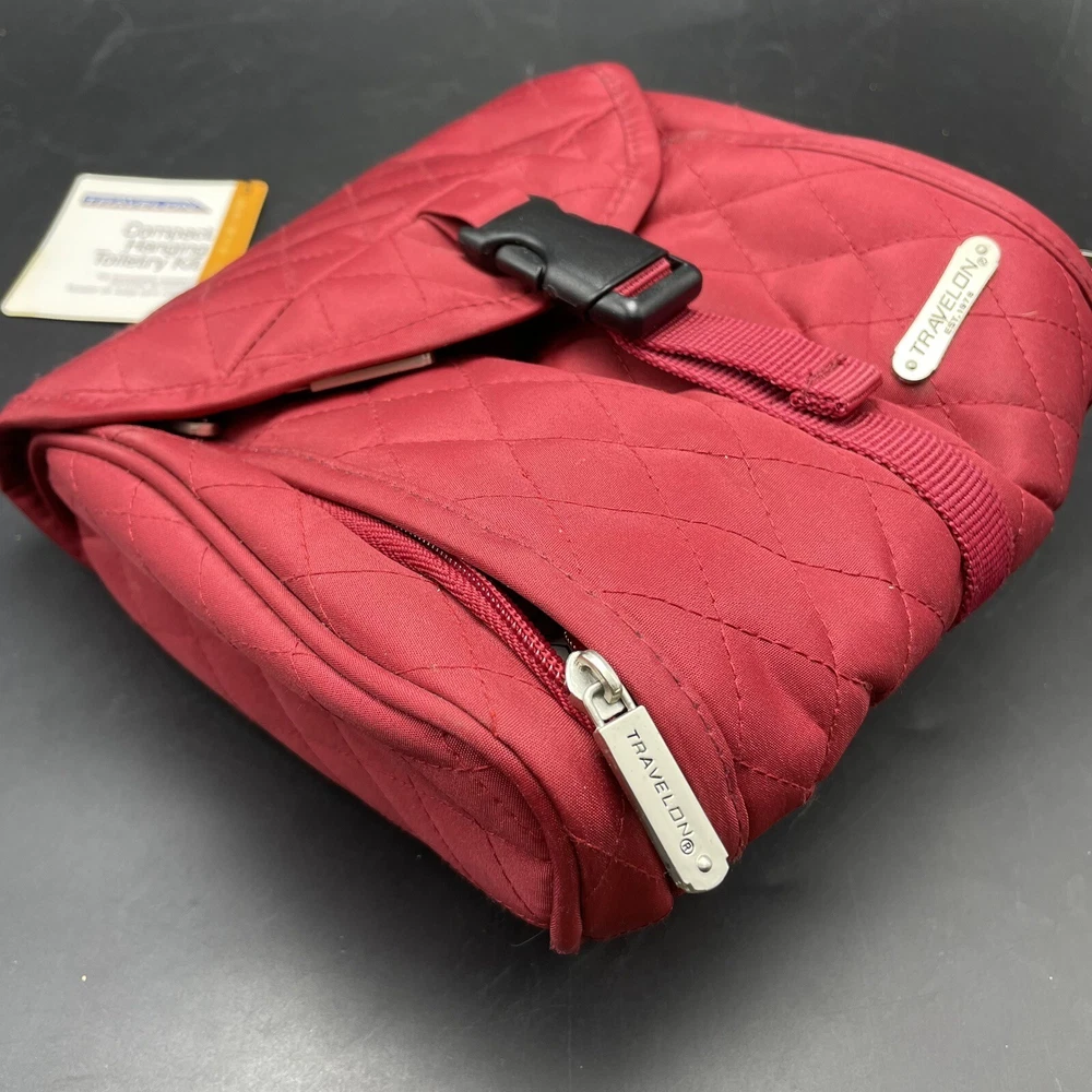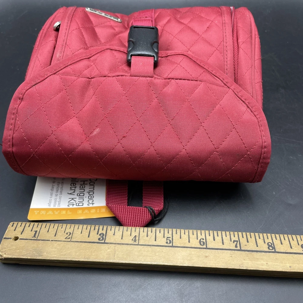 Travelon Compact Hanging Toiletry Kit Travel Makeup Bag Organizer Red Maroon. Style #6111 Maroon color quilted nylon - called red on tag but not true red Check pictures for details and measurements