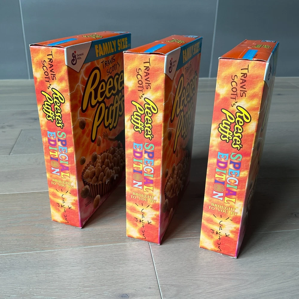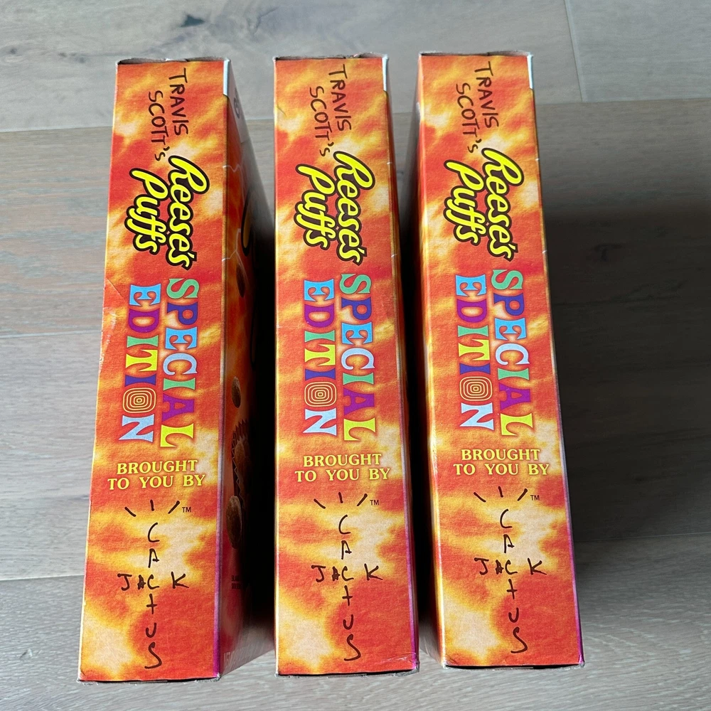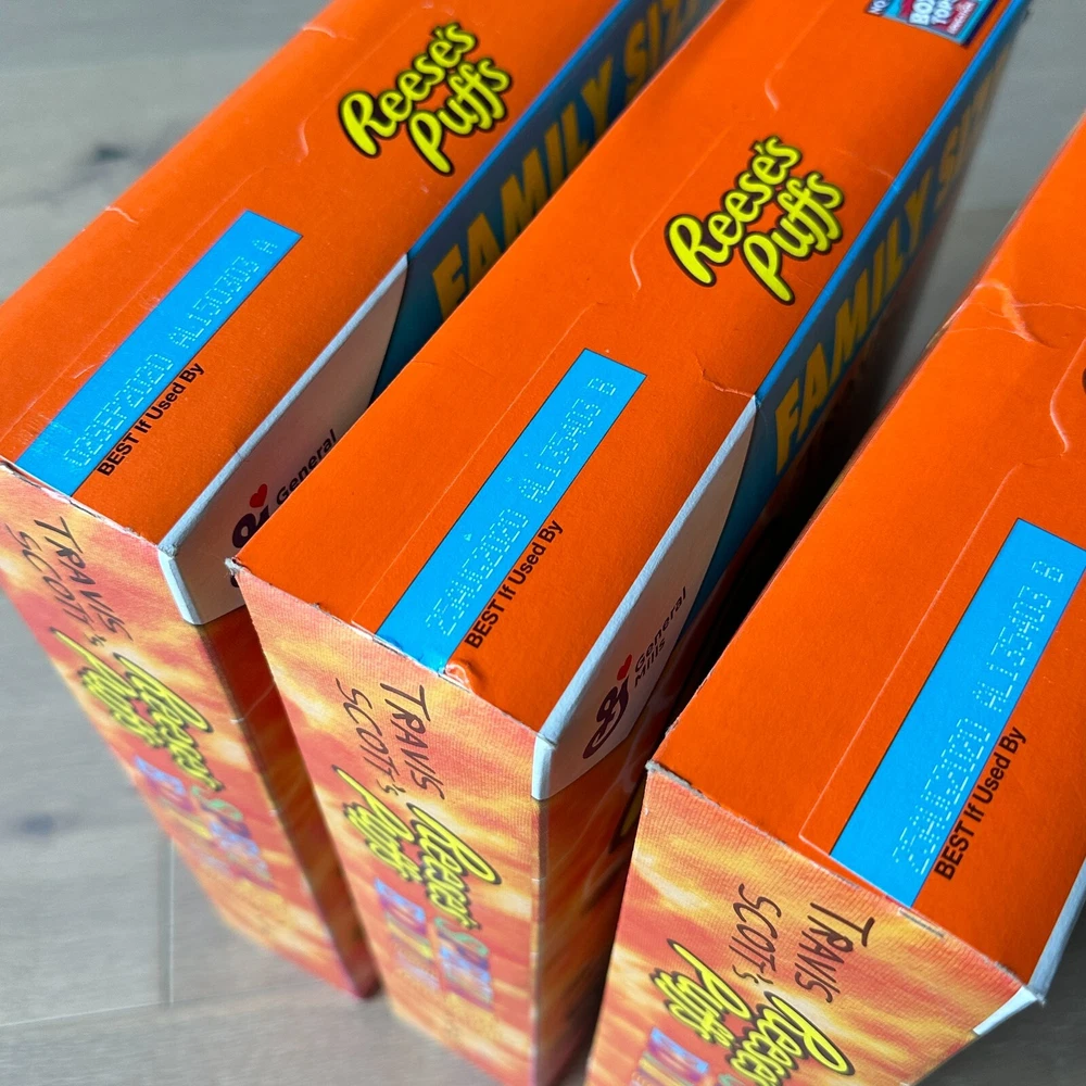 This limited edition Travis Scott Reese's Puffs cereal box is a must-have for any cereal or hip-hop fan. Featuring bright orange packaging with the iconic rapper's signature logo, this unopened display box is a perfect addition to any collection.The box showcases the Original General Mills Reese's Puffs cereal with a special twist, making it a highly sought-after item among collectors. Whether you're an avid collector or just looking for a unique piece of hip-hop memorabilia, this limited edition cereal box is sure to impress. PLS NOTE THIS IS NOT FOR CONSUMPTION - EXPIRED 2020 - DISPLAY ONLY 3 BOXES AVAILABLE 20.7 OZ SIZE