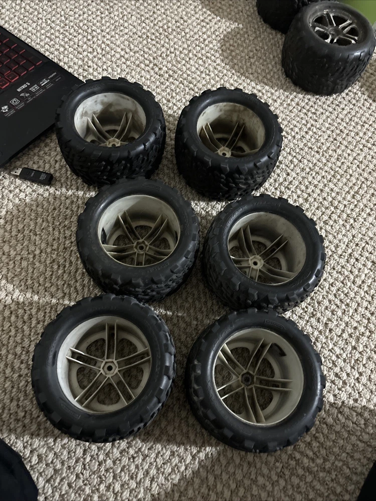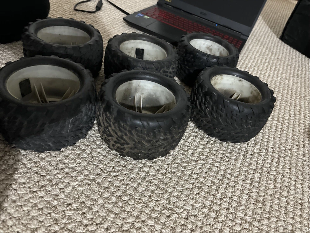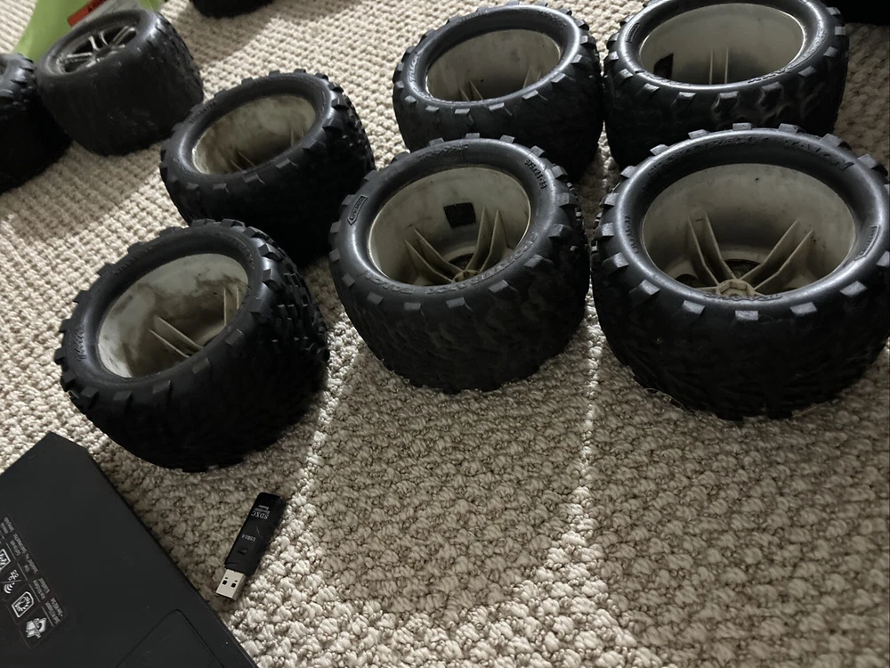 This Traxxas 1/10 T-Maxx 2.5 * 2 SS CHROME WHEELS & 3.8" TALON TIRES * 5174R (6) is a great addition to any R/C enthusiast's collection. The set includes two chrome wheels and three 3.8" talon tires, all compatible with Traxxas brand and 1:10 scale. The MPN(s) for this set are 5174R TRA5174R 49104-1 and the color is as per description. The set is suitable for ages 17 years and up and was manufactured in China. These R/C parts are perfect for those looking to upgrade their vehicle's performance and style. The set is compatible with various Traxxas models and is made of high-quality materials to ensure durability and longevity. Get your hands on this amazing set today and take your R/C experience to the next level! 6 of them, rubber is in good shape, hubs are good