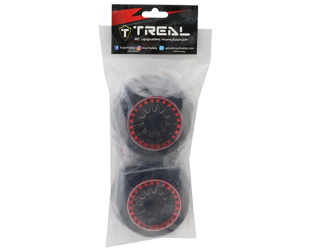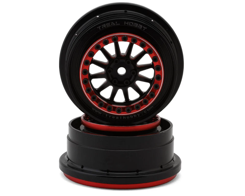 Wheel Overview: Introducing the Treal Hobby Type B Aluminum Beadlock Wheels for Traxxas® UDR®. This is an optional set of wheels intended for use on the Traxxas Unlimited Desert Racer® UDR 1/7 4WD Race Truck. These wheels are crafted from high-quality aluminum for exceptional durability and strength, ensuring they can withstand rugged terrains while delivering long-lasting performance. The lightweight design reduces rotational mass for improved acceleration, handling, and maneuverability, helping you tackle challenging terrains with ease. Boasting a sleek, stylish appearance, these wheels add a professional and eye-catching touch to your UDR, perfect for both racing and showcasing. These wheels work as a direct upgrade for the UDR, offering compatibility with upgraded tires such as the Pro-Line Hyrax Tires (PRO10163-00) available separately. Features: Crafted from high-quality aluminum for durability and strength Lightweight design reduces rotational mass for better handling Sleek and stylish appearance adds flair to your UDR Precision construction enhances stability and cornering control Aluminum construction improves heat dissipation during intense use Compatible with Pro-Line Hyrax Tires (PRO10163-00) available separately Built to withstand off-road conditions and high-performance driving Available in a variety of colors for a wide range of customization options Specifications: Outer Diameter: 3.74in (95mm) Width: 1.65in (41.91mm) Center Hole Diameter: 0.23in (5.84mm) Weight: 5.71oz per wheel (161.88g each) Hex Hub: 17mm Includes: (2) Type B Aluminum Beadlock Wheels About Us | View Store