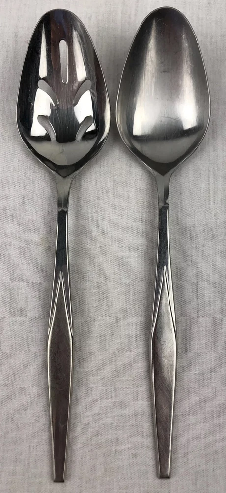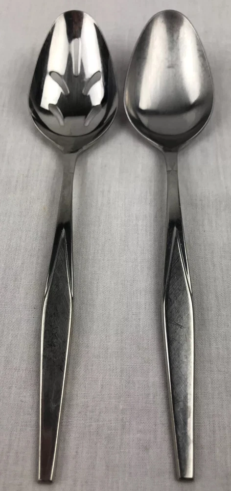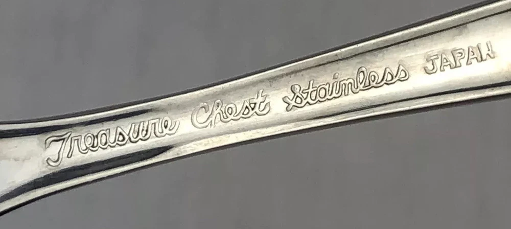 Vintage Treasure Chest TCS4 Stainless Flatware 2 Piece Lot Includes: 1 Pierced Serving Spoon 1 Solid Serving Spoon Shows signs of light use and may need additional cleaning. Little spotting in places but no dishwasher or disposal damage. Overall very nice condition. Please see pictures for details as this is part of my description.