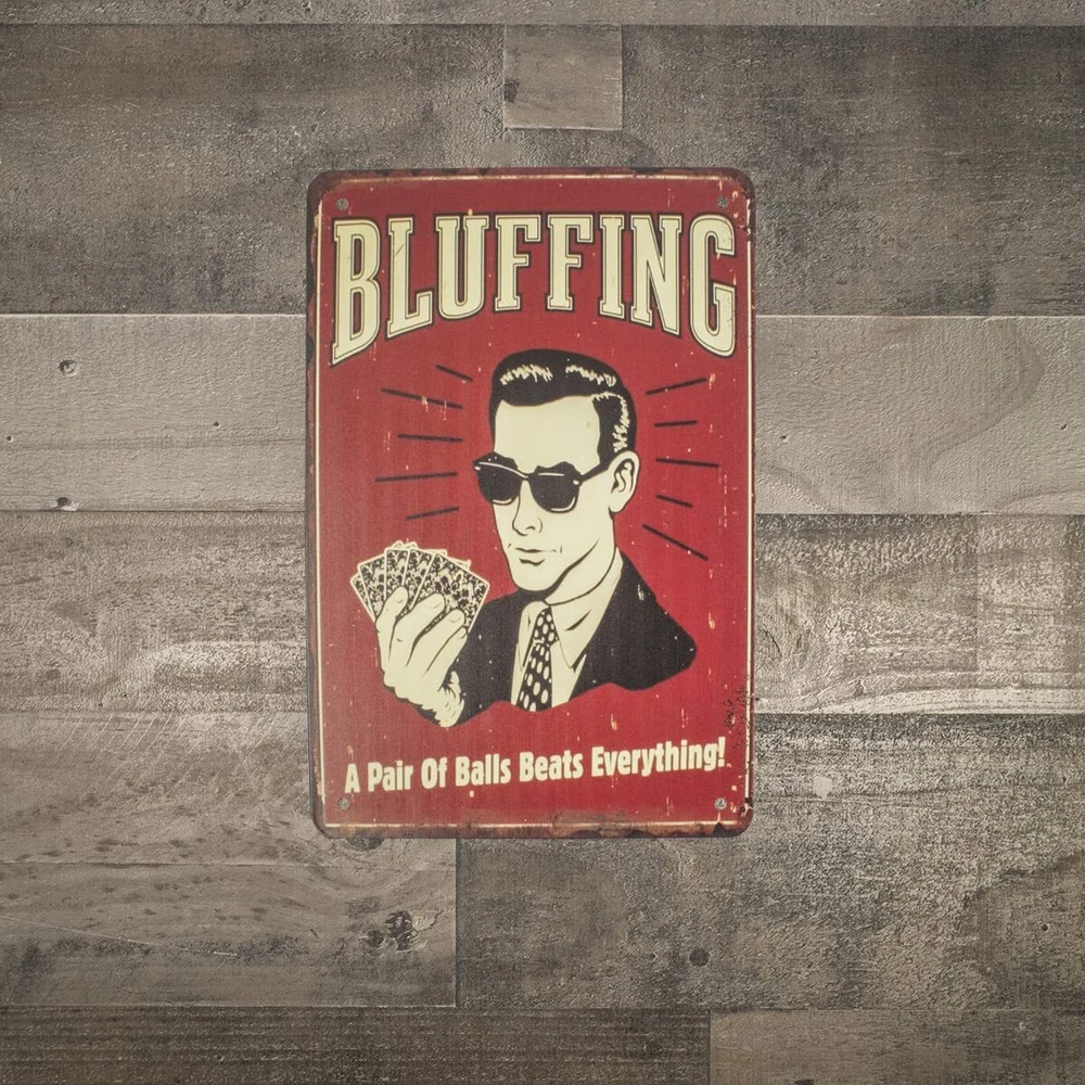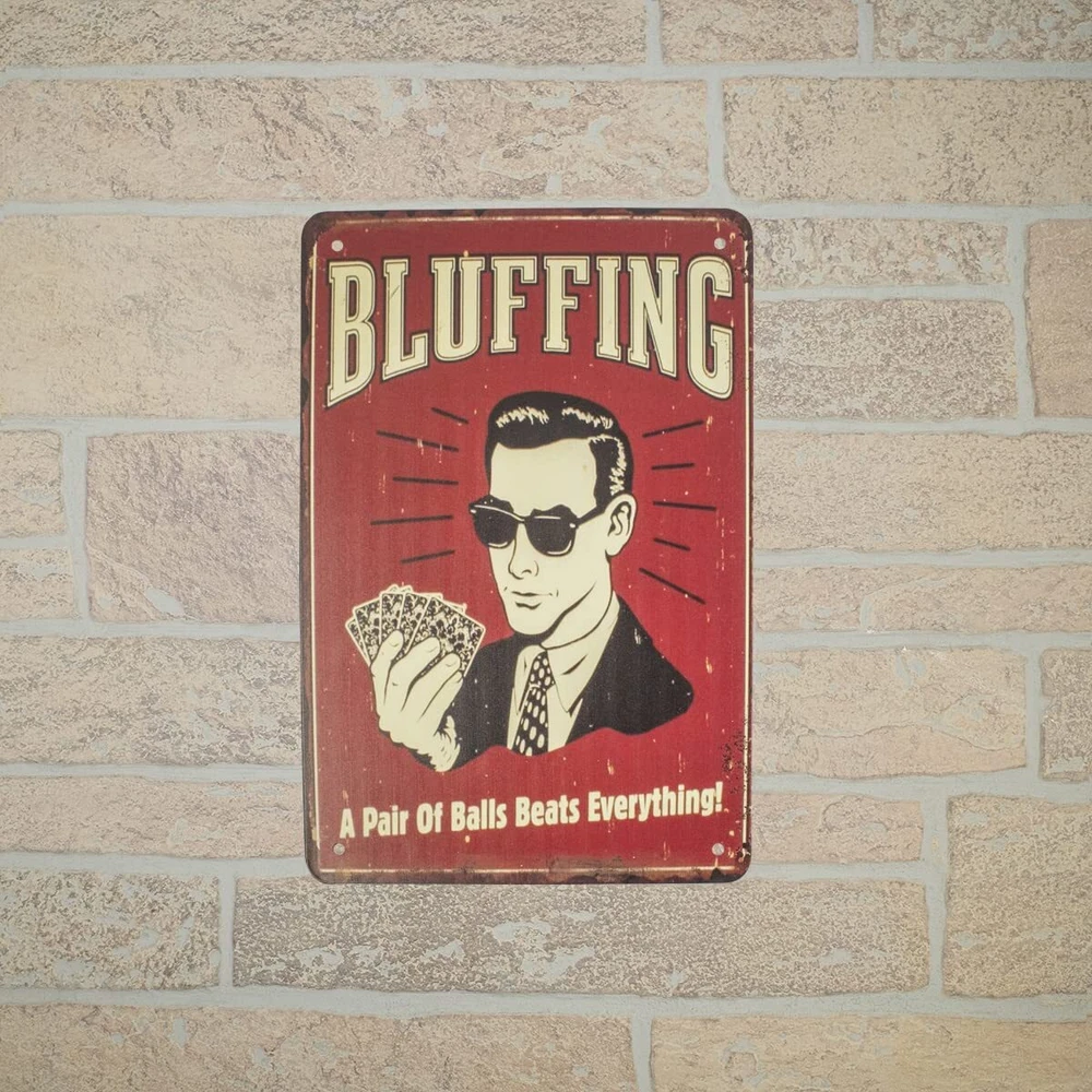 Show everyone you have the testicular fortitude needed in a poker game with this novelty wall sign. Made from metal and made to look retro, this funny wall decor reads: "BLUFFING A Pair Of Balls Beats Everything!" on a deep red background with distressed edges and the graphic of a man in a tie and sunglasses holding a poker hand, reminiscent of 1950s advertisements. Great humorous decor for your man cave, rec room, or poker night, this novelty sign is shows it takes a pair of balls to bluff. Mount this metal sign on your bar or pub wall and get laughs from customers and guests. Give this novelty metal sign as a gift to friends or family members and get one for yourself. Novelty poker game sign makes you interesting wall art measures approximately 12" long, 8" wide, and includes 4 pre-drilled holes for easy wall or door mounting. As with all our items, this funny metal sign ships brand new with our 100% customer satisfaction guarantee. Show everyone you have balls with this novelty wall sign Funny wall decor reads: "BLUFFING A Pair Of Balls Beats Everything!" on a red background Metal bluffing sign is great wall decor for your garage, man cave, bar, or next poker game Give this metal sign as a gift to friends or family members and get one for yourself Novelty wall art measures approximately 12" long, 8" wide, and includes 4 pre-drilled holes