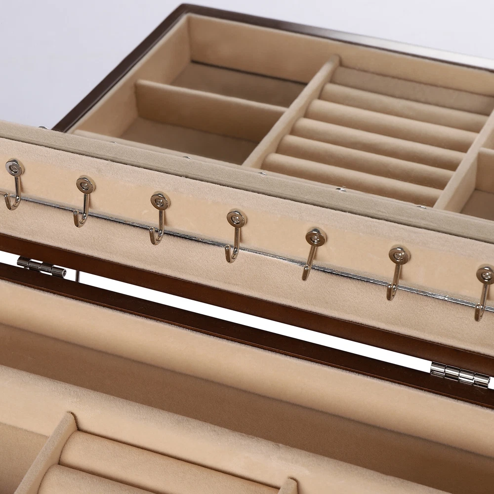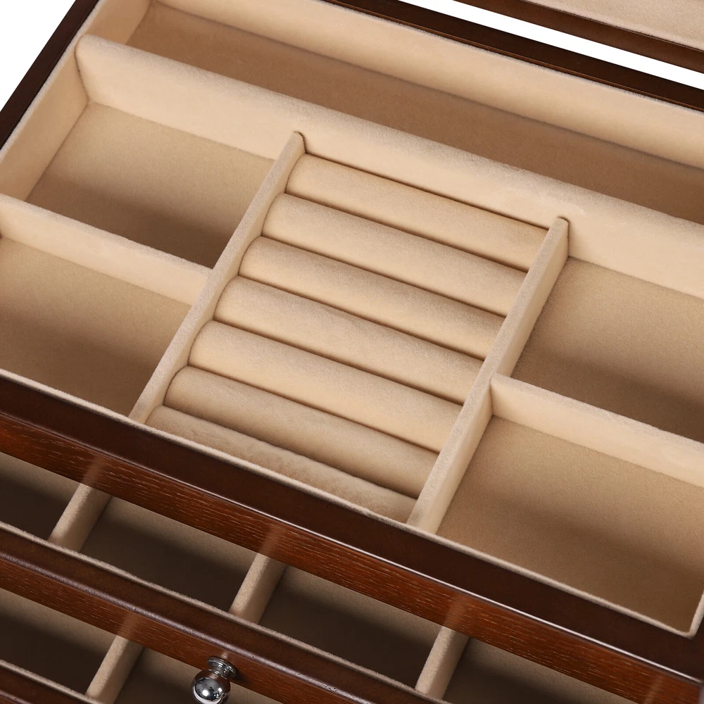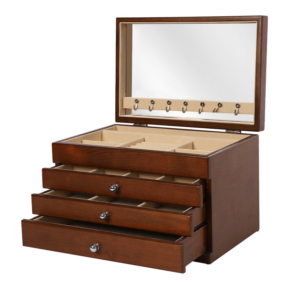 Treasure Jewelry Chest Organizer 4 Tier Vintage Wooden Storage Box With Mirror Description Are you afraid of being late for your next appointment? Don't waste another second! This 4-tier wooden jewellery box can help you save precious time in the morning before you go to your day's work because it comes with a large mirror. It has 4 tiers to ensure its enough storage capacity. The durable construction and high-quality velvet interior protect your treasures from scratches and dust. Specification Material: MDF Color: Original Wood Finish Type: Odorless Paint Shape: Rectangular Special Feature: Large Capacity, Jewelry Organizer Number of Drawers: 3 Style: Classic Package Size: 36.5*26.5*36.5cm/14.37*10.43*14.37in Product Size: 30.1*20*20.6cm/11.8*7.9*8.1in Gross Weight: 5.5kg/12.13lbs Net Weight: 5kg/11.02lbs Key Features Large Capacity : It has 4 tiers to ensure its enough storage capacity. It provides more space for your cufflinks, rings, ties clips, necklaces or watches, etc. Sorted Storage : 3 pull-out drawers can sort and store some jewelry. Your frequently worn earrings, rings and other jewelry can be stored in the top open-lid jewelry tray which is designed with special sections for rings and watches. Humanized Design : The closed way can effectively prevent dust and prevent your items from losing their luster. In addition, the soft velvet lining protects your beloved jewelry from scratches and damage. Meanwhile, the built-in large mirror provides convenience when dressing. Elegant Look : The wood grain texture and soft premium velvet lining create a classic and luxurious feel. Using it to store your accessories will give them a sophisticated look. High Quality : It is made of high-quality MDF and coated with clean paint, so it is not only very strong, wearable, and durable but also odorless and safe. Easy to Clean : The painted surface is very smooth, so you only need to wipe it with a rag to make it look new. Ideal Gift : This 4-tier wooden jewellery box has a sophisticated look and practical features that every girl needs, so it's a great choice for your girlfriend or any female friend. Customer Service : We aim to provide quality products and services. If you have any problems, please feel free to contact us. We will reply and solve the problem for you as soon as possible. Details Metal Handle : Each drawer comes with a delicate metal handle that is beautiful and easy to open at the same time. Rounded Corners : All the corners are rounded to prevent you from scratching your hands when you take the items, which is a very thoughtful design. Application It can be used in bedrooms as well as large shopping malls and accessory stores to organize rings, jewelry, hair accessories, etc. Package Included 1*4-Tier Wooden Jewellery Box Notes Please allow the slight color difference caused by the shooting light and 1-3 cm error due to manual measurement, and make sure you do not mind before ordering. Payment Delivery details Terms of sales About us Contact us Payment We accept ebay payment 。 Fees such as import duties, taxes are not included in the item price or shipping costs. These charges are the buyer's responsibility. Delivery details Shipping: 2-9 working days to: USA Terms of sales We maintain high standards of excellence and strive for hundred percent customer satisfaction. Feedback is very important to us. We hope that you contact us immediately before you give neutral or negative feedback, so that we can address your concerns. It is impossible to address issues if we do not know about them! About us Your satis faction is our ultimate goal. We work hard to earn your trust and future business. Our certified technicians have tested each item before shipping. The unit comes with 1 year limited warranty on all manufacturing defects. a) If you receive a defective item, you may return it or ask for a discount. Please contact us within 14 days after you receive the package. b) What you returned must be intact and in its original packaging as re? u. Customer is responsible for shipping costs of the returned item. c) We will cover the cost of shipping back t with the shipping rate indicated in the registration page. We will send you a new unit or refund the full payment you paid. Thank you. Contact us Business Hour Business Hour: Monday To Friday: 8:30 AM to 5:00 PM (Beijing China time) Due to time zones, our reply to your questions may not be immediately. But within above working time, we will reply your email within 24 hours. If it's non-workdays, please kindly be patient and wait till Monday. Please contact us with ebay message. Please feel free to contact us if you have any questions. Monday To Friday: 8:30 AM to 5:00 PM (Beijing China time) Due to time zones, our reply to your questions may not be immediately. But within above working time, we will reply your email within 24 hours. If it's non-workdays, please kindly be patient and wait till Monday. Please contact us with ebay message. Please feel free to contact us if you have any questions.