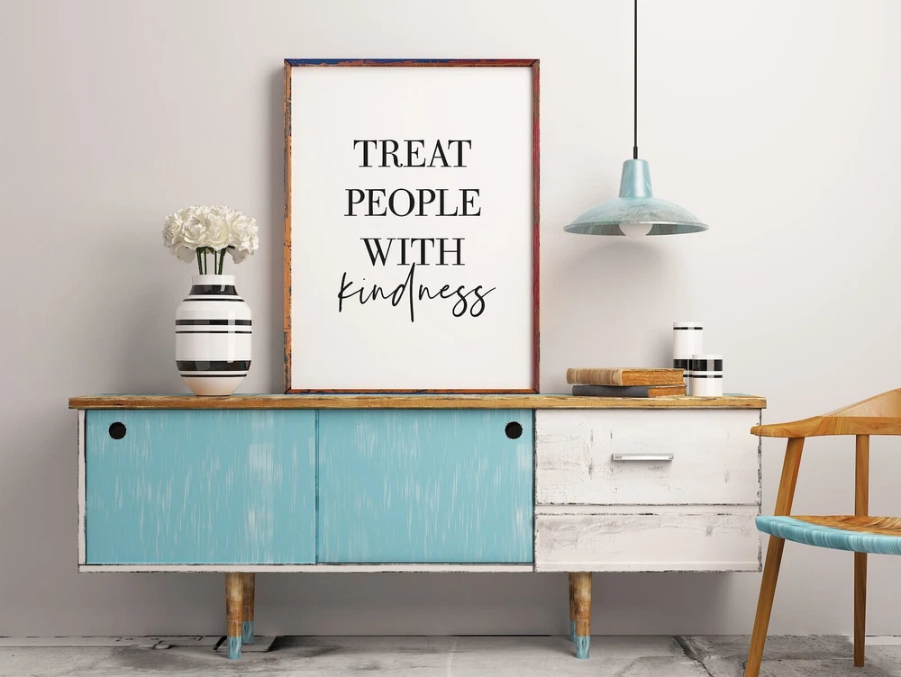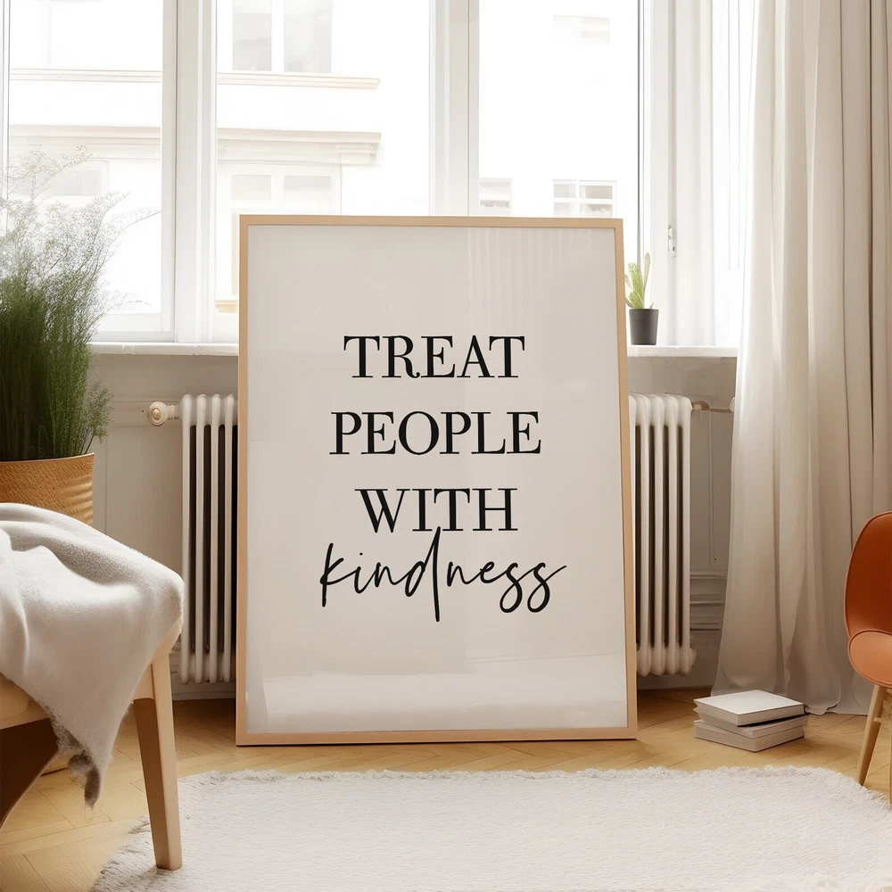 Treat People With Kindness Quotes Poster Printable Wall Art Motivational Wall Decor Print Positive Vibes Art Material: Premium luster photo paper Print type: Inkjet printing One side printed + The finish provides the highest possible resolution and color saturation + Lasts up to 200 years in color and 400 years in black-and-white + Printed on high-quality resin-coated photo base paper medium + Posters can be hung with double-sided tape, tacks, or framed + Hand washing with a gentle cry cloth is recommended for extended durability I will hand select the best choice of paper for your chosen design to ensure top quality results for a beautiful, bright and luxurious print. All prints are sealed in cellophane slips for protection during transportation, and are shipped in a protective cardboard envelope.