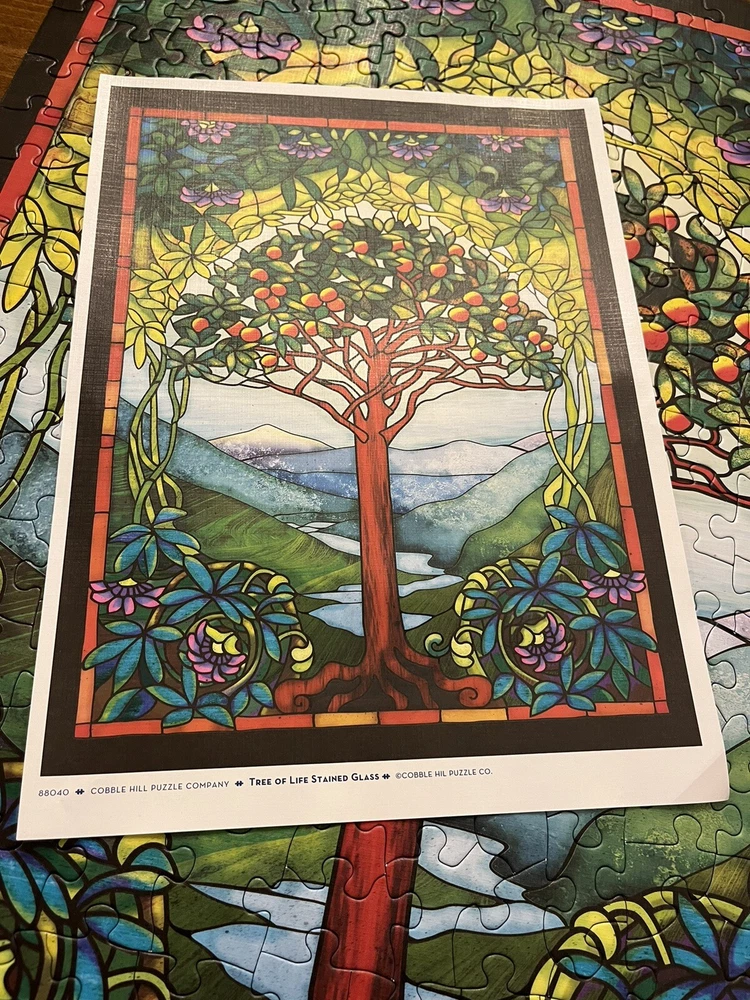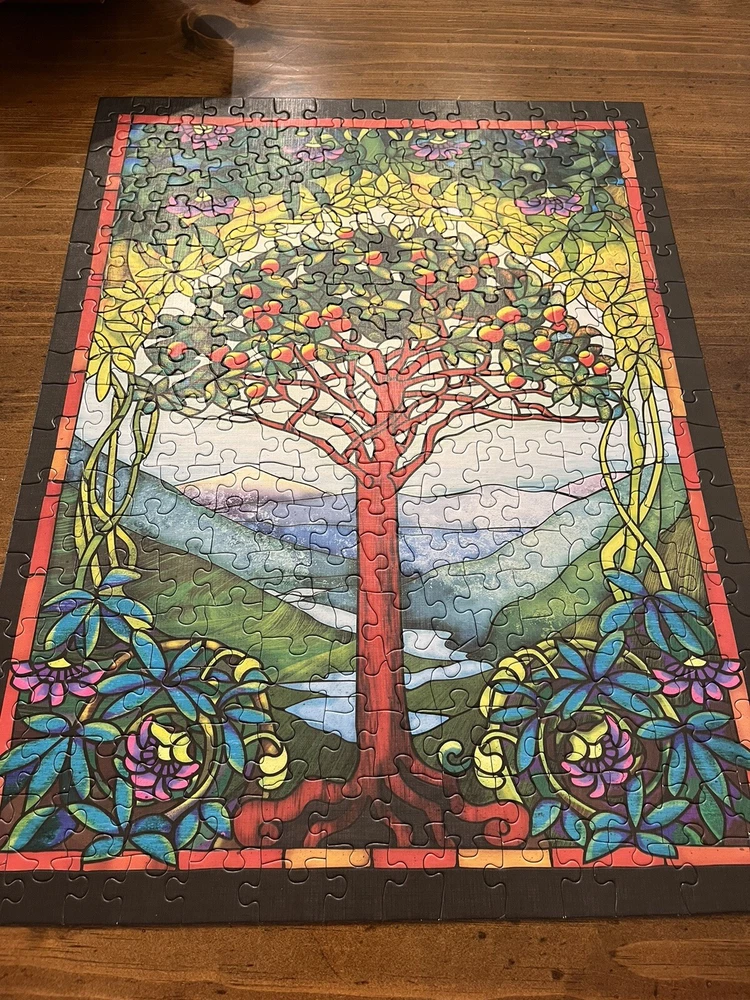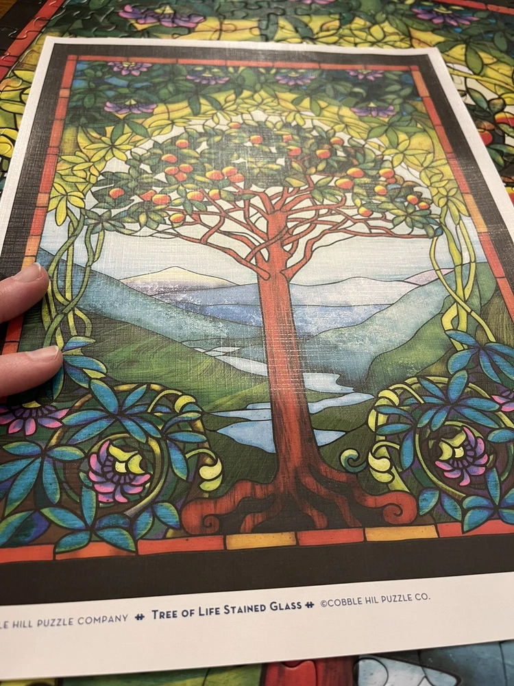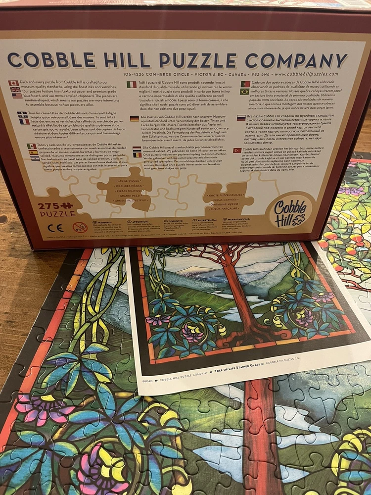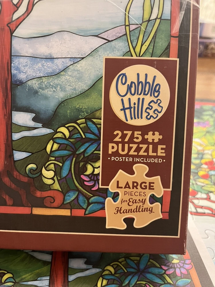 This puzzle is in good pre-owned condition. There is tape on the outside of the box. This stunning jigsaw puzzle features a beautiful piece of art that will surely captivate any puzzle enthusiast. The Tree of Life Stained Glass 275 Large Piece Jigsaw Puzzle Cobble Hill is a must-have for anyone who loves puzzles and art. With its multi-color design and tree theme, this puzzle is sure to add a touch of nature and color to any room. Crafted from high-quality glass, this puzzle is durable and will last for years to come. The puzzle contains 250-499 pieces, making it a great challenge for anyone who loves a good puzzle. The Tree of Life Stained Glass Jigsaw Puzzle is perfect for anyone who wants to relax and relieve stress while enjoying a fun and engaging activity.
