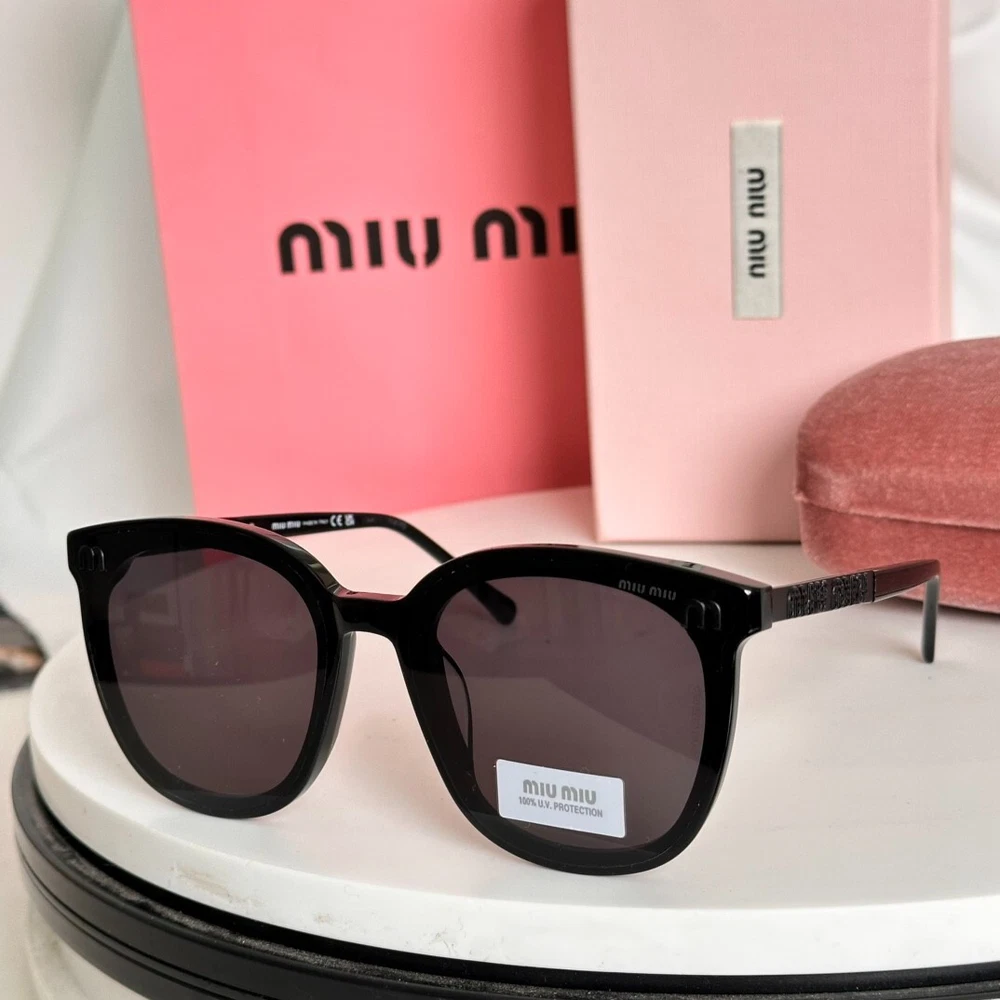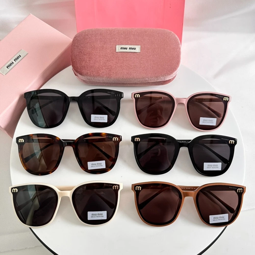 This pair of M family sunglasses, simple design without losing a sense of fashion. The pure black frame has smooth lines and a classic round outline, which can be adapted to a variety of face shapes. Dark gray lenses not only block the sun effectively, but also add a bit of mystery. Mirror leg with brand signature elements, fine details. Next to the sunglasses is M's signature pink packaging box and suede glasses box, the overall cool and handsome style, whether it is daily travel or fashion collocation, can be easily controlled.