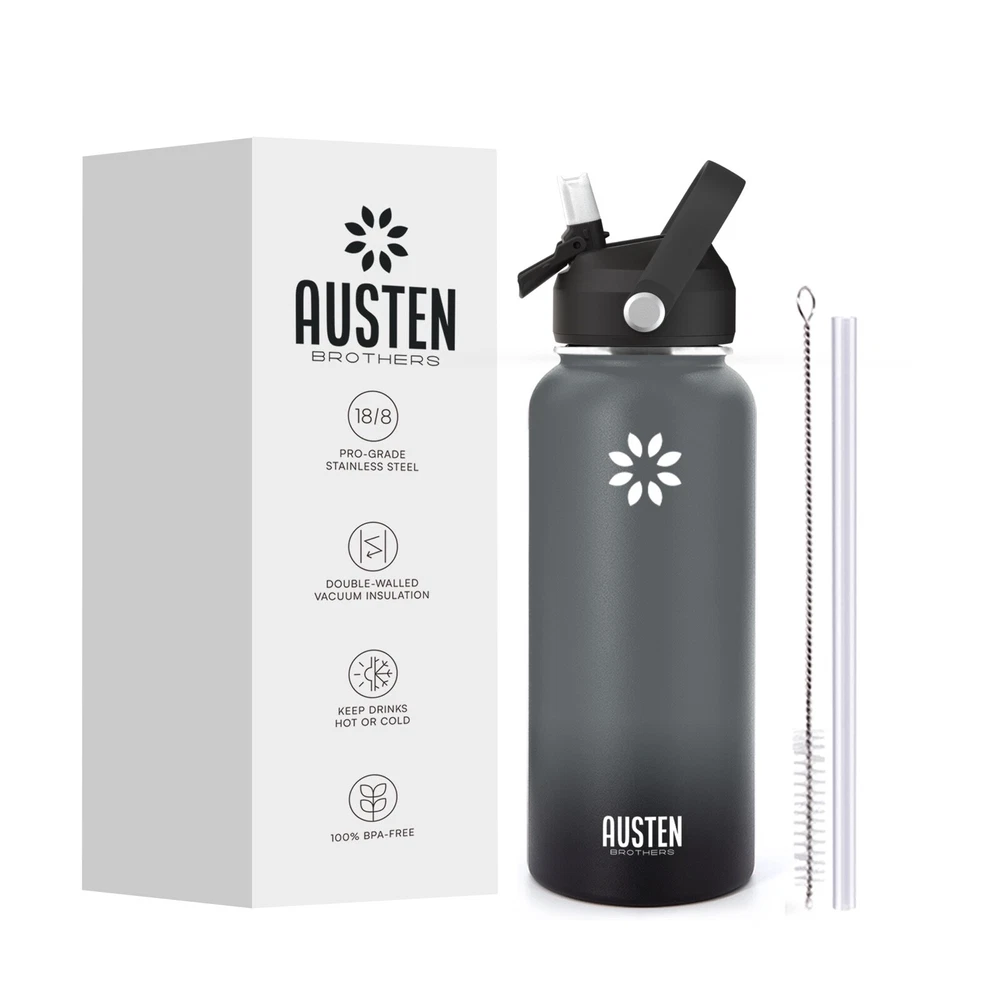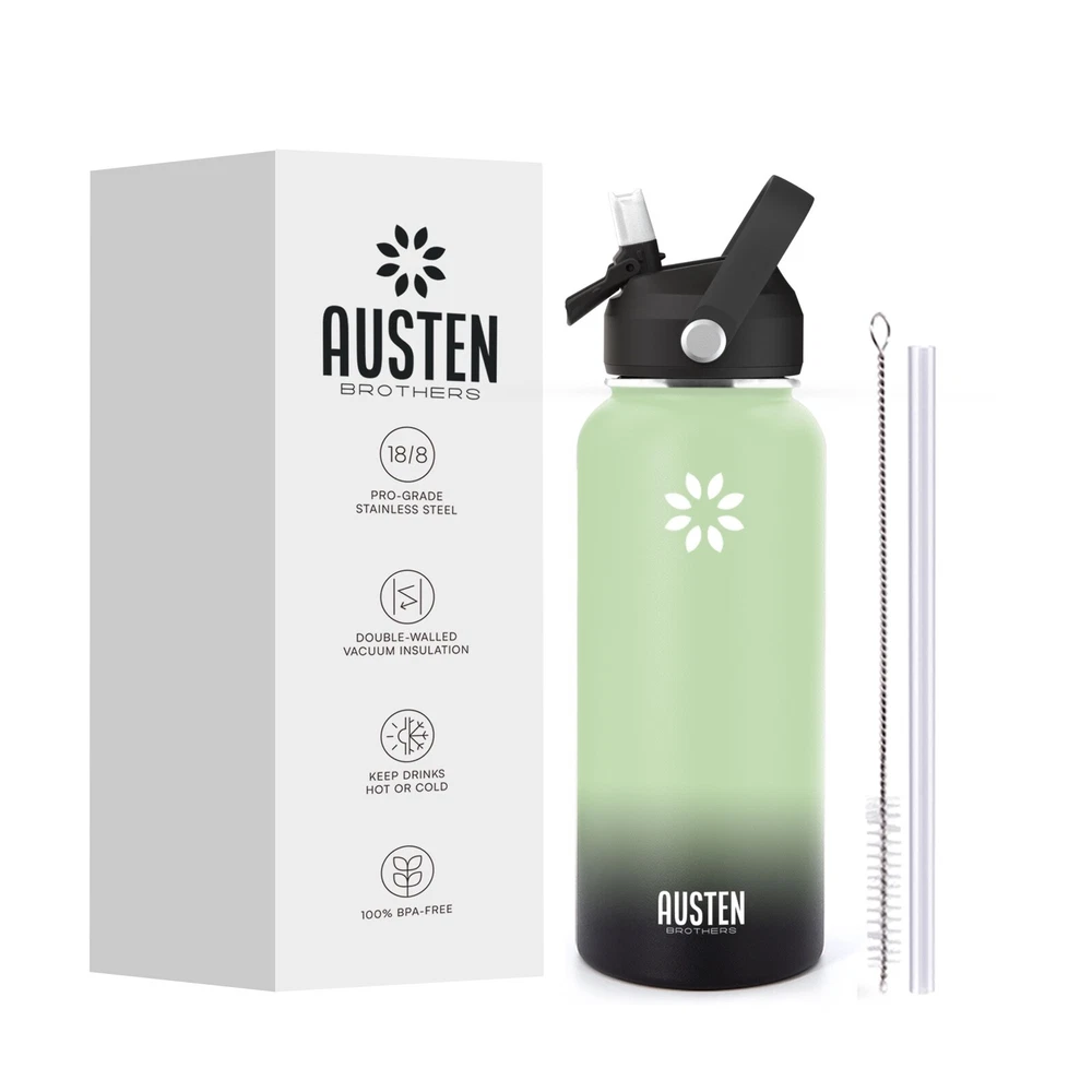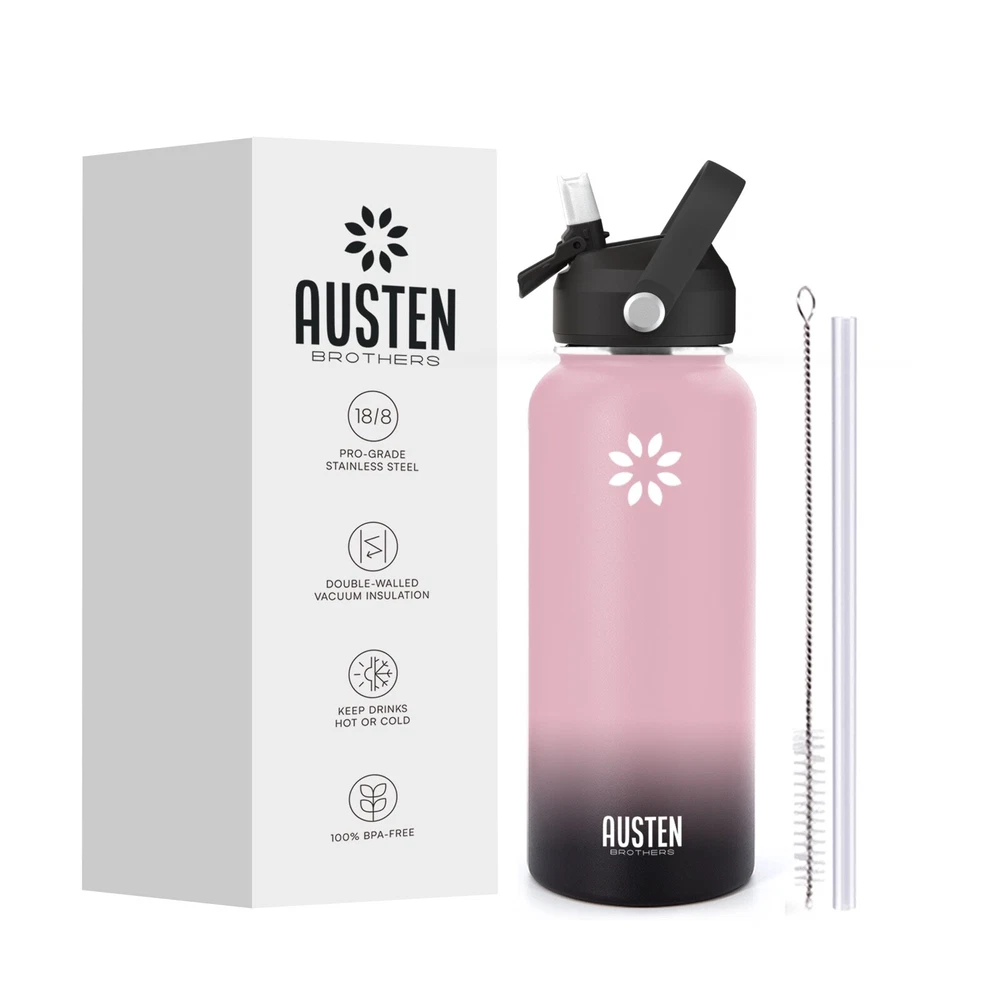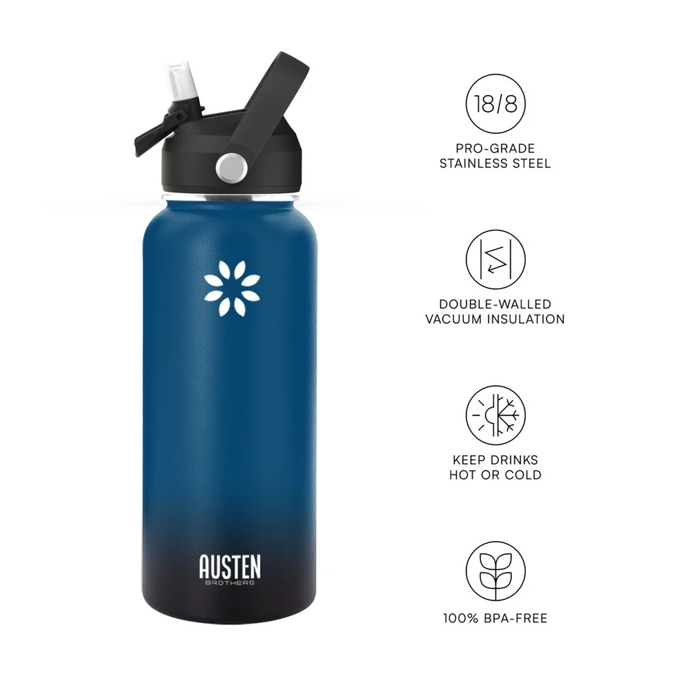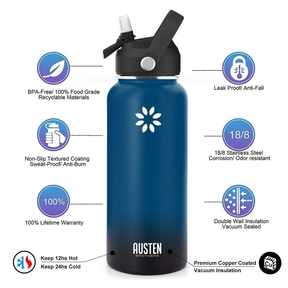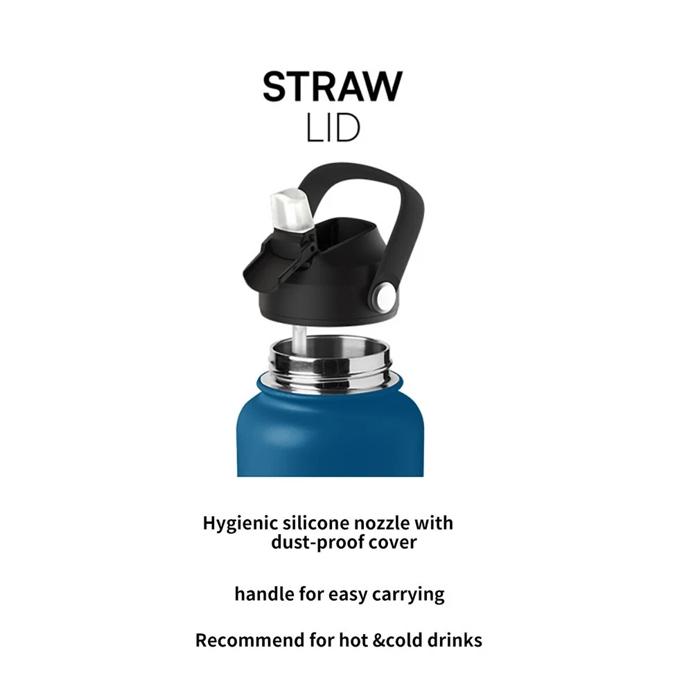 🔥Superior Material: The insulated water bottle is made of premium 18/8 stainless steel which is BPA free and non-toxic. It will never leave a metal taste or rust. The powder coating exterior finish ensures a better grip. 🔥Vaccum Insulation Proctection: The double wall insulation makes the water bottle sweat-free. Insulated water bottle is crafted with double-wall vacuum insulation technology that conduces to keep drinks warm for 12 hours and cold for 24 hours. 🔥Leak-proof and shatter-proof: The bottle is absolutely leak proof and shatterproof, making it the choice for rough-and-tumble use. BPA-free silicone rubber on each lid ensures no leak, no plastic smell. Condensation never appears on the steel bottle.It assures that you stand out with a very durable and elegant bottle. 🔥Travel Friendly: New Straw Lid with handle makes the bottle so easy to take with you no matter where you go and the straw top means no risk of spillage. It is not only suitable for your own use in many scenarios: School, family, work, gym, sports, travel, outdoor, meanwhile, its fashion appearance is also suitable for as a birthday present,Christmas gifts, for your parents wife, friends, colleagues.