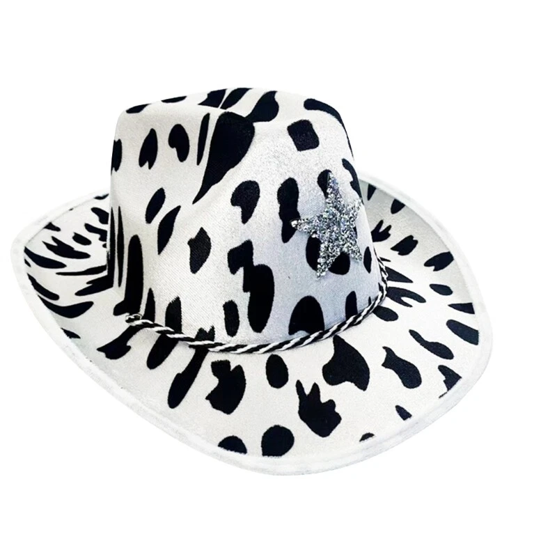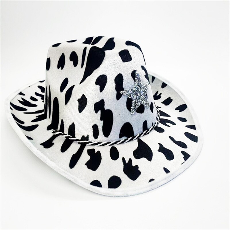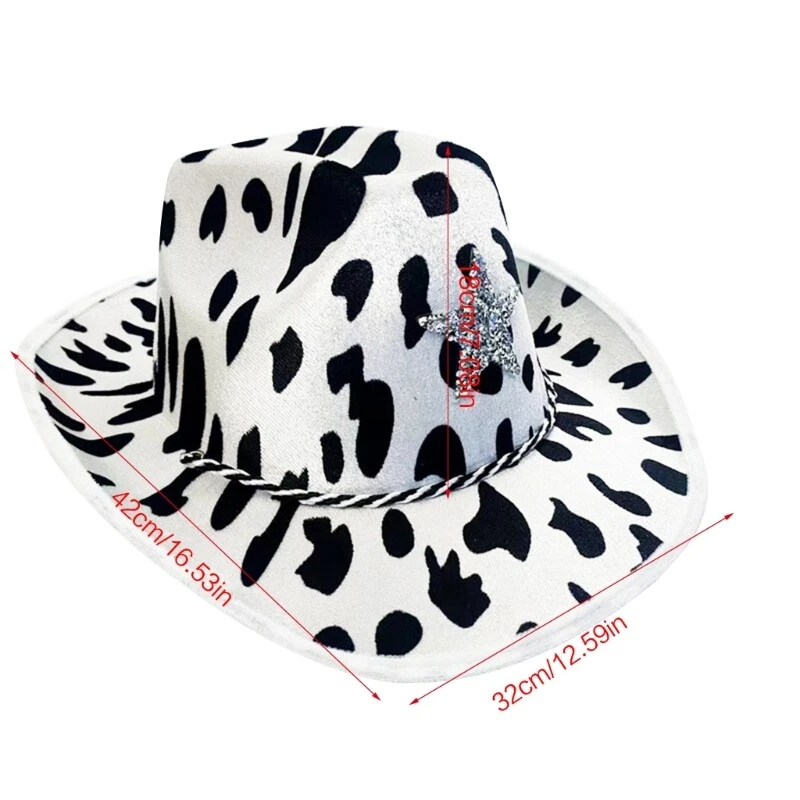 Features: Cosplay Costume Wide Brim Cowboy Hat Set: The lovely wide brim cowboy hat with fashion appearance, featured with sequin pentagram, trendy and better show the personality and highlight your unique aesthetic, heart shape sunglasses & pink handkerchief suitable use for party dressing. Cool Stylish Top Hat: Our western stylish top hat carry with wide brim, dairy cow pattern and sequin , fashion and worry of clash with others, perfect elegant clothing accessories for your cosplay party, theme parties, night club dressing accs and so many celebration occasions. Universal Size: The top hat with fashion and designed pattern, universal size, suitable and fit for mostly normal hoods circumference, before purchase please make sure your hoods covers the above size. Selected Material: The top hat use high-grade qualified polyester material, great stitching elegant sequin decoration, color printed does not easy to fade, soft and skin friendly for daily wear. Perfect Gift: Our cowboy hat unique and heart-felt fashionable accessories for your special persons, coworkers, makes sentimental surprise and great gift for birthday, Christmas, New Years Day, anniversaries, dating, cosplay party or other occasions. Specifications: Product Dimension: approx. Hat size 32x42x18cm/12.6x16.53x7.08 inch Option: StyleA(Black Hat, Sunglasses, Scarf)/StyleB(Hat) Material: Polyester Package Includes: Style-A: x Wide Brim Cowboy Hat, x Kerchief, x Sunglasses B: x Wide Brim Cowboy Hat note: Please allow 1-2cm errors due to manual measurement. Due to the difference between different monitors, the picture may not reflect the actual color of the item.
