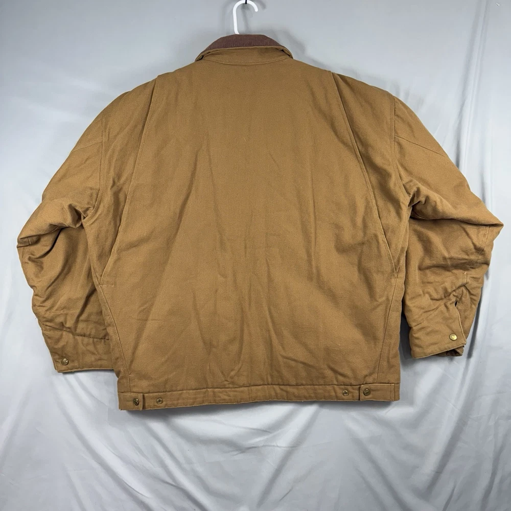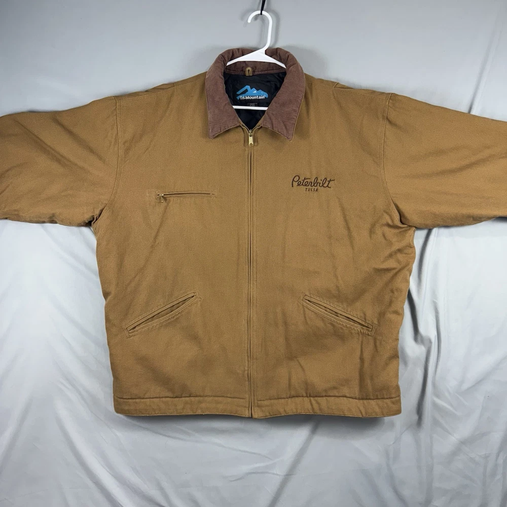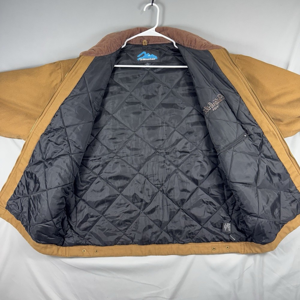 The Tri-Mountain Detroit Jacket is a brown canvas jacket for men in size 2XL. It features a full zip closure and quilted accents. The jacket is made of heavyweight cotton with a polyester lining and insulation, making it suitable for fall, winter, and spring. It has a mid-length cut and a regular fit. The jacket is designed for workwear, travel, and casual occasions. It is a classic piece with a hipster, grunge, and 80s and 90s designer style. The jacket is made in the United States.