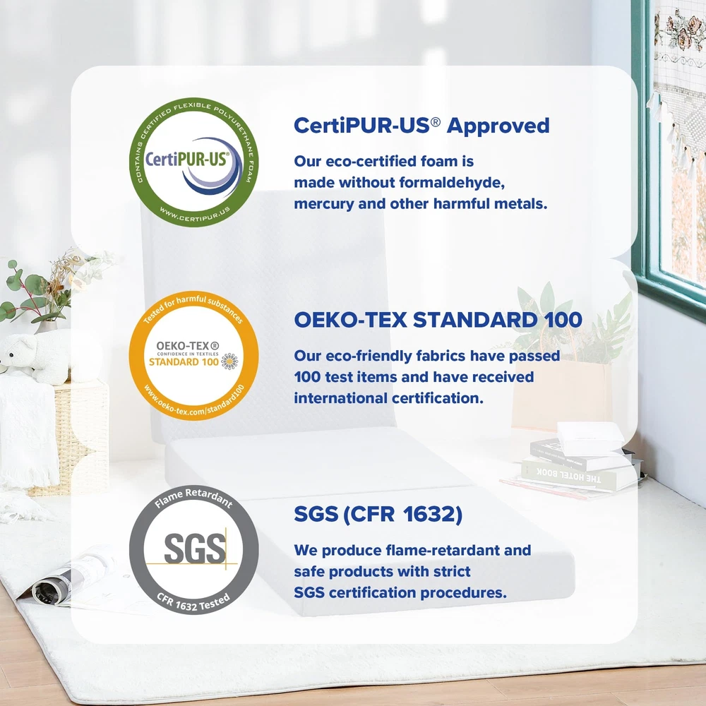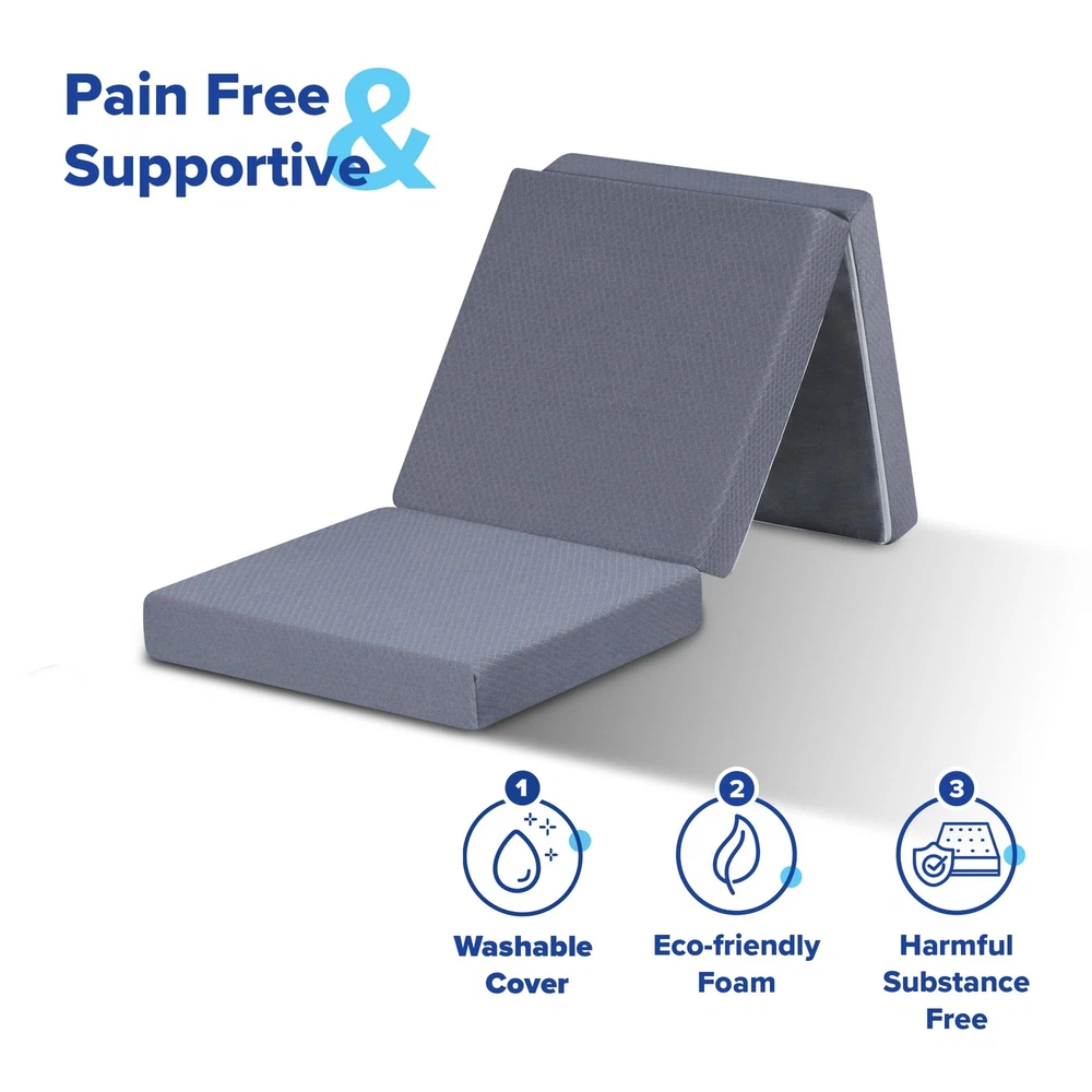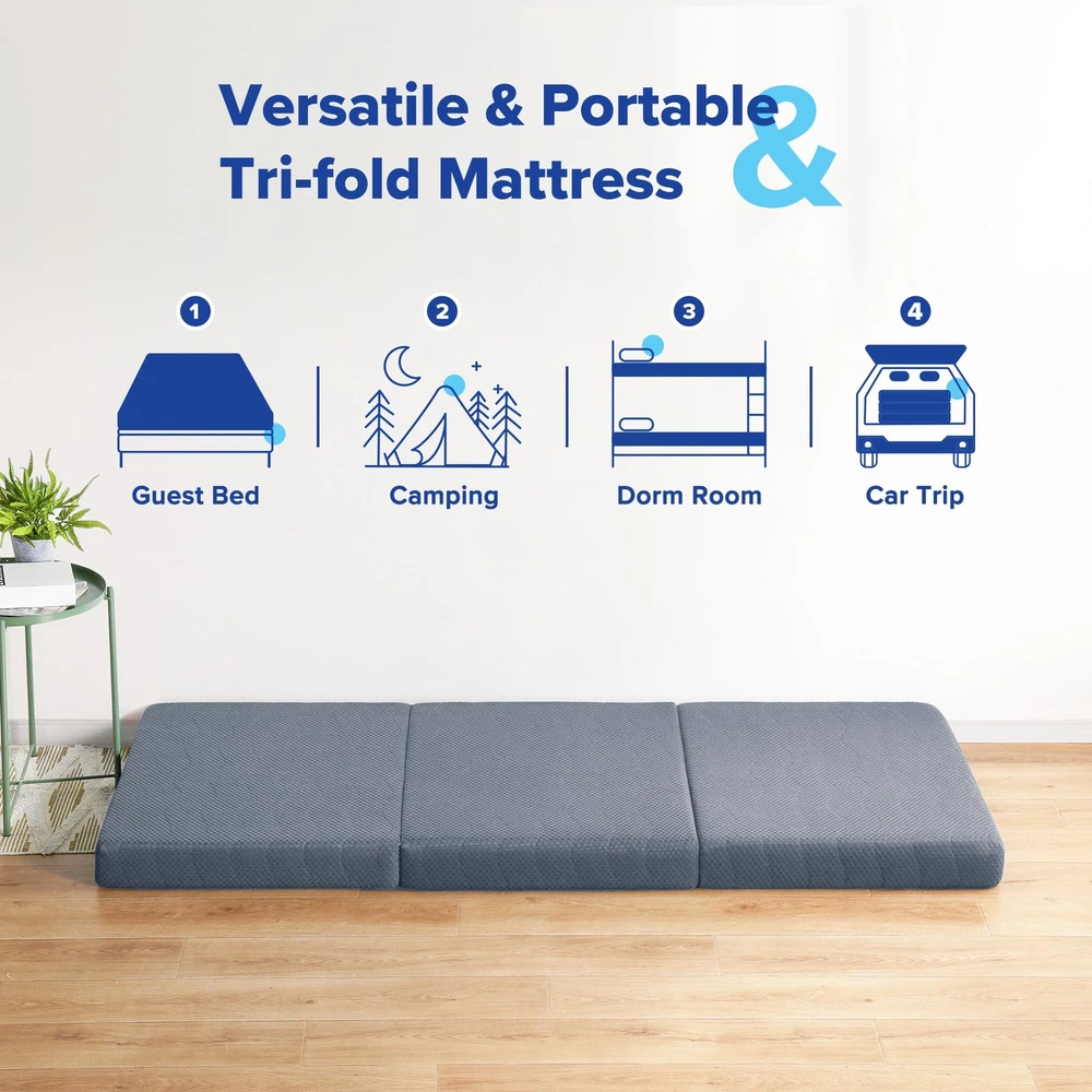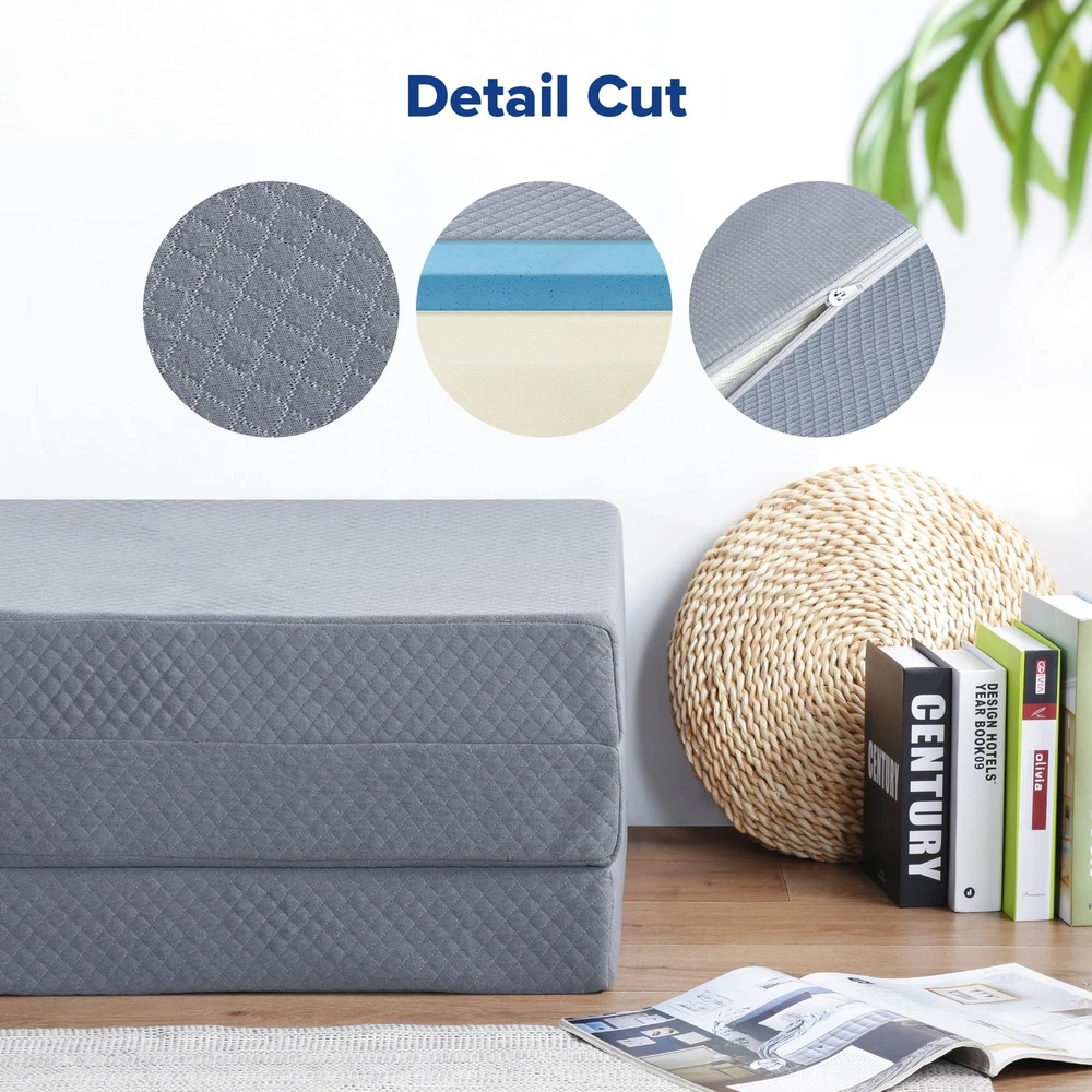 4 Inch Grey Tri-Folding Memory Foam Mattress provides the perfect solution for guests, children, camping, and more. We create a dual layer structure for maximum comfort and reliability. Cooling gel memory foam provides heat transfer and temperature regulation. Its high responsiveness allows the soft foam to quickly adapt to body shapes and movements, for pressure relief and motion isolation. High density foam gives support, maintaining the integrity. The durable, washable, polyester jacquard fabric wicks moisture and protects mattress against dust and debris, giving you the safest comfort. The folding mattress provides exceptional comfort and support. Foldable feature makes for efficient portability and easy storage. With perfect motion isolation, supportive design, and temperature regulation, 's mattress guarantees the best sleep quality you've ever experienced. 's vision is to elevate sleep experience by incorporating proprietary technologies and innovative solutions that boast exceptional quality and offer unique features. Material - Polyester Jacquard: 100% polyester washable cover provides breathability, moisture-wicking, and dust protection. - Cooling (I-Gel) Memory Foam: Cool gel infused memory foam technology designed to keep temperature cool through the night. - High Density (HD) Foam: High density foam & memory foam synergy provides enhanced support and top comfort experience. Product's Certifications - CFR 1632: Certification of mattress for standard flammability resistance. - CertiPUR-US: Certification of polyurethane foam for indoor emissions, product performance, physical durability, and environmental responsibility. - OEKO-TEX: Certification of textile product for human and natural ecosystems safety. Product comes with a 5-year Manufacturer Warranty. [ Dimensions ] - 75 x 25 x 4 inches [ Dual Layer ] - 1" Cooling Gel Memory Foam + 3" High Density Foam [ Compact & Portable ] - Foldable mattress design offers efficient portability and easy storage in all types of environment [ Multi-purpose ] - Perfect versatile bed for temporary sleeping solution, from guest bed to playroom, and from camping to road trips! [ Comfort & Support ] - Soft cooling gel memory foam adapts to body contours and regulates temperature, while durable high density foam guarantees stable support and uniform weight distribution [ Washable Cover ] - 100% polyester grey jacquard fabric resists wrinkles and enhances durability, ensuring the CertiPUR-US certified mattress topper is both breathable and protected against moisture, dust, and debris [ Bed-in-a-Box ] - Smart shipping & delivery with vacuum-sealed packaging technology. Please allow the product to rest in room temperature for 72 hours to fully expand and recover