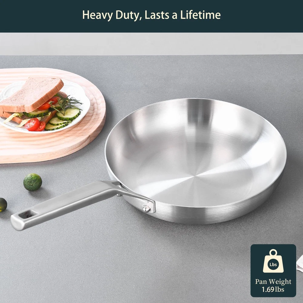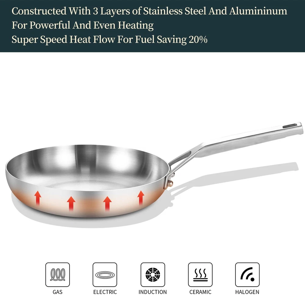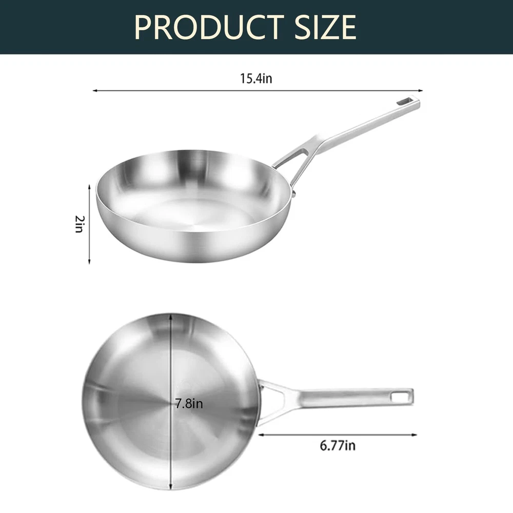 【Built for Durability】 Tri-ply construction 8 inch stainless steel frying pan is made with a responsive aluminum core pressed together with 2 layers of durable stainless steel all the way around the surface, for fast and even heating. Super speed heat flow for fuel saving 20% 【18/8 Food Grade Stainless Steel Interior】 18/8 food grade stainless-steel cooking surface,safe to contact with food . All of products are tested by SGS in the U.S. ,all meet the U.S. FDA Testing Requirements 【18/0 Magnetic Stainless Steel Exterior】Heat conduction magnet ,compatible with all cooktops 【Suitable for All Stove】egg pan skillet triply Works on all cook stove tops, include induction, gas, electric, halogen, glass, and ceramic. dishwasher safe for an easy clean up 【Ergonomic Stay Cool Handle】Hollow Handle Design to Reduce Heat Transfer, Hainging Hole ( Save Storage Space)