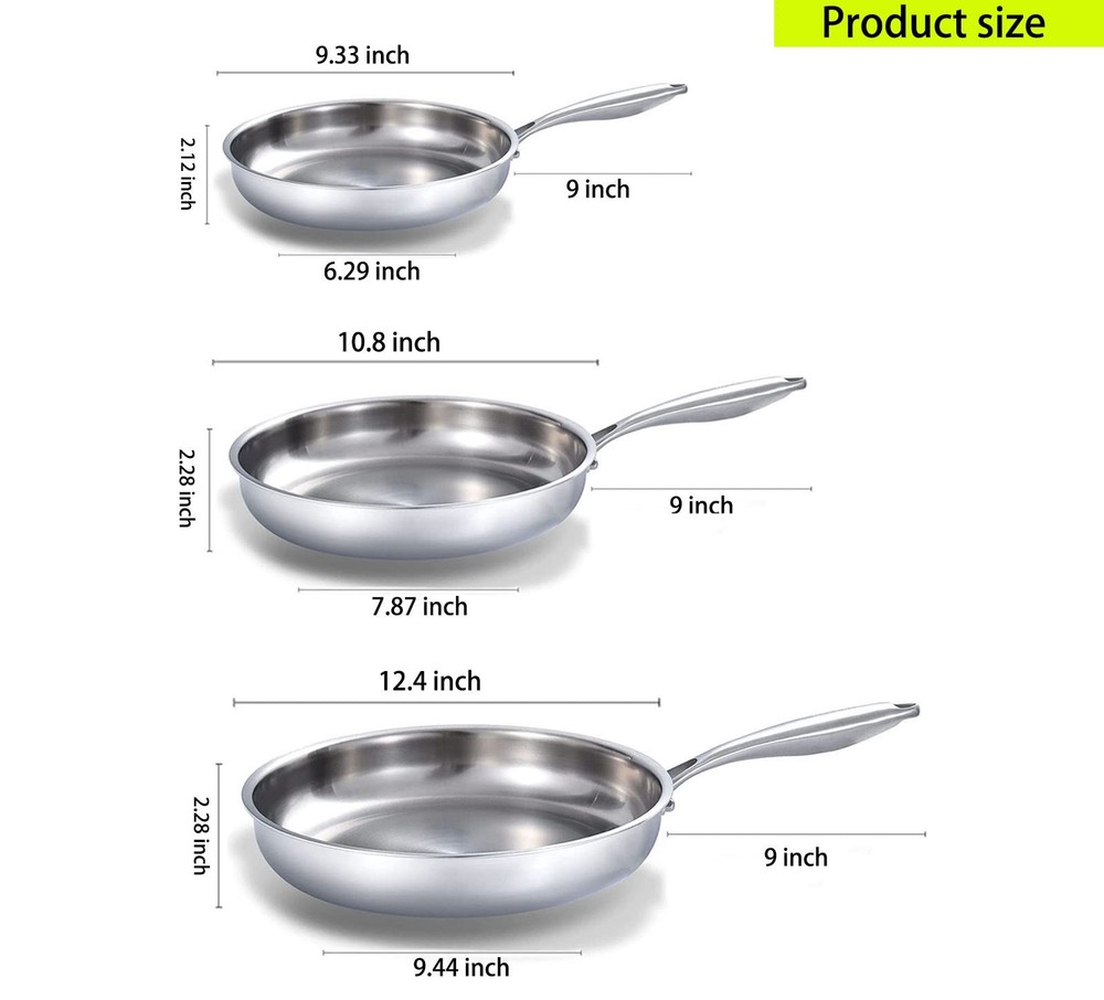 Our collection offers a wide range of options to meet all your cooking needs. You can choose from the pots and pans set non stick for easy cleaning, the classic pots and pans set for versatile use, or the durable stainless steel cookware set. The stainless steel pan is a popular choice, along with various types like the frying pan, pan, pan set, and skillet. We have skillets and frying pans in different sizes and designs. Whether you need a cooking pan for daily meals or a specialized omelette pan, we've got you covered. Our stainless steel pans come in various forms, such as the stainless steel pan with lid and the stainless steel pan set. The frying pan set and fry pan are also available for your convenience. The cooking pan set ensures you have all the essentials. Our oven safe skillet and stainless steel frying pan with lid add more functionality to your kitchen. The stainless pan and steel pan are reliable choices for any chef. Explore our skillet set and steel pans for cooking to enhance your culinary experience. 【Reliable Cookware Partner】The Frying Pan Set of is PFOA-Free and SGS Certified. Each Pan And Pot Of Heats Quickly And Spreads Heat Evenly Because Of Our High Level Of Material Control. The Tri-Ply Stainless Steel is Fully Bonded to The Rim for Durability 【Efficiently & Energy Saving】In , Energy Saving Is Not Just A Slogan But Truly Happened! Tri-Ply Stainless Steel Pan Set Heats Quickly and Spreads Heat Evenly, Will Spend 20% Gas Or Electricity Less That You Have Spent In Cooking Before 【Professionally Design】Stainless Steel Skillet Set Features Outer Riveted and Stay Cool Handle Design. The Good Grips Handle Which Provides A Confident Grasp And Remains Cool-To-Touch While Cooking Over Induction, Ceramic, Electric, Or Gas Cooktops. Take It Directly From Stove To Oven 【Practical and Elegance】Tri-Ply Stainless Steel Pan Combines Ergonomic Cookware Design and superior features for optimal cooking performance. The rounded and encapsulated rim for drip free pouring and easy transfers,Rivet-free surface to eliminate food traps 【Family Approved】Highly Polished 18/10 Food Grade Cooking Surface Won’t React with Food. Oven and Broiler Safe Up To 600˚F. Fully-Clad, 3-Layer Metal Construction Delivers Performance And Durability For Years to Come