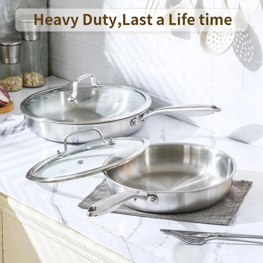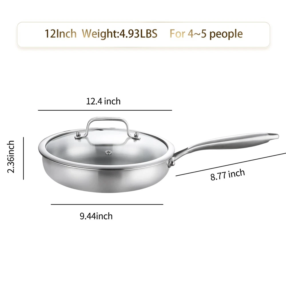 【Compatible with All Cooktops Up to 600℉, Glass Lid 300℉】 【ENTIRE FULL CLAD 】Tri-Ply Stainless Steel Pan Efficient Allows Heat to Pass Through the Entire Pan Fast. Please Do Not Heat the Empty Cooker. Suggest Cooking with Medium-Low Heat 【EFFICIENT EVEN HEAT】Frying Pan Combines 304 Food Grade Stainless Steel, an Aluminium Core, and 18/0 Outer Stainless Steel. Skillets and Frying Pans Allows Heat to Pass Through the Entire Pan, Bottom to Sidewall, with Quick & Even Heat 【ENERGY SAVING】Frying Pan with Lid Can Save Fuel By Up To 20%. Efficient Heating, Energy Savings Make It a Great Choice for Cooks Seeking Both Performance and Savings. The Fully-Clad, 3-Layer Metal Construction Delivers Performance and Durability for Years to Come 【NON TOXIC】12 inch Pan's 18/10 Stainless Steel Cooking Surface Won't React with Food to Alter Natural Tastes, Delivers Fresh, Flavorful Results. 12 inch Frying Pan also has More Surface Area than the Average 12 inch Skillet on the Market, Providing a Wider Cooking Space 【DURABLE & HEAVY DUTY】Fully Clad 12 inch Stainless Steel Frying Pan is Not Only Durable and Heavy-Duty But Also Enables Its Body to Withstand a High Temperature of Up To 600°F. The Sturdy Hollow Handle Design Reduces Heat Transfer. The Clear Tempered Glass Lid Stays On Tight, Making It Easy To Monitor Your Meals at All Times.Featuring a Steam Vent For Safety, And a Sturdy Hollow Handle Design To Reduce Heat Transfer 【PRACTICAL & CLASSIC】Induction Frying Pan 12 inch Features a Rounded and Encapsulated Rim, which Enables Drip-Free Pouring and Easy Transfers. 12 in Skillet Supports Various Cooking Methods Ranging From Stove to Oven. Moreover, It has a Rivet-Free Surface to Eliminate Food Traps and is Easy to Clean and Dishwasher Safe 【WIDELY APPLICABLE 】Fully Clad Stainless Steel Pan is Suitable for Cooking Methods Such as Frying, Stir-Frying, Steaming, Baking and Searing. Triply Cooking Pans Well-Suited for Both Family Kitchens and Commercial Kitchens