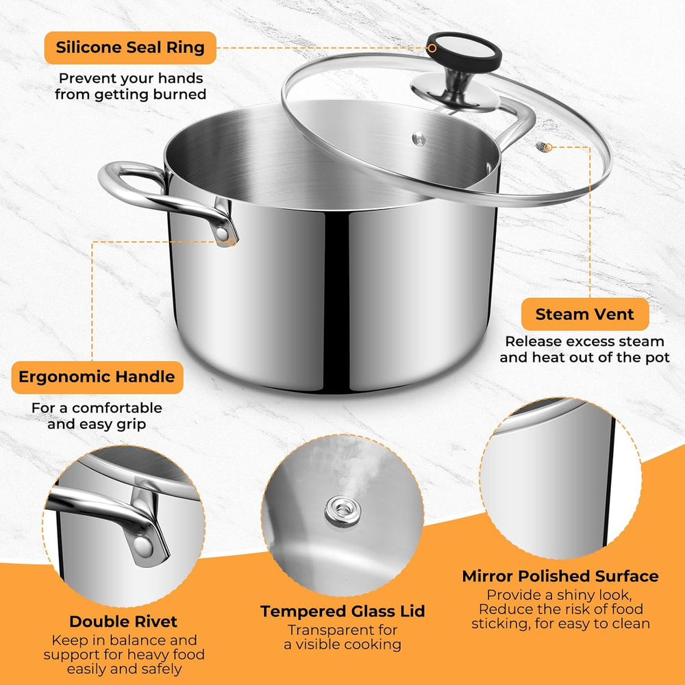 Store New Arrivals Add to Favorite View Feedback Contact Tri-Ply Stainless Steel Stock Pot, 6.5 Quart Heavy Duty Induction Cooking Pot with Visible Lid for Pasta, Soup, Spaghetti, Sturdy & Double Handle, Dishwasher Safe Description Item model number SSP-013 Product Dimensions 5.59"D x 13.94"W x 8.11"H Capacity 6.5 Quarts Number of Packs 1 Color Silver Material Stainless Steel Item Weight 2.4 Kilograms Is Oven Safe Yes Finish Type Polished Is Suitable For Stovetop Yes Size 6.5 Quarts Tri-Ply Stainless Steel Pot: Stainless steel stock pot which made of premium material is non-toxic and food-grade, No harmful material releasing to your food whether at high temperature or not, Tri-ply pot consists of 18/10 stainless steel interior (ensure food-grade quality), aluminum core (for an even heating) and magnetic 18/0 stainless steel exterior. Induction Pot For All Stovetops: This stock pot allows for even heat distribution, making it compatible with all stovetops, including induction, gas, ceramic, electric, halogen, etc. It is also dishwasher safe and oven safe to 500℉.(Glass Lid up to 350℉) Elegant Handles and Glass lid: Designed with style in mind, these ergonomic handles not only offer a comfortable grip and stay cool while cooking but also add a touch of elegance to your kitchen. Smooth handles are ergonomically designed and securely fastened with rivets for easy and safe pouring or moving. Glass lid with steam vent allowing you to check the heat and moisture levels during the cooking process. Easy to Clean & Maintain: Mirror-polished interior/exterior repels stains and simplifies scrubbing, This stainless steel soup pot with lid is dishwasher-safe for hassle-free cleanup and freezer-safe for batch cooking storage, The seamless design to prevent residue buildup. Versatility with Large Size: Our soup pot features 6.5-quart large capacity, Ideal for family use, Great for cooking, steaming, simmering, and roasting, Perfectly fit for various stoves, such as gas, electric, induction, ceramic, glass and halogen stovetops, Also oven safe up to 500℉(except lid). You can use the large pot to process ingredients for making kinds of recipes. Product description ABOUT US We offer the best prices around on high quality products. Our E-store includes media such as books, movies, music and games while offering electronics, toys, sporting apparel, clothing, tools, general home, garden items and more. SHIPPING We are always working hard to ensure your package arrives as soon as possible. Please understand that some factors like weather, high postal traffic, and the performance of shipping companies are outside of our control. We offer free shipping to the lower 48 states and ship within 2 business days of payment, usually sooner. We do not accept P.O. Boxes. Please provide a physical address. For shipping outside of the continental USA, we only use eBay's Global Shipping Program.The item is shipped to KY and then sent to the rest of the world. International customers are responsible for all duties and taxes. Continue to check out in order to calculate costs for shipping the item to your country. Messages regarding eBay's Global Shipping Program MUST be directed at eBay EXCLUSIVELY. RETURNS We offer a 30-Day Return Policy on items which you are not completely satisfied with. You have the option for a full-refund or an exchange of the item. No returns are available on items shipped outside of the USA. PAYMENT We accept PayPal. CONTACT US This page content is yet to come Please ad us to your favorite seller and visit again later Thank You CUSTOMER SATISFACTION We try our very best to make sure every customer is completely satisfied. If there's a problem, message us! We're happy to help. WE ACCEPT Copyright © 2021 AutoDS. | All Rights Reserved