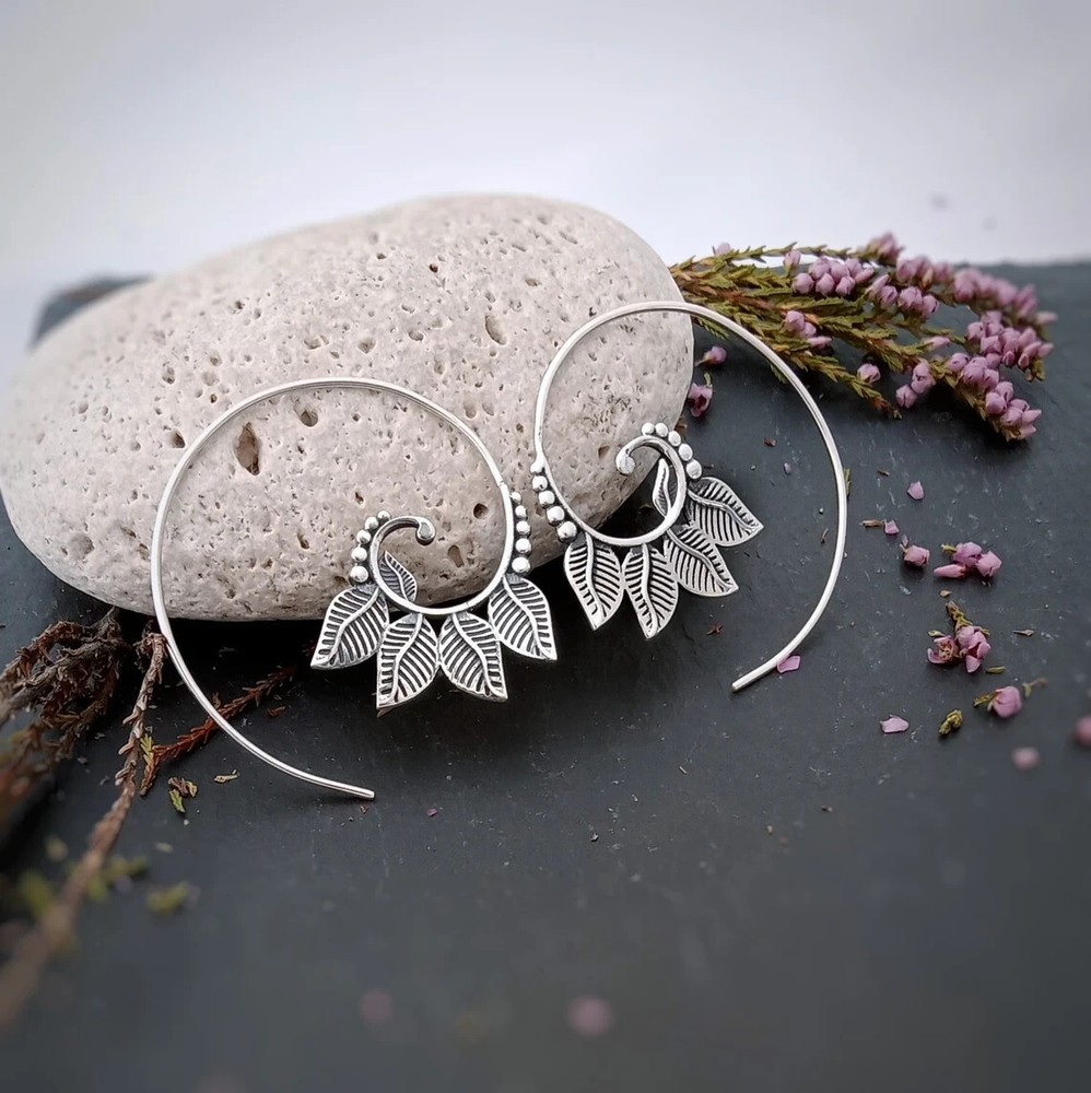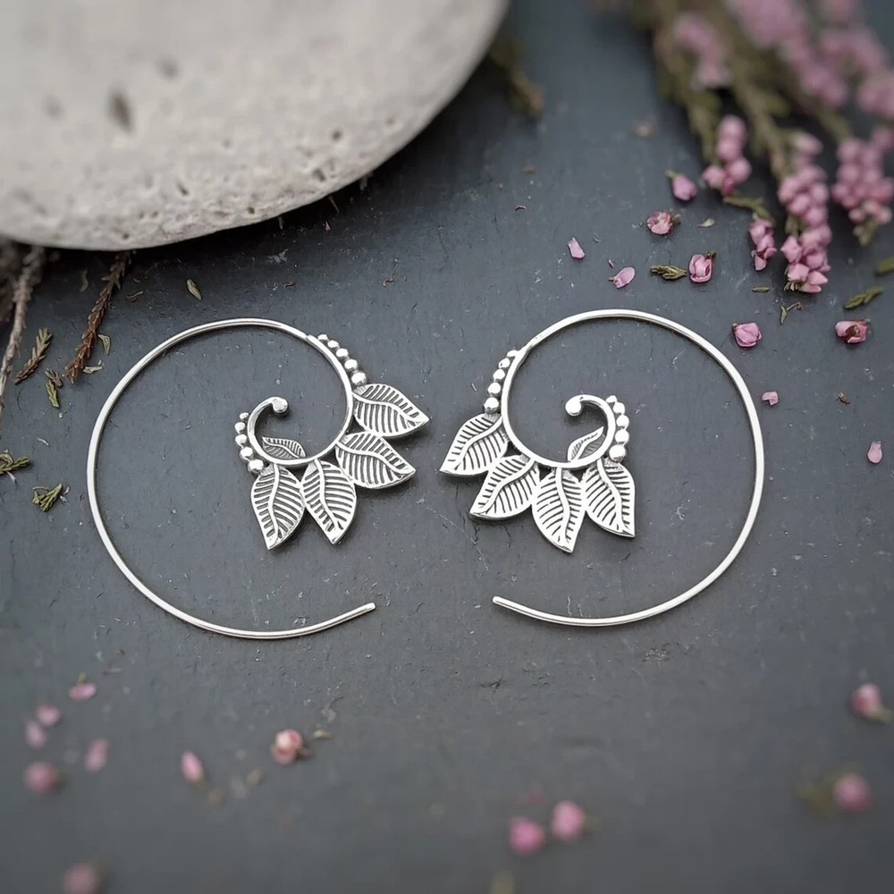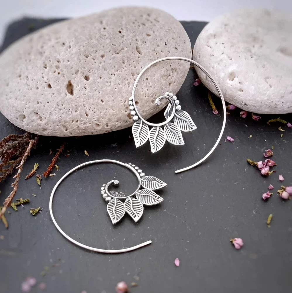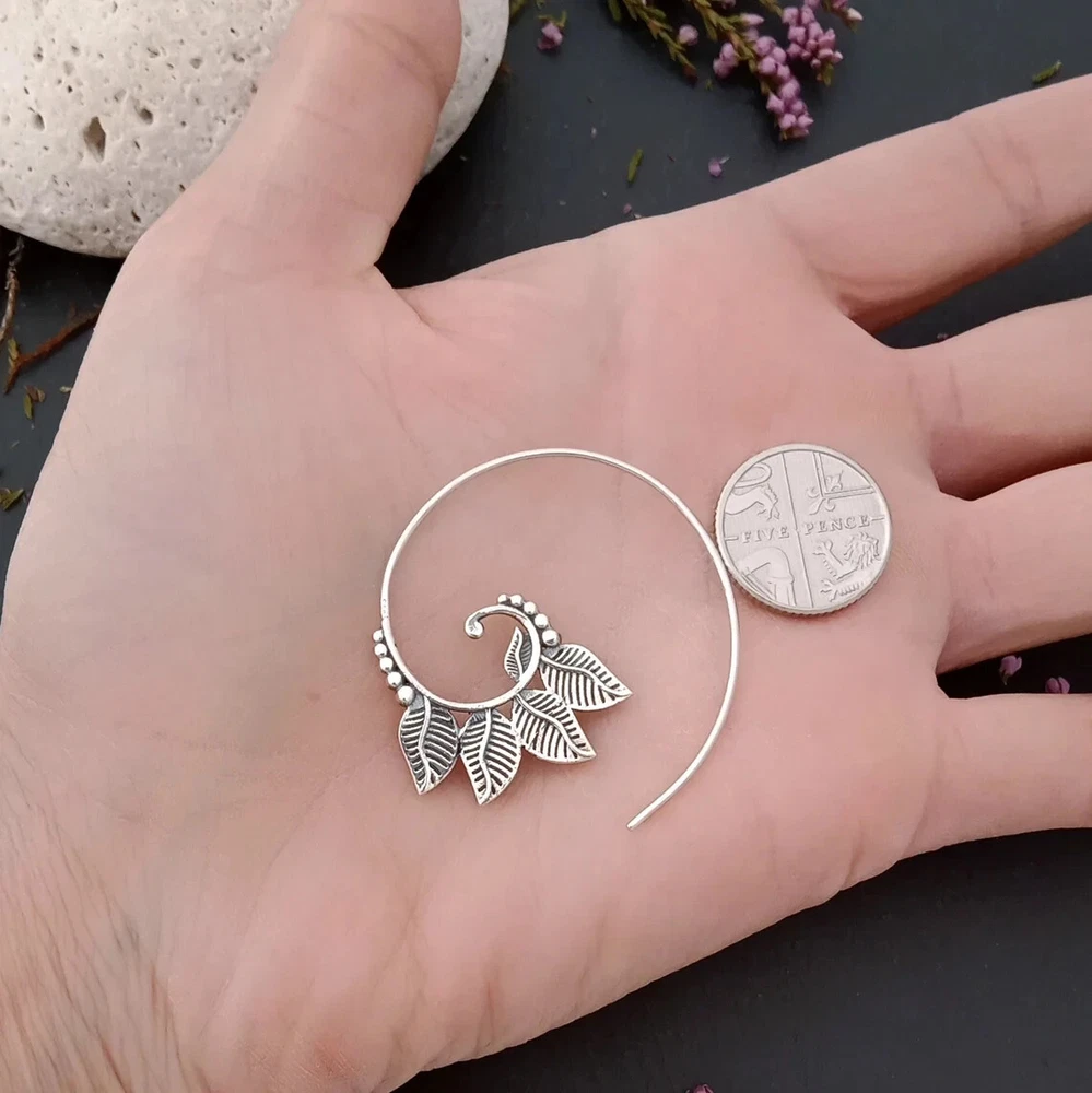 Leaf round spiral threader earrings in sterling silver. Nickel FREE These hand crafted spiral earrings are inspired by a Tribal Indian design. They are a beautiful ornate pair of earrings with a stunning Leaves design, intricate pattern for all nature Lovers! These light weight earrings are easy and comfortable to wear, remind us Fantasy and Elf stories. They are the perfect Spiral earrings for Festivals and Parties in the Nature. Don't miss them! Dimensions: Spiral Diameter: 3.5 cm Weight: 4.7 grams per pair SOLD ONLY IN PAIRS! Delivery Information All items dispatched from the UK. Item will be carefully packaged in eco-packaging to safeguard it during delivery and with our branded satin pouch ready as a gift. Standard Tracked 48 Shipping with Royal Mail or Yodel included FREE . Tracking number details will be sent after dispatch (which is usually within 1 working day of purchase. Weekends/festivities excluded). Faster shipping options also available for the UK. Worldwide shipping available with Royal Mail Tracked & Signed. Returns accepted within 14 days of receipt. At customers’ expense.