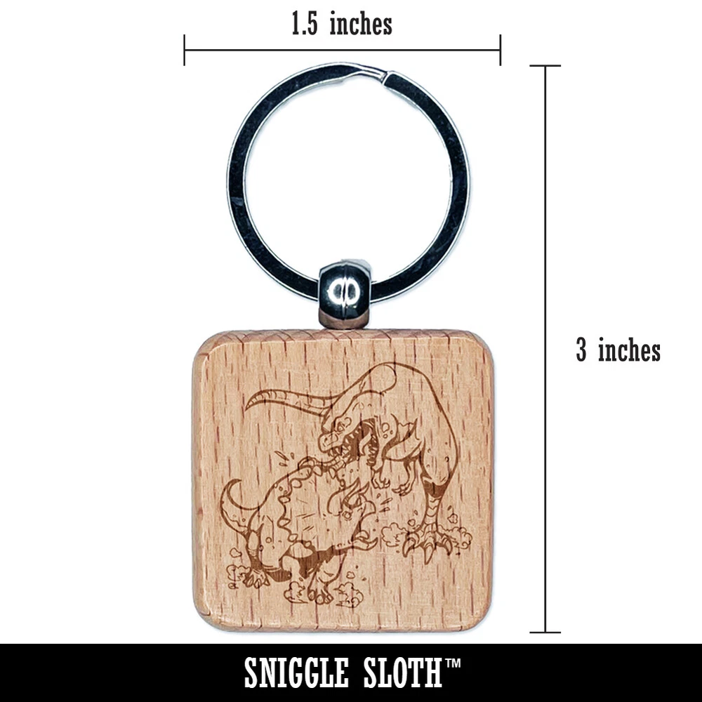 Triceratops and T-Rex Dinosaurs Fighting Engraved Wood Square Keychain Tag Charm