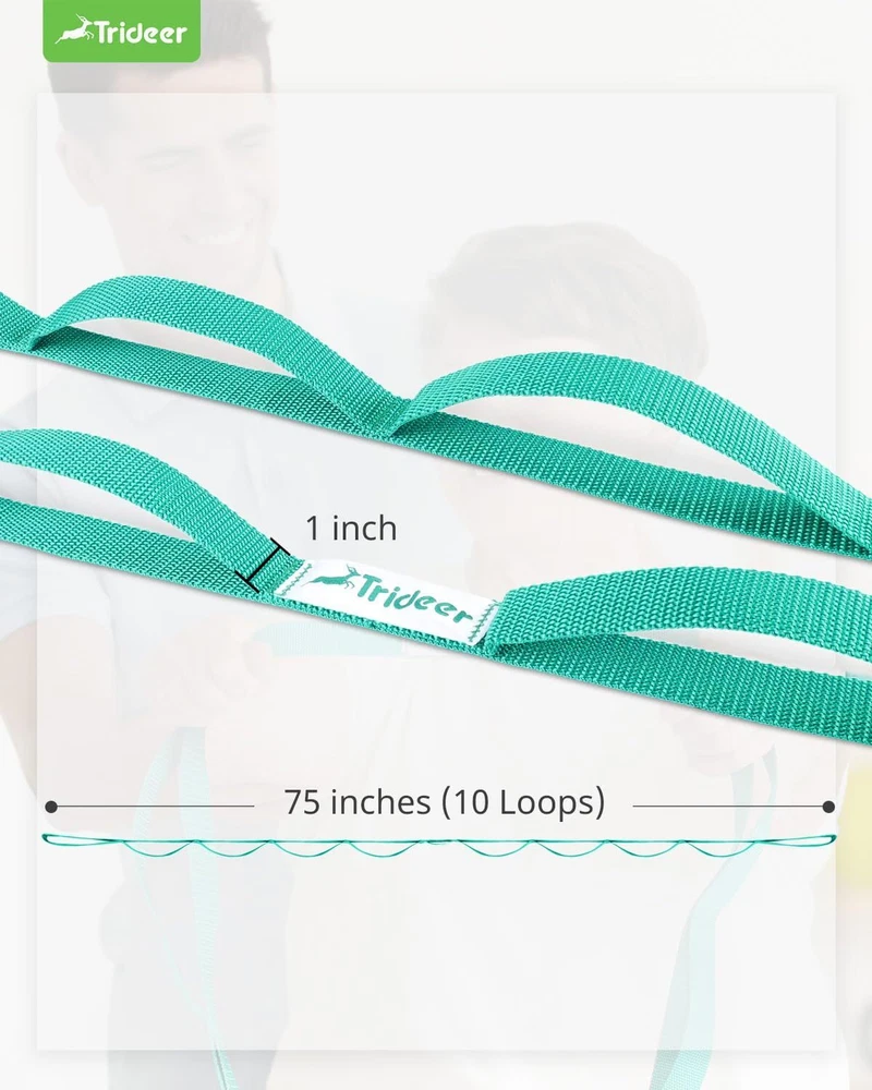 Trideer Stretching Strap Yoga Band for Physical Therapy, 10 Black Product Details Brand: Trideer Material: Polyester Color: Black Style: Stretch,Yoga Product Dimensions: 75"L x 1"W Manufacturer: Trideer Item Package Dimensions L x W x H: 12.99 x 4.17 x 0.67 inches Package Weight: 0.11 Kilograms Item Dimensions LxWxH: 75 x 1 x 0.04 inches Brand Name: Trideer Brand: Trideer Material: Polyester Color: Black Style: Stretch,Yoga Product Dimensions: 75"L x 1"W Boosts Post-Knee Surgery Recovery: Essential PT-recommended prop. Regain knee ROM, strengthen muscles, reduce pain. Safe, steady pull for optimal results. Be your own therapist Strong Fabric and Safe Use: Non-elastic strap, no fraying, ripping. Solid stitching withstands daily use. Premium fabric for comfort, won't dig into skin. Perfect for PT, safe & durable 10 Loops for Easy Hold: 75"x1", fits all sizes. Non-slip design ensures secure grip. Ideal for total-body exercises, all fitness levels. Say goodbye to D-ring adjustments, unwrap hassle. Alternate legs seamlessly, quick release for PT Simple Stretches for Busy Lives: Instant relief at home/office. Stretch shoulders, calves. Avoid costly chiropractors. Chic strap for pain/tension relief. Fits busy schedules Fits All Fitness Styles: Versatile, light, packable strap for yoga, Pilates, PT, gymnastics. Perfect thickness for ballet strength and flexibility. Loops ensure proper form, prevent injury.Enjoy stretching anywhere Great after-Sales Service: If you encounter any problems or product malfunctions during use, you can always contact our customer service team, and we will be happy to answer and solve your questions