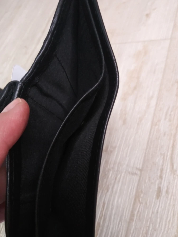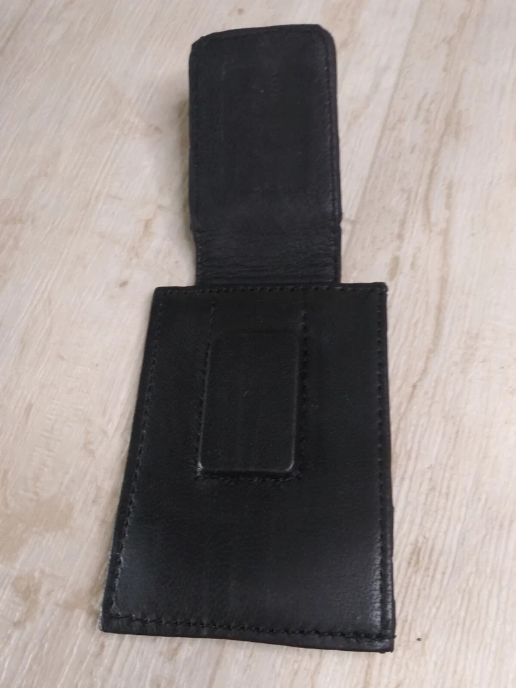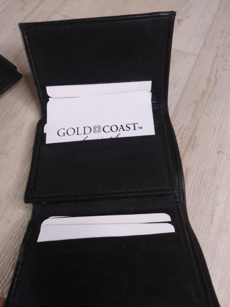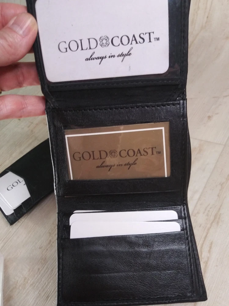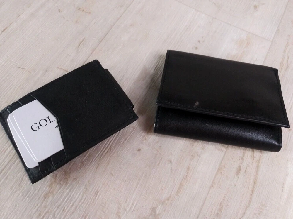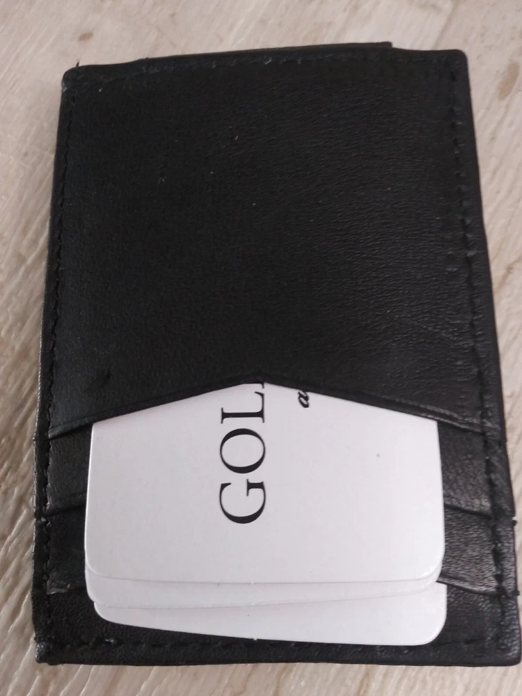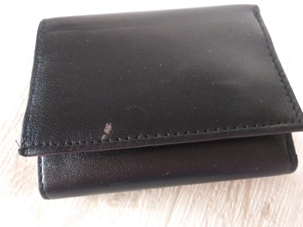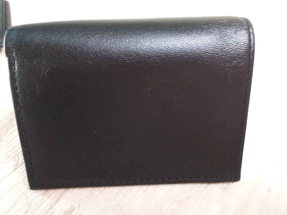 New Black Leather Trifold men's wallet and money/card magnetic clip. There is a little worn spot (defect) see photos but not noticeable if folded with the defect on the inside. Has original package.