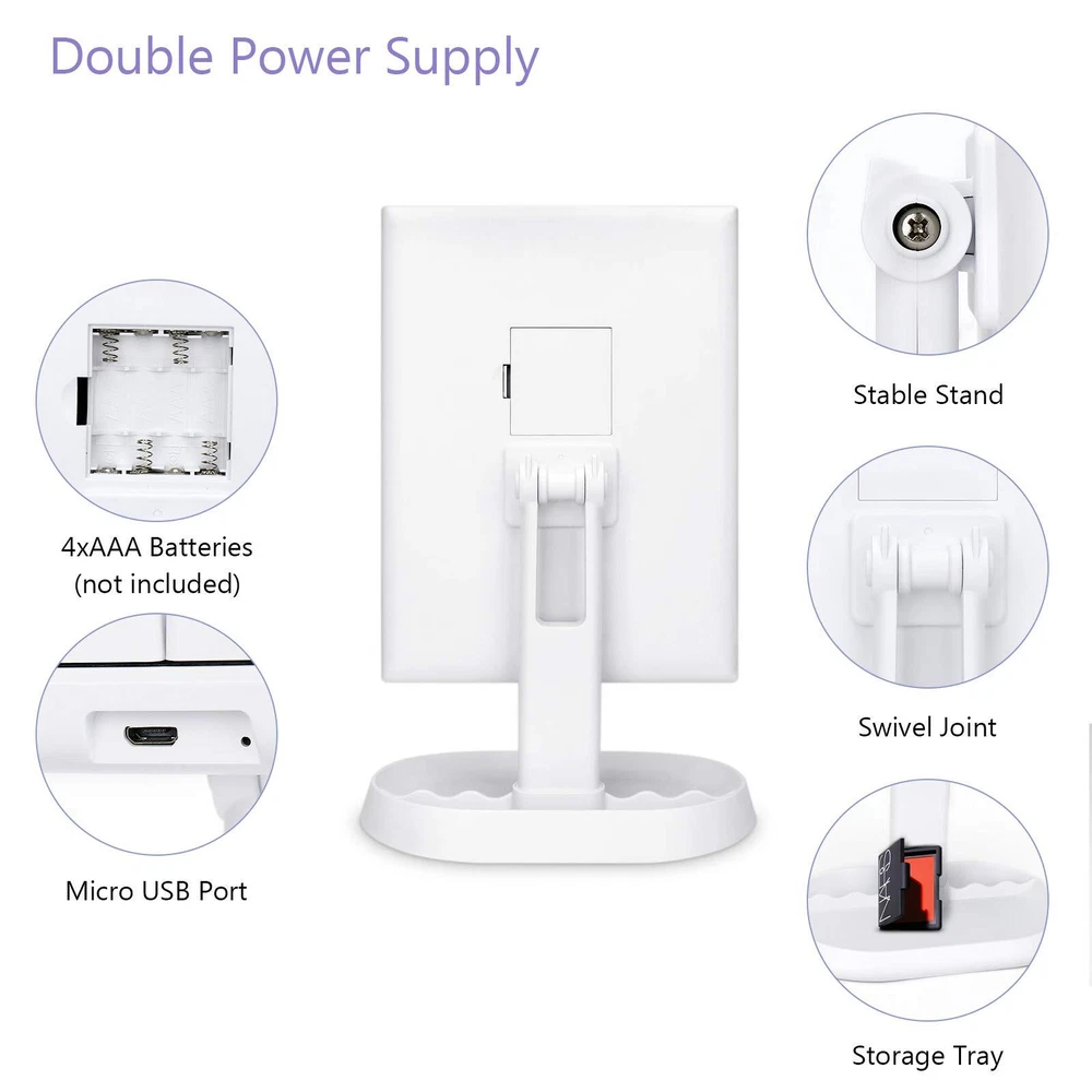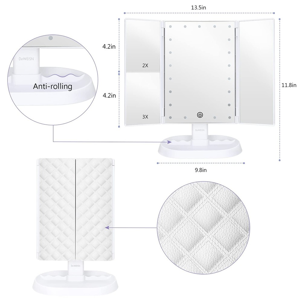Product Description Color:white Mirror Features: Sleek look and magnification. So convenient to take with you to anywhere,in the pub or car or the darkness, Lighted makeup mirror can help you makeup any time. Base recess can hold Jewellery cosmetics:earrings, bracelets, etc. Perfect gift for ladies and girls in Holiday Days, Birthday, Party, Special occasions etc. Specification: * 3x/2x/1x Magnifying * Frame material: ABS * Product Size: 12.3*8.9*2.6 inch-- The entire height is 12.3" tall. Middle mirror is 9.5"x 7"and Double Side Mirror Dimension is 9.5"x 3.2" * Net Weight:0.9kg * 80 degrees rotation. LED lights: 21pcs LED, high brightness LED control: Touch Screen ON /Off Power: USB chargeable or 4pcs AAA battery powered (battery not included) Voltage: Only fits with power adapter DC5V/0.5A-1A-2A or you can connect with your other devices like PC, power bank with standard usb interface. Switch: touch switch , when you do not need it, pls turn off to save electricity. We are concerned about every customer, if you have any questions, please don't hesitate to contact us. Package Include: 1x Mirror 1x USB Cable 1x User manual Please Note 1.Do not power it by USB charging and battery at the same time. 2. When you don't need it, please turn off LED light after makeup. 3.Pls check whether the USB cable is 100% plugged in the micro USB port. 【 21 HIGH-BRIGHTNESS LEDS 】- After continuous experimentation and simulation, 21l natural light led makeup mirrors can provide better light for makeup. Even in a very dark environment, LED lighting can provide accurate natural light, provide you with a perfect field of vision, highlight your details. The light is naturally soft, bright but not dazzling, and it can also protect your eyes. 【 HD MIRROR & 1X/2X/3X MAGNIFICATION 】- The high definition glass, 3 mirror panels to provide a wide viewing angle, can see the facial features more clearly, very suitable for the more detailed make up like applying eyeliner, mascara, lip liner and eyeshadow and more. NOTE: To focus the magnifying mirror, bring it to within 11" of your eye. 【 TOUCH CONTROL & TRI-FOLD DESIGN 】- This vanity mirror features a high-sensitivity touch button design. LED lights brightness control by the touch sensor switch, and just touch the sensor switch to dim or bright the LED lights. Tri-fold design allows you to open or close at your will and it’s also dustproof and anti-scratch. Convenient for daily maintenance and carry-on. 【 90° ROTATION & DOUBLE POWER SUPPLY 】 - The professional tabletop mirror can be rotated 90°, can be fixed in any position to give comfortable viewing angle. The mirror operated by Micro USB cable supply or 4 AAA batteries, whether you are at home or outdoor, it is very practical.( battery not included, usb wire included, pls noted the mirror can't store power by itself). 【 LARGE CAPACITY & STORAGE BASE 】- The new mirror base has a larger storage capacity, and a cosmetic brush groove is also designed to facilitate storage of accessories( lipsticks, earrings, rings, necklaces, watches) and cosmetic brushes. The exquisite exterior design makes it an ideal gift for mother, sister, wife, girlfriend, makeup artist, etc. on Valentine's Day, Mother's Day, Christmas, Birthday or other special occasions.