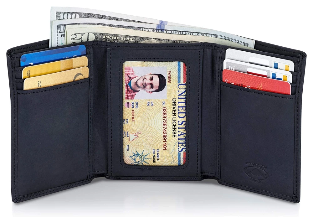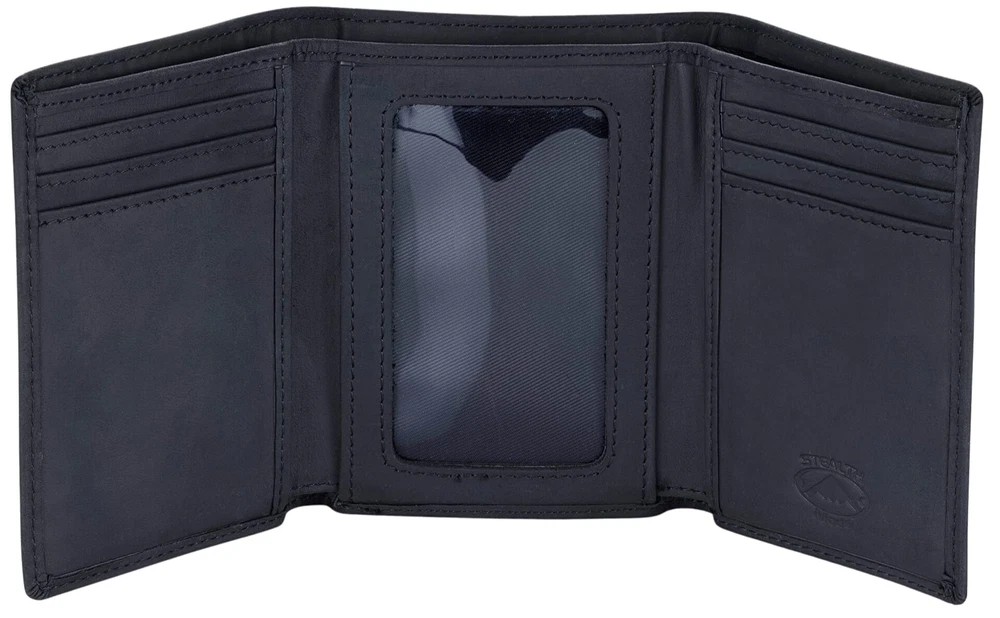 Enjoy style and safety together with 's men's leather trifold wallet. This men's leather trifold wallet features quality napa leather, 9 card slots and an ID window, divided billfold, and our secure RFID blocking lining to keep your personal and financial info safe. Measuring 3.25" x 4.25" when closed and 9.25" x 4.25" when open this large men's wallet has 9 card slots that can comfortably fit 12+ cards. It also includes a divided billfold to keep your money and receipts organized. The RFID blocking lining helps keep your personal and financial info safe by blocking malicious attempts to steal your identity from your chip enable cards. Our lining blocks high frequency (13.56 MHz) RFID signals. Packaged in a handsome box, this stealth wallet makes a great gift for men.