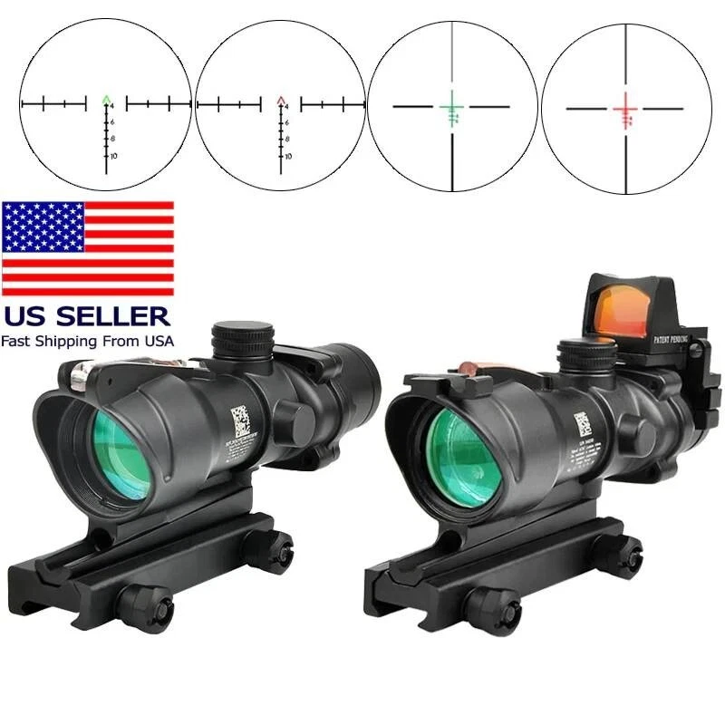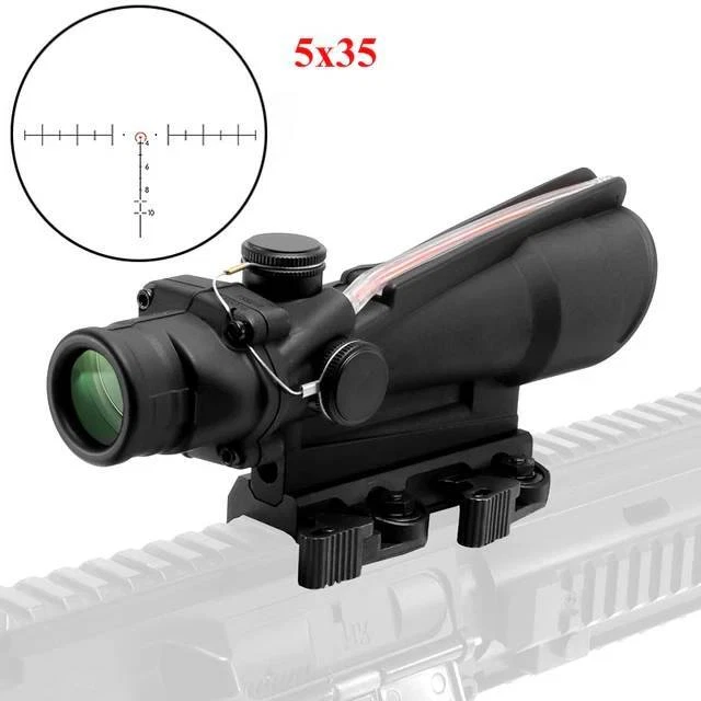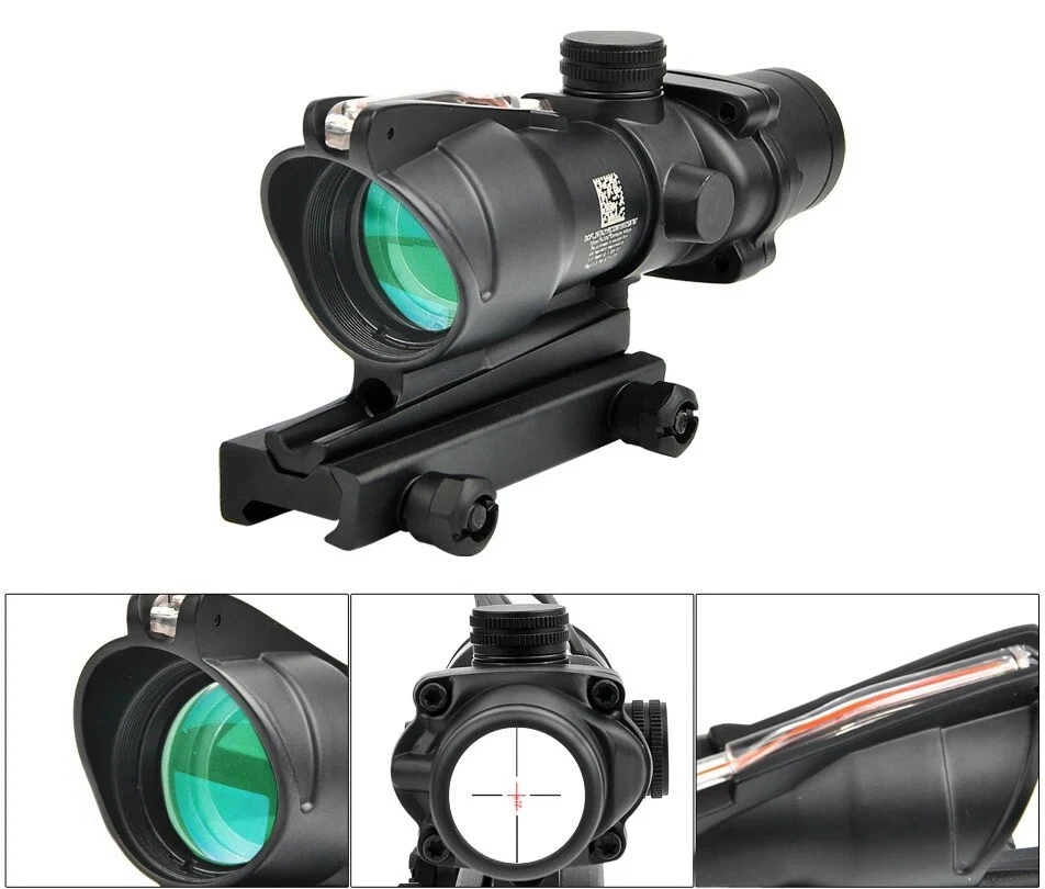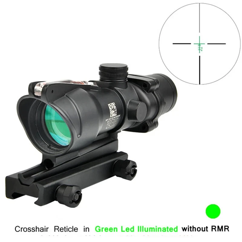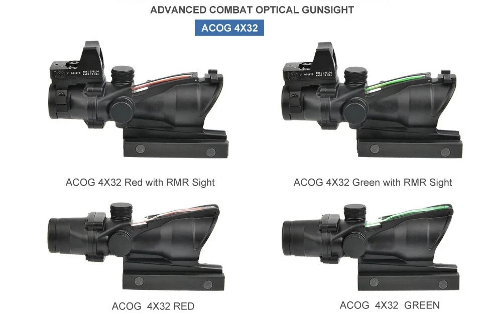 FAST N FREE U.S SHIPPING *COMES WITH LOGO* For Airsoft, Paintball, or Filming Purposes only. Ignoring this warning and damaging the product by not using it for it's intended purposes will void you of any returns. Acog Clone 4x32/5x32 RMR Scope Reticle Sight Red Or Green Fiber Optic Description: Enhance your precision with the 4x32 and 5x35 Tactical ACOG Rifle Scope. Its adaptable yet straight-forward design ensures consistent performance across diverse scenarios. With a field of view of 33 feet at 100 yards, you can maintain situational awareness while aiming. The scope's red reticle, illuminated by light-absorbing fiber optics, ensures clear visibility in both bright and low-light conditions. Its parallax-free design and adjustable windage and elevation dials enable precise targeting over long distances. Crafted from aircraft-grade lightweight aluminum alloy and featuring a multi-coated lens, our tactical rifle scope guarantees durability and clarity. Rigorous testing ensures its reliability in combat conditions. Compatible with any 0.8" (20mm) Picatinny and Weaver rail, installation is hassle-free, allowing you to mount this scope on all your preferred firearms. Key Features: - High Performance: Fixed 4X magnification with a 32mm objective lens and 5X magnification with a 35mm objective lens to ensure quick and accurate target acquisition while maintaining awareness. - Fiber Optic Reticle: Red fiber optic illuminates the reticle without batteries, adjusting brightness based on ambient light. - Long-Range Precision: Adjustable windage, elevation, and parallax dials enable precise zeroing for confident shooting. - Close-Quarter Combat: Can be used like a red dot sight, allowing for both eyes open aiming. - Durable Construction: Aircraft-grade aluminum alloy construction passes military drop tests and withstands harsh conditions. - Extreme Conditions: Tested for operation in extreme temperatures with a fog-resistant housing. - Outstanding Clarity: Multi-coated lens ensures crisp views of targets. - Versatile Compatibility: Easy installation on any 0.8" (20mm) Picatinny and Weaver rail for use with various firearms.