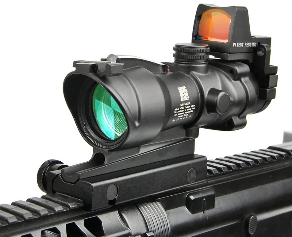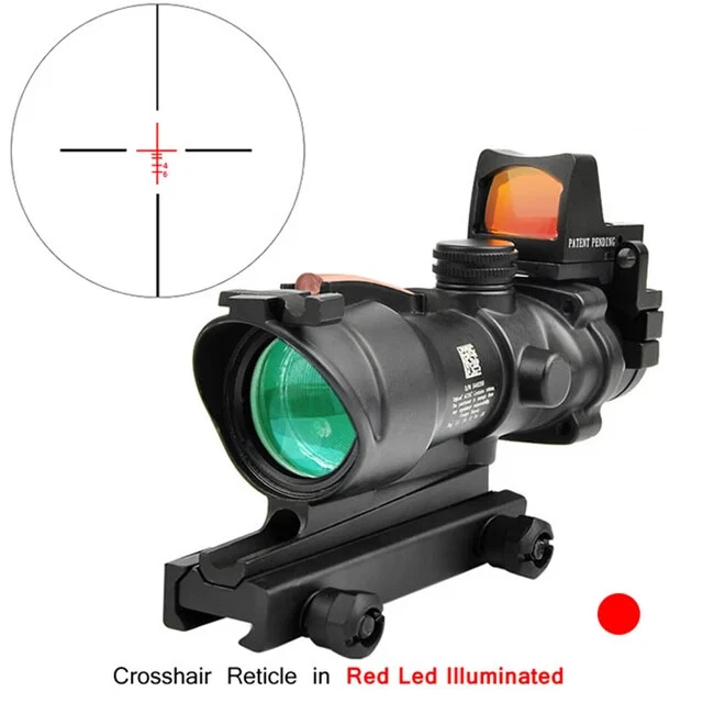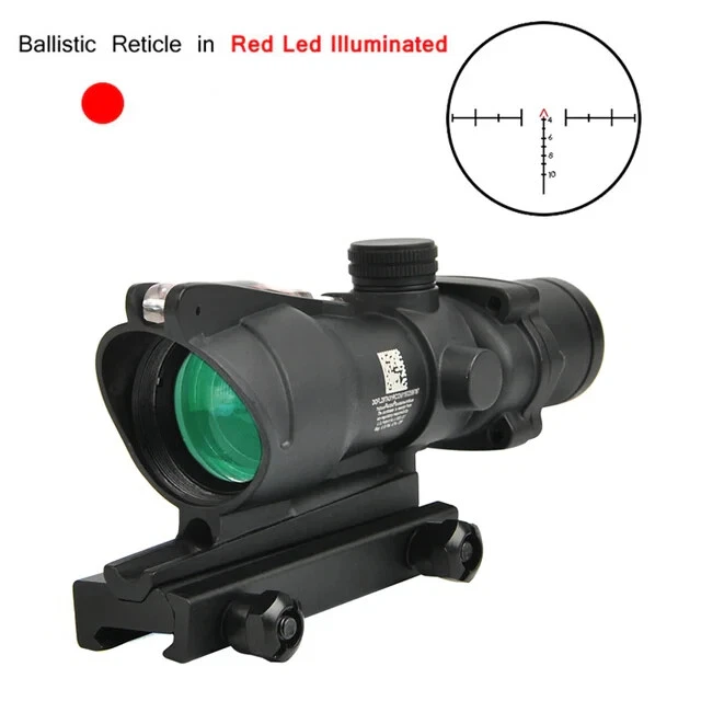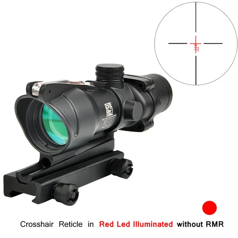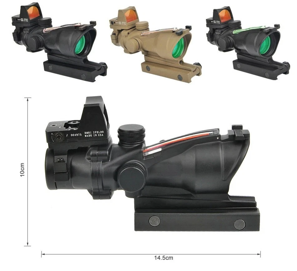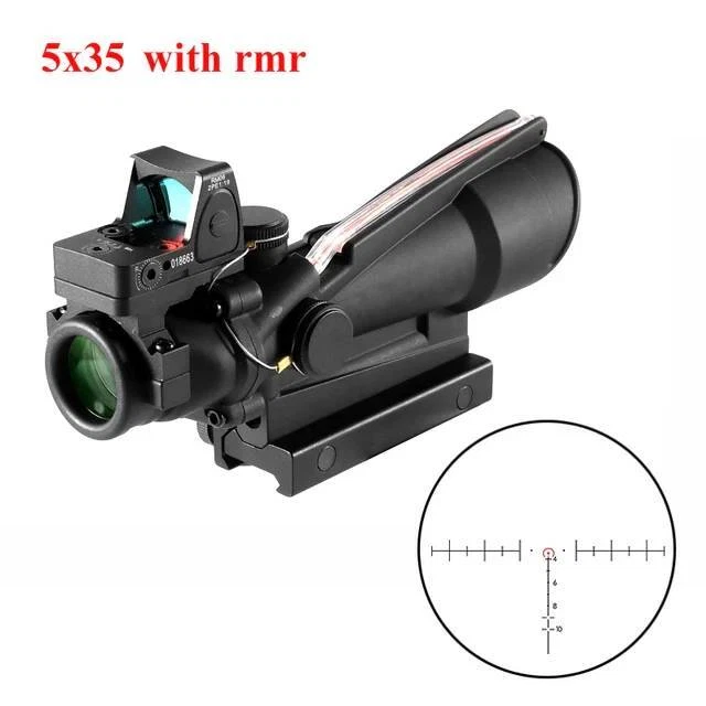 FAST N FREE U.S SHIPPING *COMES WITH LOGO* For Airsoft, Paintball, or Filming Purposes only. Ignoring this warning and damaging the product by not using it for it's intended purposes will void you of any returns. Acog Clone 4x32/5x32 RMR Scope Reticle Sight Red Or Green Fiber Optic Description: Enhance your precision with the 4x32 and 5x35 Tactical ACOG Rifle Scope. Its adaptable yet straight-forward design ensures consistent performance across diverse scenarios. With a field of view of 33 feet at 100 yards, you can maintain situational awareness while aiming. The scope's red reticle, illuminated by light-absorbing fiber optics, ensures clear visibility in both bright and low-light conditions. Its parallax-free design and adjustable windage and elevation dials enable precise targeting over long distances. Crafted from aircraft-grade lightweight aluminum alloy and featuring a multi-coated lens, our tactical rifle scope guarantees durability and clarity. Rigorous testing ensures its reliability in combat conditions. Compatible with any 0.8" (20mm) Picatinny and Weaver rail, installation is hassle-free, allowing you to mount this scope on all your preferred firearms. Key Features: - High Performance: Fixed 4X magnification with a 32mm objective lens and 5X magnification with a 35mm objective lens to ensure quick and accurate target acquisition while maintaining awareness. - Fiber Optic Reticle: Red fiber optic illuminates the reticle without batteries, adjusting brightness based on ambient light. - Long-Range Precision: Adjustable windage, elevation, and parallax dials enable precise zeroing for confident shooting. - Close-Quarter Combat: Can be used like a red dot sight, allowing for both eyes open aiming. - Durable Construction: Aircraft-grade aluminum alloy construction passes military drop tests and withstands harsh conditions. - Extreme Conditions: Tested for operation in extreme temperatures with a fog-resistant housing. - Outstanding Clarity: Multi-coated lens ensures crisp views of targets. - Versatile Compatibility: Easy installation on any 0.8" (20mm) Picatinny and Weaver rail for use with various firearms.