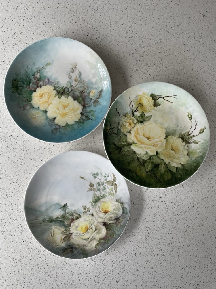 A set of 3 hand painted signed decorative wall plates. Hand painted by Joan North. 1982. Perfect condition. 2 are exactly the same size at 10.5 inches, the third is slightly smaller and shallower at 10.3 inches and is unsigned but bought at the same time as the other plates.