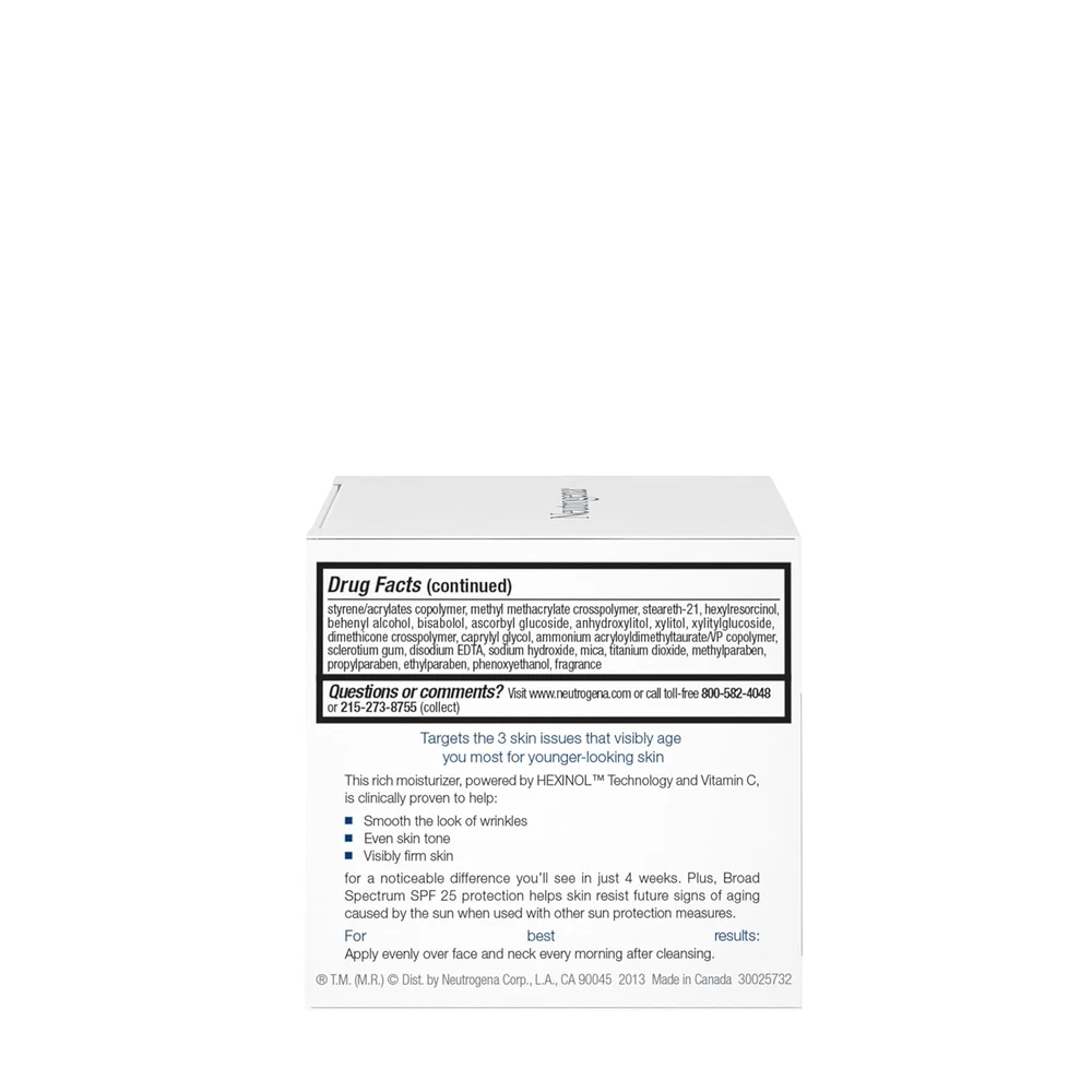 1.7-ounce jar of Neutrogena Triple Age Repair Face Moisturizer Cream with SPF 25 sunscreen, shea butter & glycerin deeply moisturizes and targets three common skin issues that age you the most--wrinkles, uneven tone & firmness Our anti-aging daily facial moisturizer is clinically proven to help smooth the look of wrinkles, even skin tone, and visibly firm skin for a difference you can see in just as little as 4 weeks, revealing smoother and younger-looking skin The anti-wrinkle cream formula contains powerful Hexinol technology to help boost skin's ability to improve its appearance and vitamin C to help gently fade the look of dark spots while evening out skin tone to help fight the signs of skin aging This anti-aging face & neck cream with sunscreen helps protect skin from sun damage, and is formulated with broad spectrum UVA/UVB SPF 25 sunscreen to help prevent the signs of premature skin aging caused by the sun Suitable for a daily skincare routine, it turns at-home hydration of dry skin into a self-care experience. For best results, apply the daily facial moisturizer every morning after cleansing At Neutrogena, We're Not Anti-Aging, We're Anti-Wrinkles Use Neutrogena Triple Age Repair Daily Facial Moisturizer Cream with SPF 25 Sunscreen to tackle wrinkles, uneven tone and loss of skin resilience. Our anti-aging face moisturizer targets the three skin issues that age you the most for a difference you can see in just four weeks. Made with vitamin C, shea butter and glycerin, this daily anti-wrinkle cream features Hexinol technology and is clinically proven to help smooth the look of wrinkles, even skin tone, reduce the appearance of dark spots, and visibly firm skin. The anti-aging formula of this neck and face cream also contains broad spectrum SPF 25 sunscreen protection against UVA & UVB rays to help prevent the premature signs of skin aging caused by the sun. Apply this anti-wrinkle moisturizer evenly over face and neck every morning after cleansing for best results. Suitable for everyday use in a regular skincare routine, this wrinkle cream turns at-home hydration of dry skin into a self-care experience.