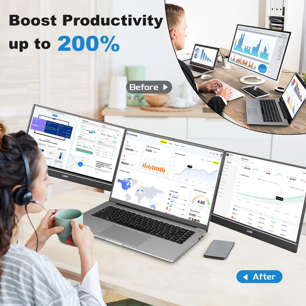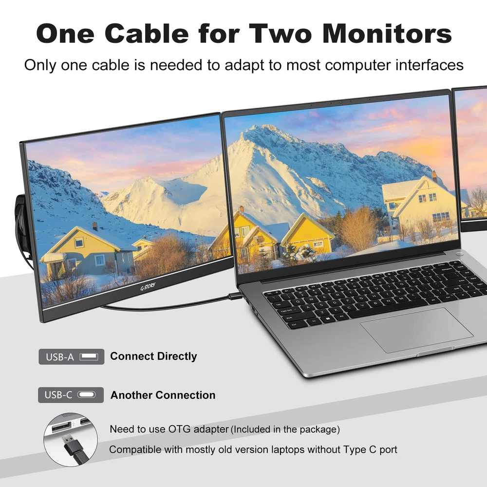 [14-inch Dual Screen for Laptop] laptop screen extender offers a 1920x1080 resolution and 72% NTSC color gamut, providing a bright and high-quality viewing experience. This monitor extender allows for independent backlight brightness adjustment, ensuring friendly eye protection and reducing fatigue. [Widely Compatible] The triple laptop screen extender fits 13"-17.3" laptops. Compatible with Windows (support 7/10 v1607 and above/11), Mac ( support M1/M2 chips, need to install the driver). If you are not sure whether your laptop is compatible, you can get in touch with us to provide you with a solution and we will reply within 24 hours. [Triple Screen Laptop Monitor Extender] This portable laptop screen extender helps you multitask effectively by opening multiple applications simultaneously. It is perfect for home offices, remote workers, frequent travelers, online meetings, IT professionals, gamers, and more. By attaching dual extended screens to your laptop, you can enhance your productivity by up to 300%. [Perfect for Travel] Upgraded travel monitor for laptop 2 screens comes with a foldable stand and portable bag. Use the adjustable kickstand to find your favorite angle for working, playing games, or watching movies. With a single cable connection, you can say goodbye to multiple data cables and messy workstations. [Important Information Before Purchase] 1. For macOS, please use the provided USB disk drive to install the driver. Windows systems typically install the driver automatically. 2. If you experience issues such as only one screen displaying, screen flickering, or a black screen, it may be due to insufficient power from the laptop. Please connect an additional power source for the screen.