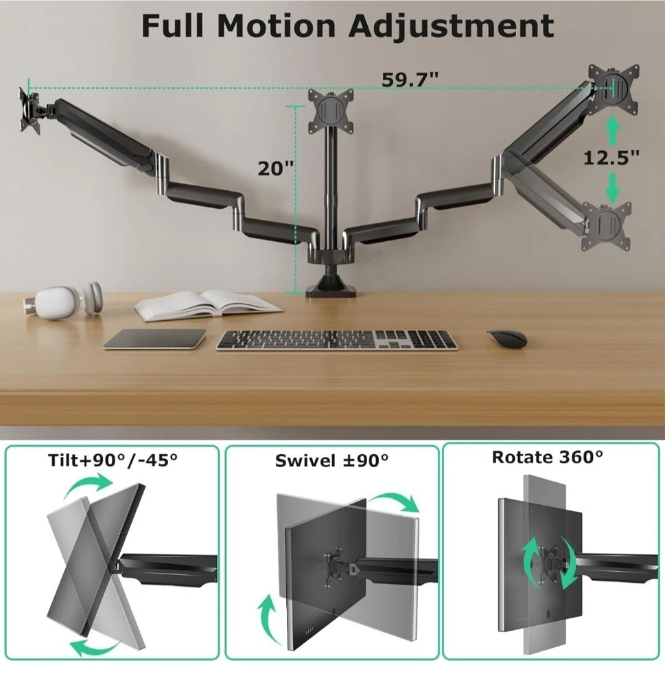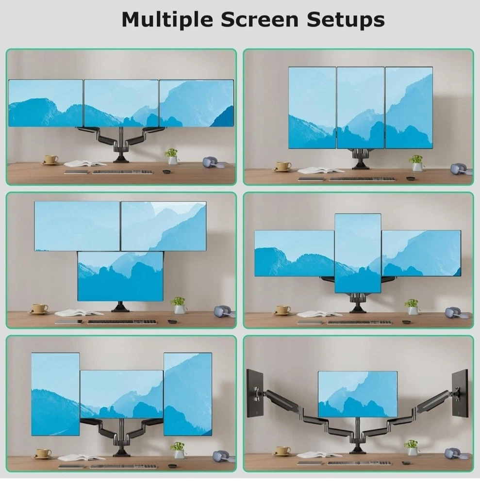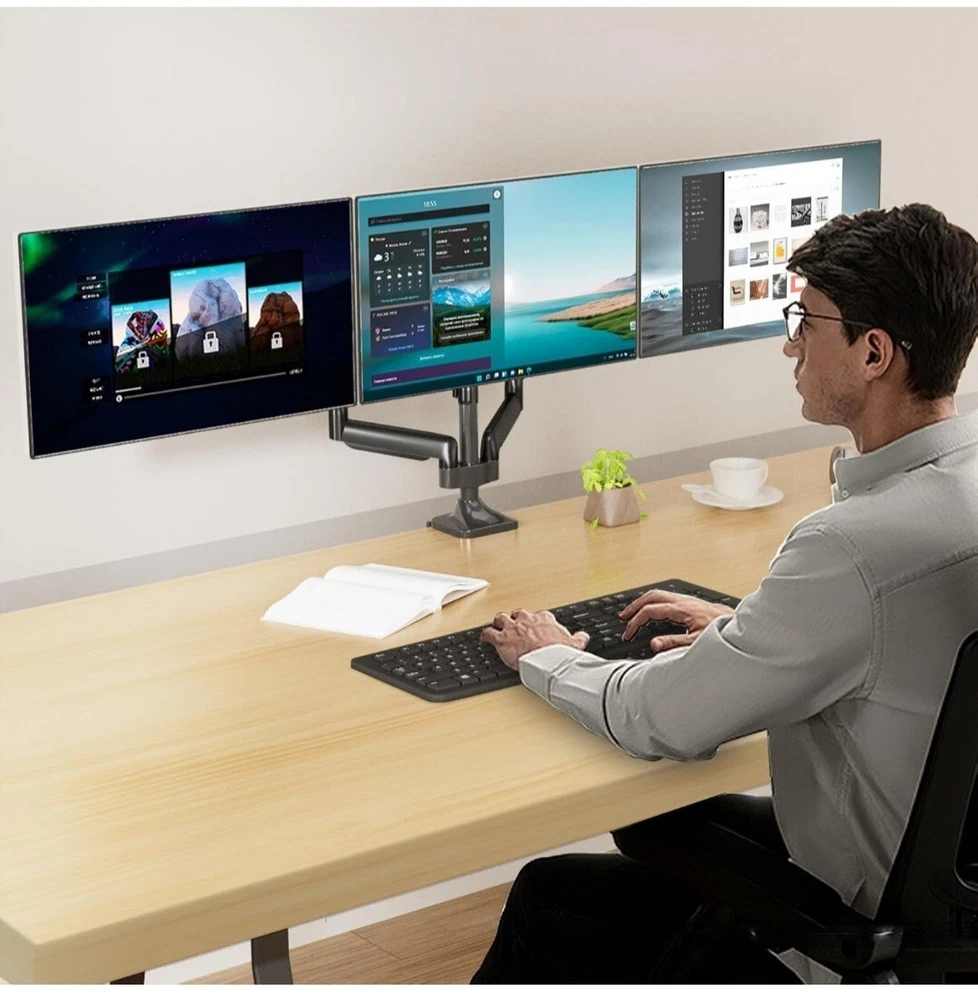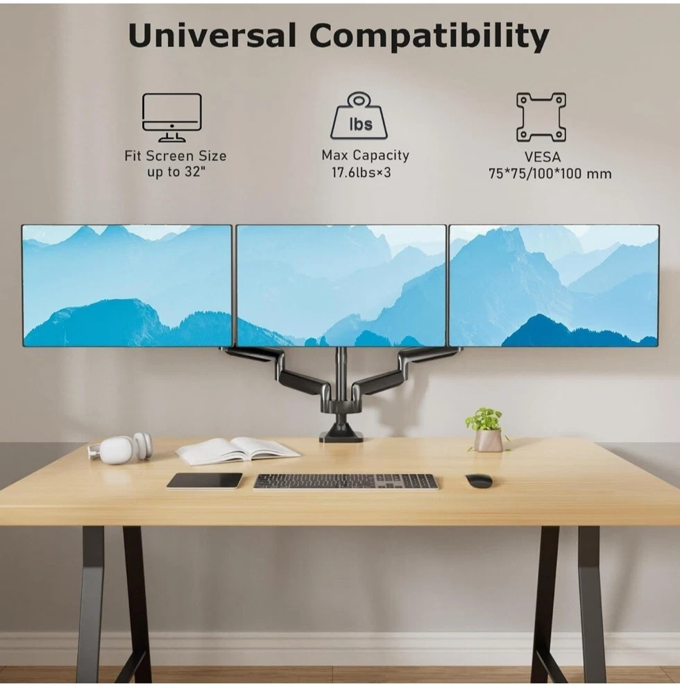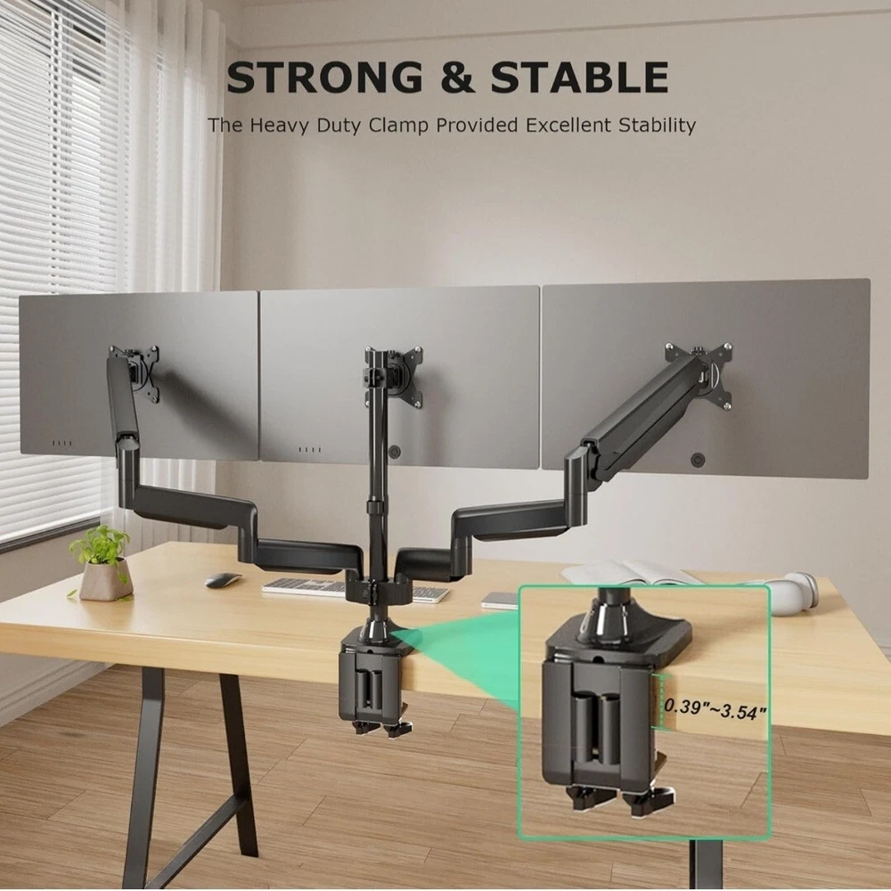 Mounting Type Tabletop Mount Movement Type Articulating Brand HIPPOFLEX Material Metal Maximum Compatible Size 32 Inches Color Black Minimum Compatible Size 13 Inches Compatible Devices Monitor Maximum Tilt Angle 90 Degrees Manufacturer HIPPOFLEX See more About this item 【Universal Compatibility】The triple monitor stand is perfectly suited for most flat or curved computers whitch size is 17-32 inches.Each arm holds up to 30.9lbs, compatible with VESA patterns 75x75mm and 100x100mm. If there are no VESA holes in the back of your monitor, a VESA adapter is needed. 【Desk Space Saver】The triple monitor stand mount get 3 monitors off your desk and help you get a lot of desktop space. Integrated cable management system keeps your power and AV cords organized. Just enjoy your time working, playing or watching in a clean and comfortable environment. 【Built to Last】The triple monitor desk stand is made of upgraded steel and premium gas spring arm that has been tested to withstand 25,000 lift cycles to ensure long-lasting performance. 【Heavy Duty C-clamp】The 3 monitor stand supports C-clamp. The C-clamp (drill-free) fits desktop thickness 0.39 "-3.35".3-year warranty is provided for choosing Us! Our responsive customer support team is available to solve any problem you may have during normal business hours. 【Easy Installation】The triple monitor mount comes with all mounting hardware, tools, and instructions necessary for assembly. The setup can be completed in 15 min or less. Our friendly and responsive customer support team is available. Feel free to contact us if you experience any issues after receiving your package. Product information Technical Details Brand Name HIPPOFLEX Item Weight 19.49 pounds Package Dimensions 17.4 x 13.54 x 6.73 inches Country of Origin China Item model number HIPPOFLEX-TMM-32-HD-CCL-V75100 Color Name Black Special Features Adjustable