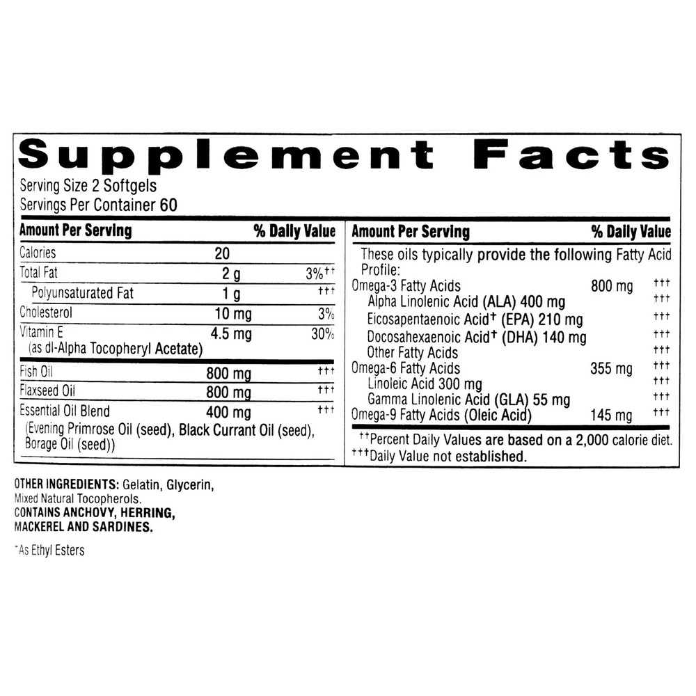 About this item Product details Our Spring Valley Triple Omega, Fish, Flax, and Borage Oil Softgels are a dietary supplement formulated to support heart health. Fish, flax, and borage oils are sources of Omega-3, 6, and 9 fatty acids, and support heart, joint, and skin health. These softgels are also formulated with NO gluten, yeast, wheat, milk or milk derivatives, lactose, sugar, artificial preservatives, artificial color, or artificial flavor, so you can feel good about the help you're giving yourself. You can rest assured that Spring Valley Triple Omega, Fish, Flax, and Borage Oil Softgels are produced with strict quality guidelines and are backed by a quality guarantee, making them a smart choice for your dietary supplement needs. Spring Valley understands living a healthy, balanced lifestyle is the key to being your best self. With an affordable range of products inspired by nature, Spring Valley supports your and your family's health and holistic wellbeing. Ingredients Ingredients Fish Oil, Flaxseed Oil, Essential Oil Blend, Omega-3 Fatty Acids, Omega-6 Fatty Acids, Omega-9 Fatty Acids, Gelatin(Bovine), Glycerin, Purified Water, Mixed Tocopherols Warnings Warning Text Consult a healthcare procider before use if you are pregnant, nursing, taking any medications, including blood thinners, planning any medical or surgical procedure or have any medical condition. Discontinue use and consult your doctor if any adverse reactions occur.